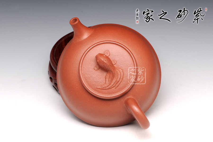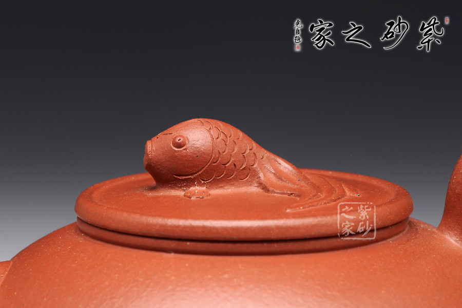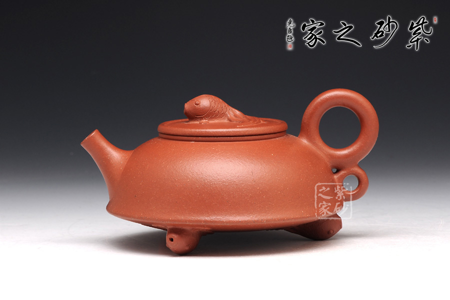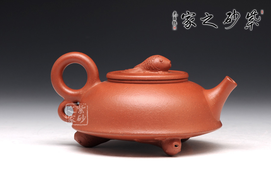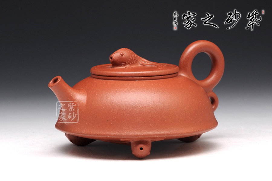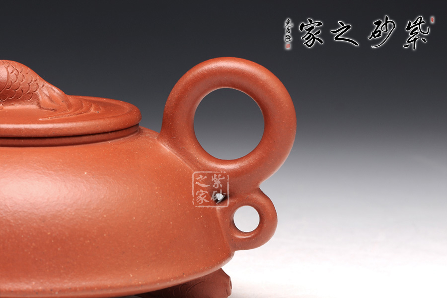 壺設(shè)計的造型新穎,趣味性頗強,而扁圓的壺身恰似一滴水珠,波光粼粼烘托著壺蓋。壺蓋為平蓋的設(shè)計,與壺鈕好似連為一體,設(shè)計成了金魚般的模樣,活靈活現(xiàn),怡然自得。而壺嘴弧度恰如其分,出水爽快且不涎水。壺把處的造型好似出水的氣泡,大小相宜,拿捏舒適。不得不提的是,壺足為三足鼎力,但壺足的造型為三條瀟灑的小金魚,承載著整把壺,與壺鈕一上一下呼應(yīng),趣味橫生。