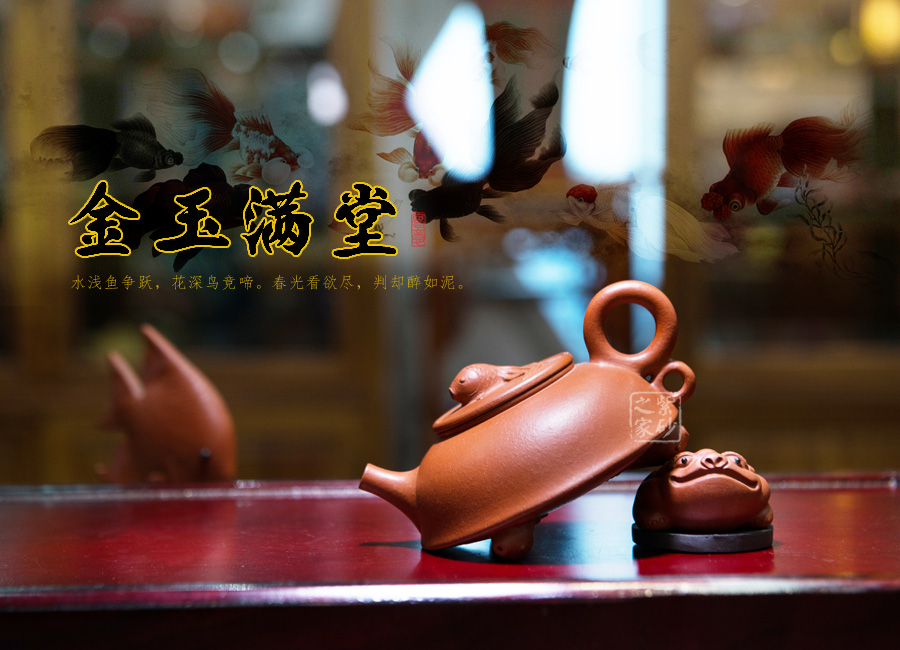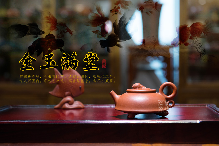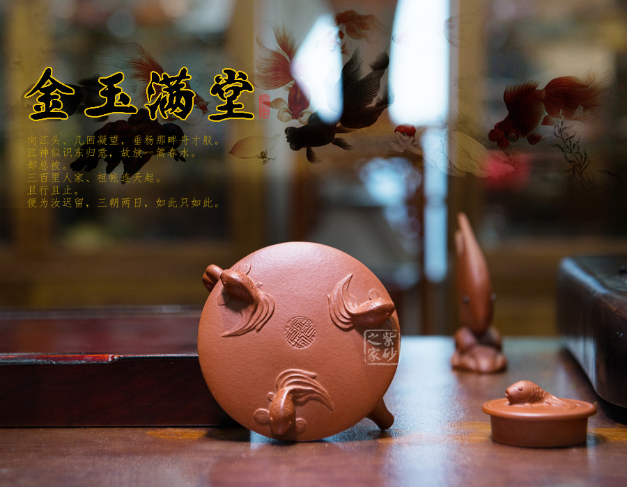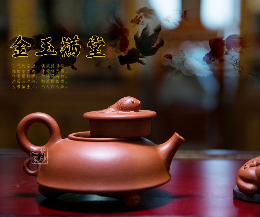 此壺名為“金玉滿堂”給人以富貴吉祥之感,巧取金魚滿塘之意,可謂妙哉也!