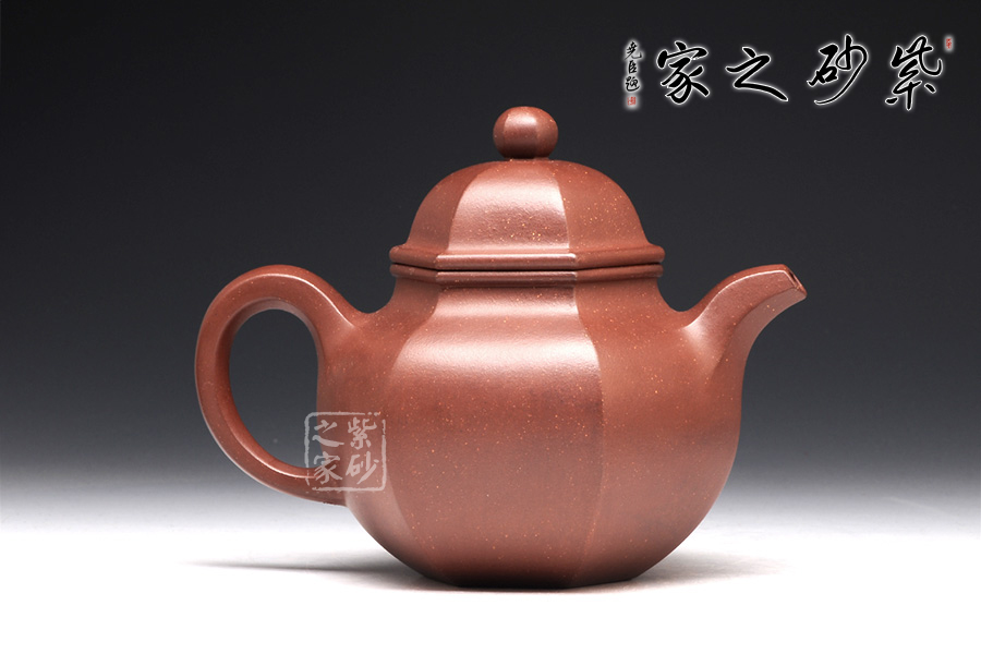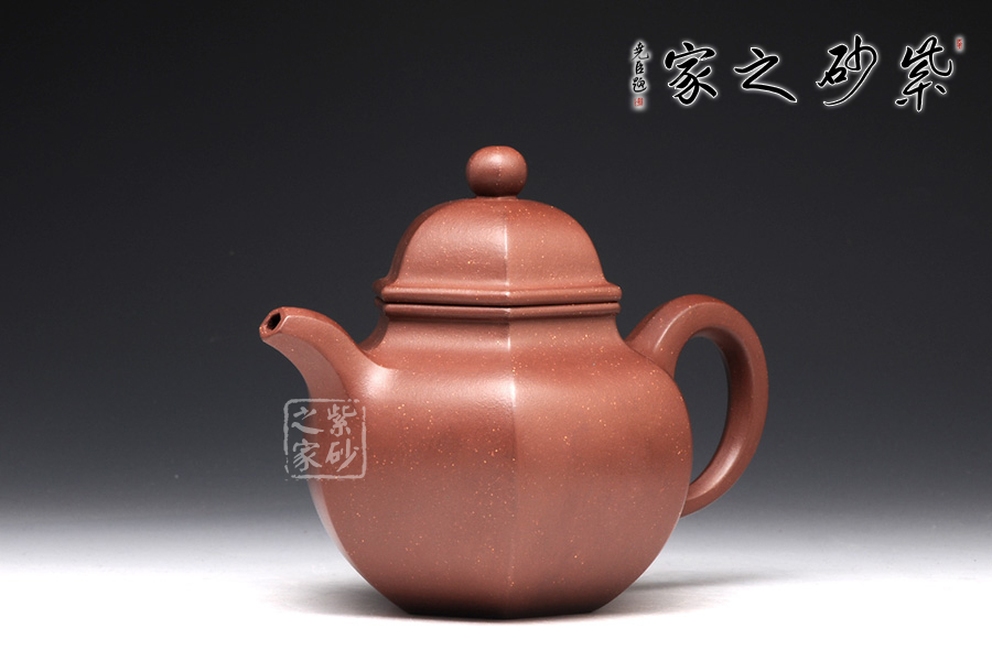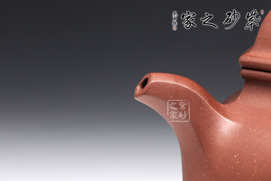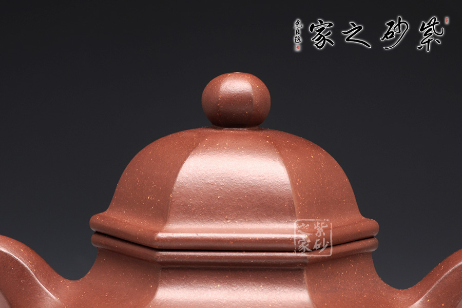 一款經(jīng)典的六方壺型,器型大方得體,穩(wěn)重而大方,于經(jīng)典之中見創(chuàng)新。此壺采用的是原礦紫泥,色調(diào)紅艷溫和,如美人玉面。身筒與壺蓋皆為混六方造型,身筒高矮適中,亭亭玉立,壺身線條流暢且剛直,彎曲有度,壺蓋無論往哪個(gè)方向轉(zhuǎn)度皆可與壺身相對應(yīng),同為混六方的嘴和把與壺身搭配自然,暗接相連,過度自然,二彎流壺嘴順暢利落,耳形端把粗細(xì)過渡十分別致,持握舒適稱手。六方壓蓋蓋面飽滿,一粒飽滿的壺鈕圓中帶方,整個(gè)作品無處不透漏著六方的效果。
