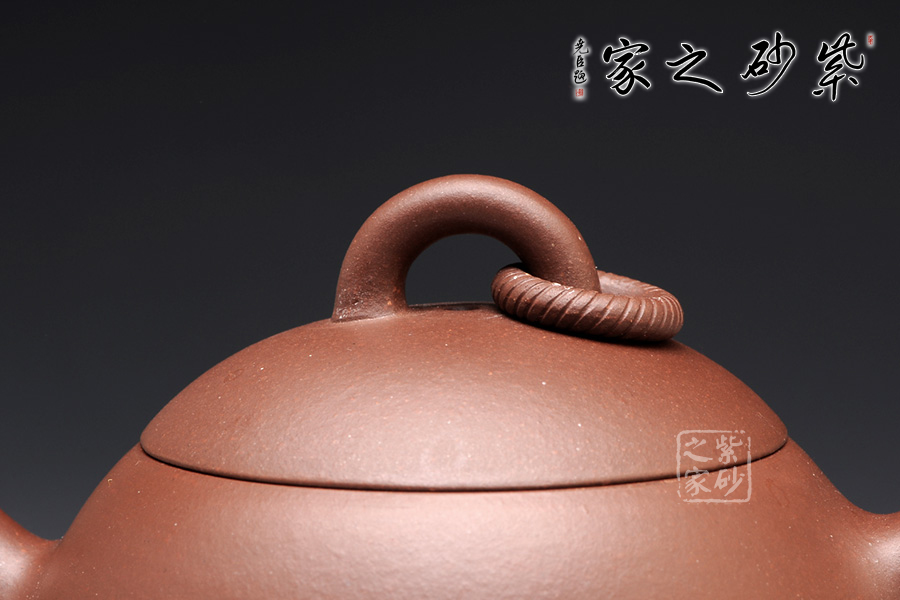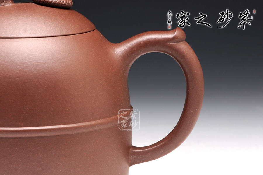 此壺古樸自然,韻味悠長。底槽清泥制秦鐘,色澤內(nèi)斂沉穩(wěn),與壺名相符。壺身以鐘型為基礎(chǔ),橢圓形狀,長而不妖,圓而不拙,做到了線條上的流暢和形體上的工整統(tǒng)一。壺嘴圓中有方,與壺身對比,是方圓結(jié)合。壺把簡潔工整,便于把玩,又可以欣賞。壺鈕上綴一圓環(huán),紋路古樸,似刀刻,更似古時鐵器。整把壺做到了方圓統(tǒng)一、粗細對比,古樸中有靈動,著實為一把難得的光貨。