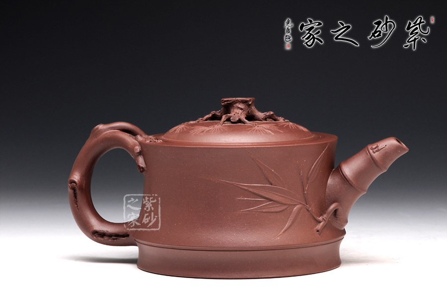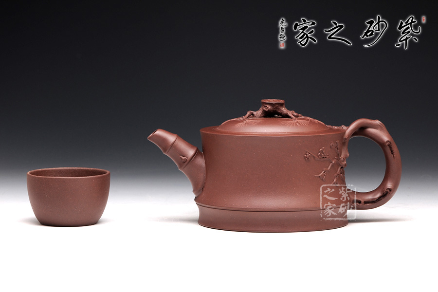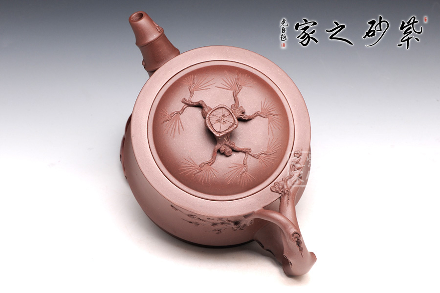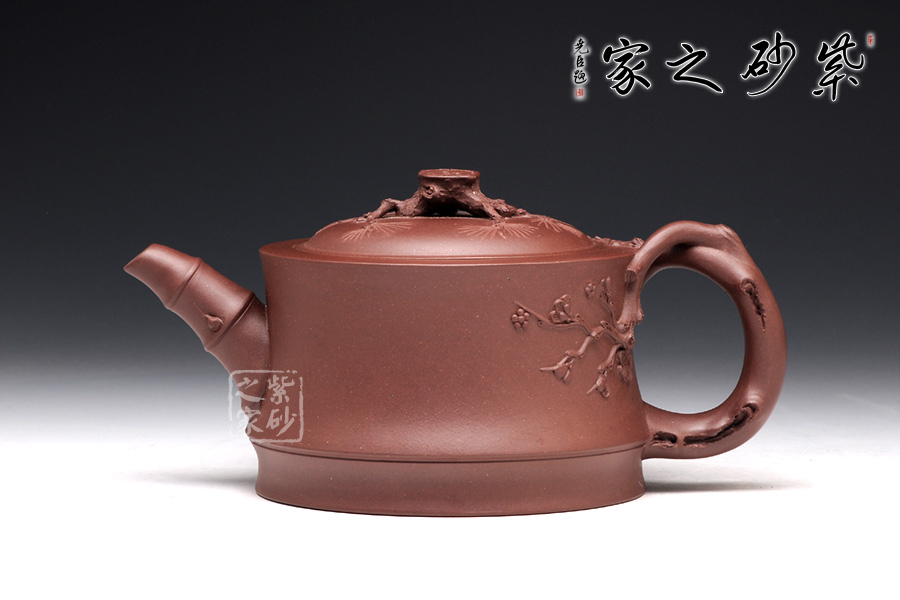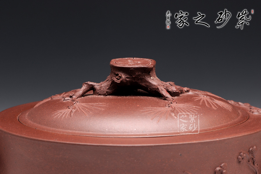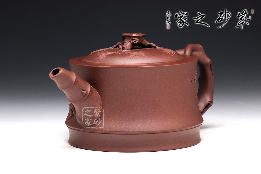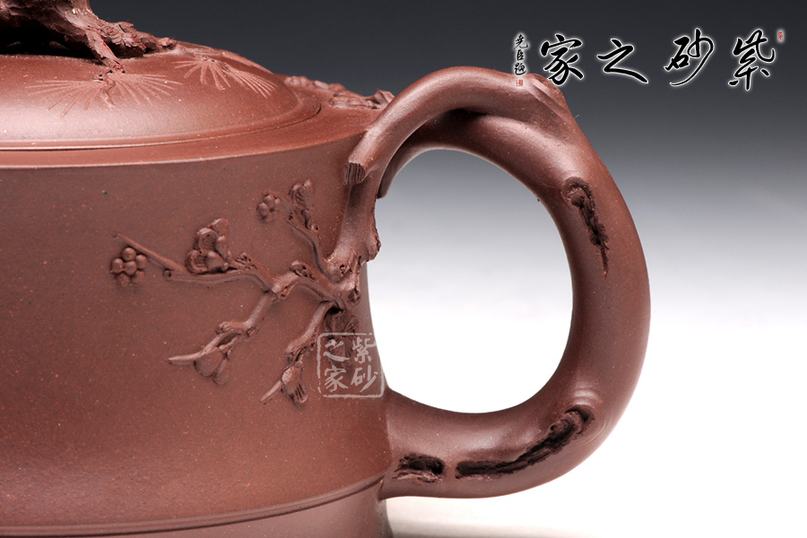 此款“松竹梅”形似竹段,但老師不但在細(xì)部做了些許改動(dòng),且配以美感十足的花貨,整器散發(fā)著吉祥、大氣的韻味;壺身扁圓,嵌蓋設(shè)計(jì),蓋面平整,完美貼合,氣密性良好,竹節(jié)和梅樁為壺鈕,從旁胥出的竹葉和梅花,靈動(dòng)而有生氣;飛把和壺嘴均以松樹枝干和竹為形,一半為竹一半為松,有一種舒心的隨意之感;器型周正,飽滿的曲線上延便是以竹節(jié)為造型的壺嘴,從壺蓋胥出的竹枝竹葉和梅花,將竹子的俊逸挺拔、梅花的傲骨之風(fēng)表露無遺。