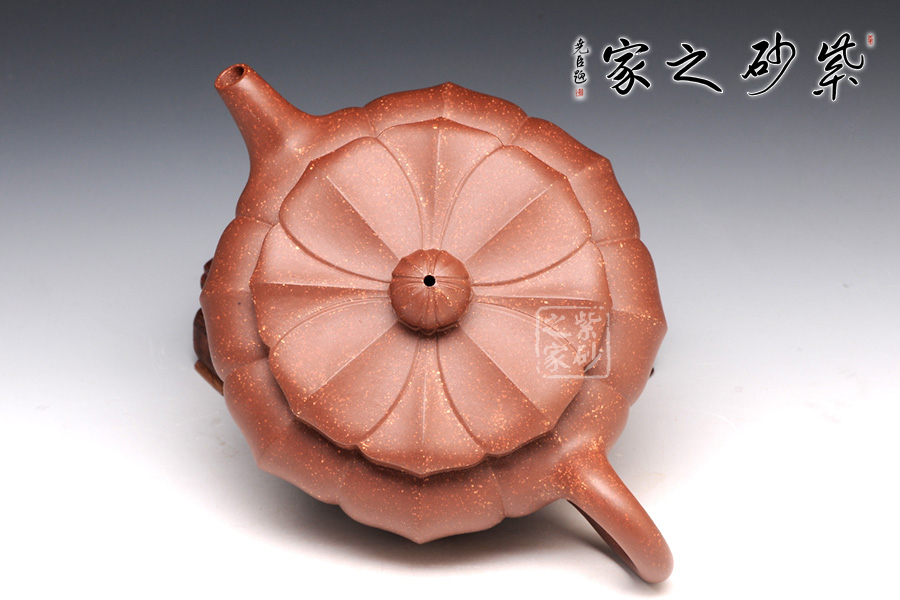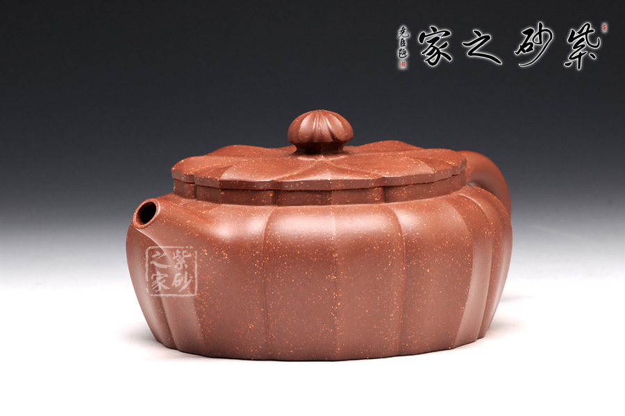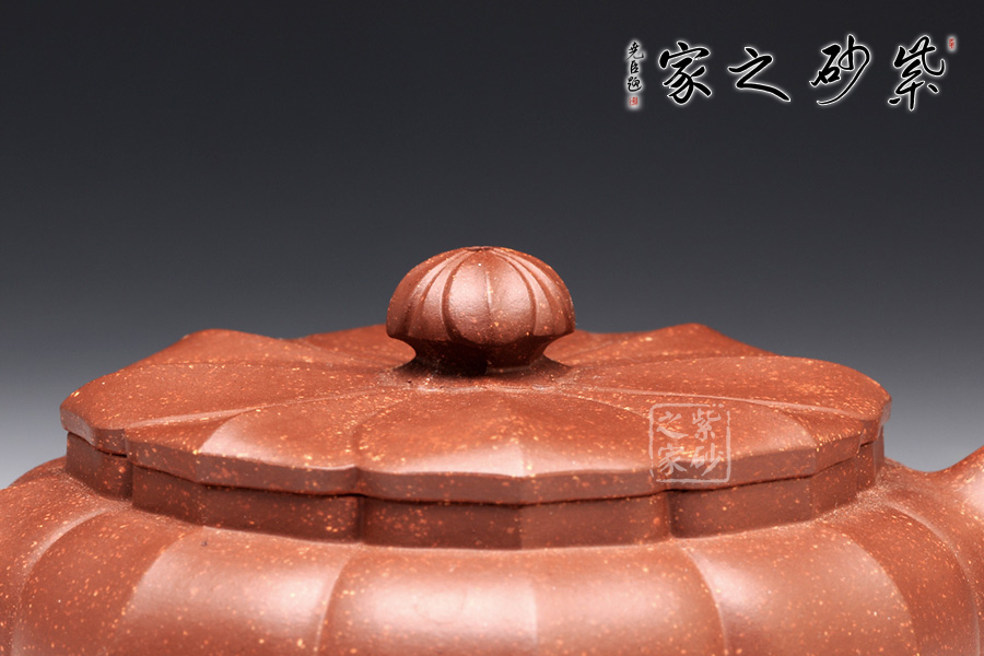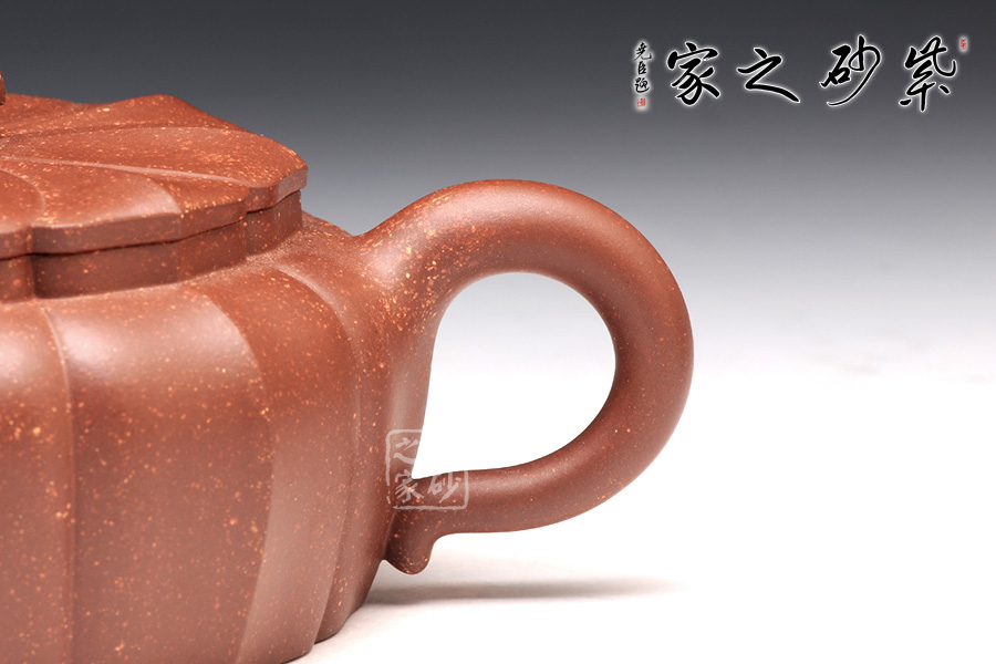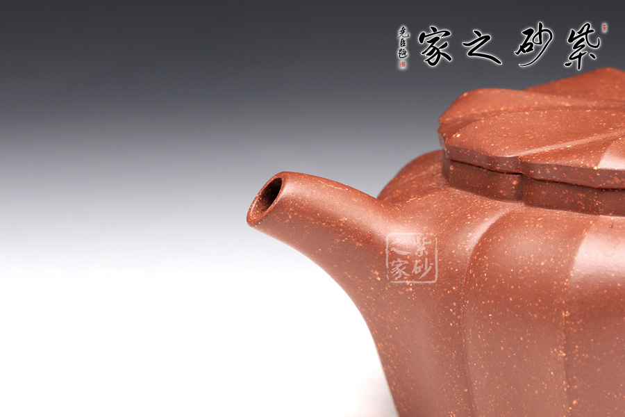 此壺材質(zhì)為名泥制作,色澤富貴嬌嫩,光澤明朗。壺體為菱花式造型,壺身略成扁圓狀,壺腹上部收斂,由鈕、蓋、口、身以至圈足皆貫以八棱,每一個(gè)瓣棱之間排列勻稱,飽滿,韻味濃郁,無生硬之處。線條明晰工整,轉(zhuǎn)折合度,筋囊飽滿圓潤,圓中見方、方中寓圓,無論整體或局部造型皆可見方中寓圓之意,有如天地方圓,和協(xié)統(tǒng)一。流短且直,把渾而圓,矮肩、蓋、身渾然一體,筋紋流暢,脈絡(luò)清新,直上而下弧線形漸寬,至底部又略收斂。此壺成型難度高,造型挺拔,制作精細(xì)規(guī)整,做工嚴(yán)謹(jǐn)。壺式古樸風(fēng)雅,不愧大家之作。