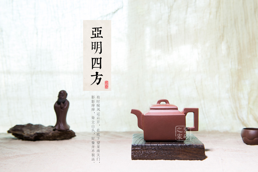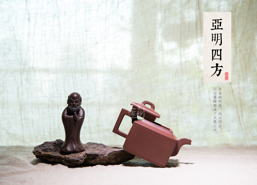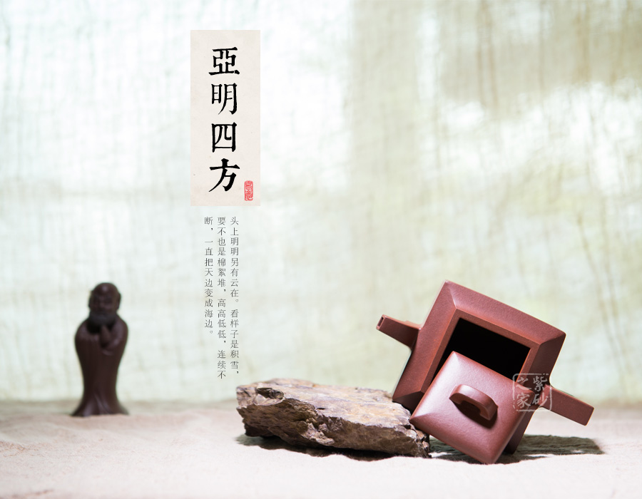 此款亞明四方整體造型比例協(xié)調,線面挺括有力,輪廓分明,全器氣勢挺拔;英姿颯爽,成就紫砂方器之美,同時演繹著光素器的獨特魅力。其實,亞明四方是方器中經(jīng)典的器型之一,是著名書畫家亞明先生所設計,故而稱之為“亞明四方”,作為方器中的經(jīng)典款,有著古樸典雅的造型,又有渾厚大氣的特點。