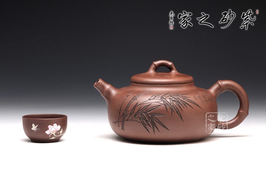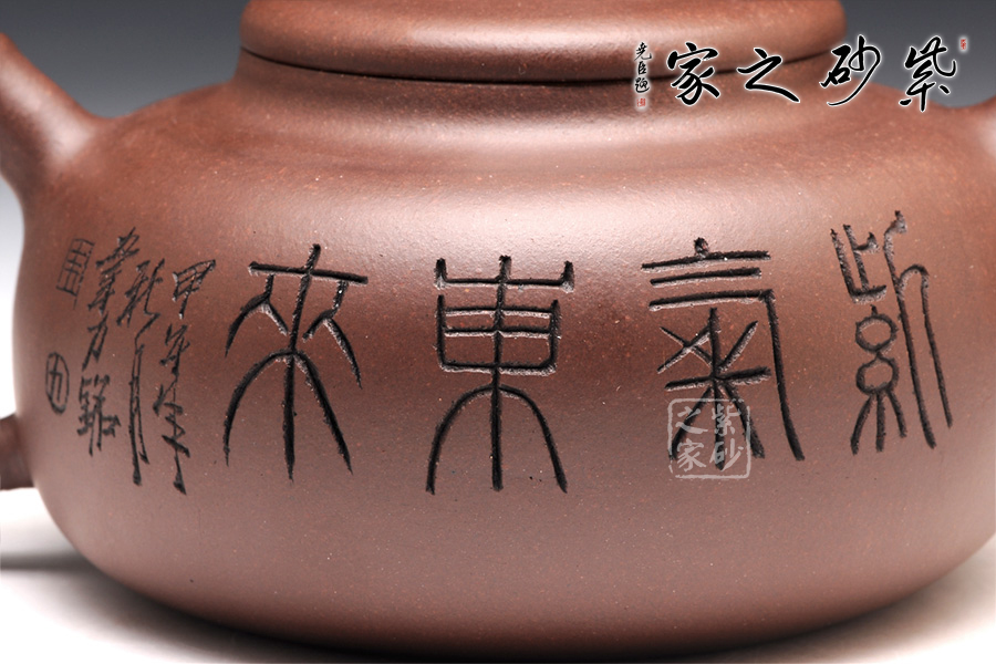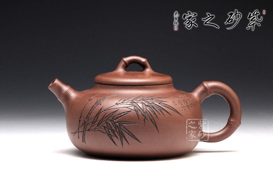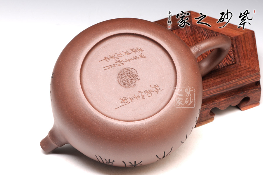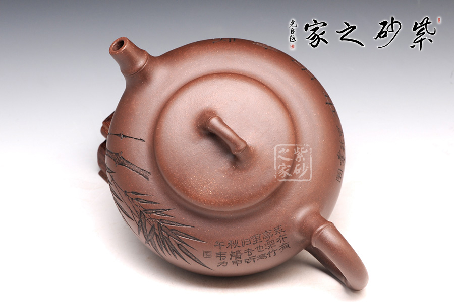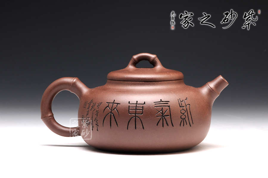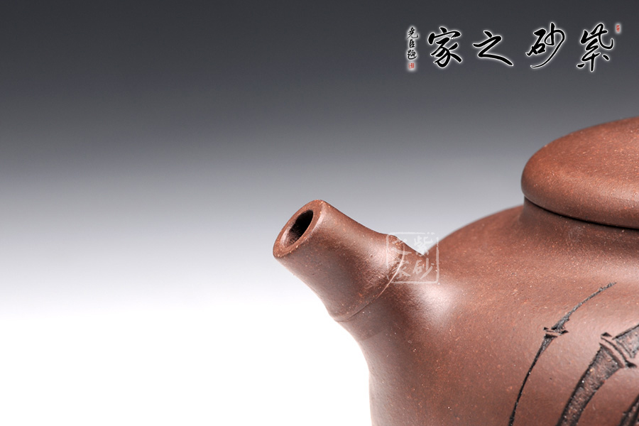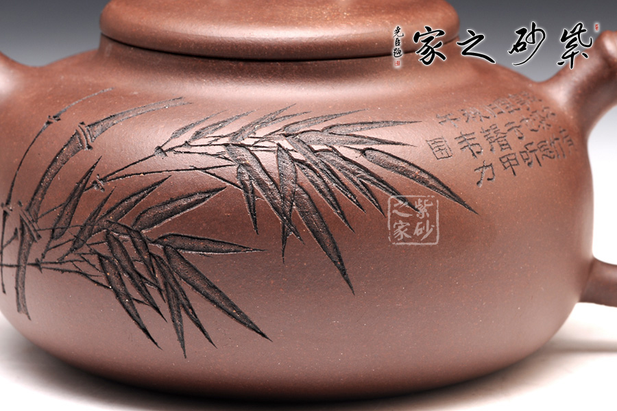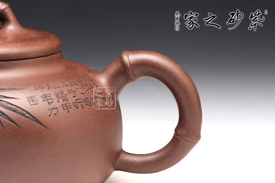 這是一款以“竹”為主題的作品,“竹”代表的是“祝福”的意思,寓意很好;壺身圓潤可愛, 加之原礦紫泥的色澤,醇和內(nèi)斂樸實(shí)無華,嘴、鈕、把均是竹節(jié)造型,竹節(jié)形橋形鈕蒼勁有力,平蓋踏實(shí)緊貼,嚴(yán)絲合縫,邊緣微微下沉,更見古拙老味,是一款氣密性極佳的好壺;這款壺壺身裝飾的竹葉并不是貼花的形式,而是采用了刻繪的形式,素刻的一枝竹葉蒼古、飄逸,靈秀之美呼之欲出;壺身正面篆刻的是“紫氣東來”四個(gè)字,寓意淺顯而美好,預(yù)示著祥瑞降臨;壺身極為飽滿,像是裝滿了福氣,沉甸甸的樣子。