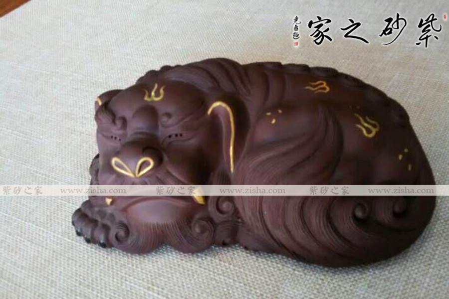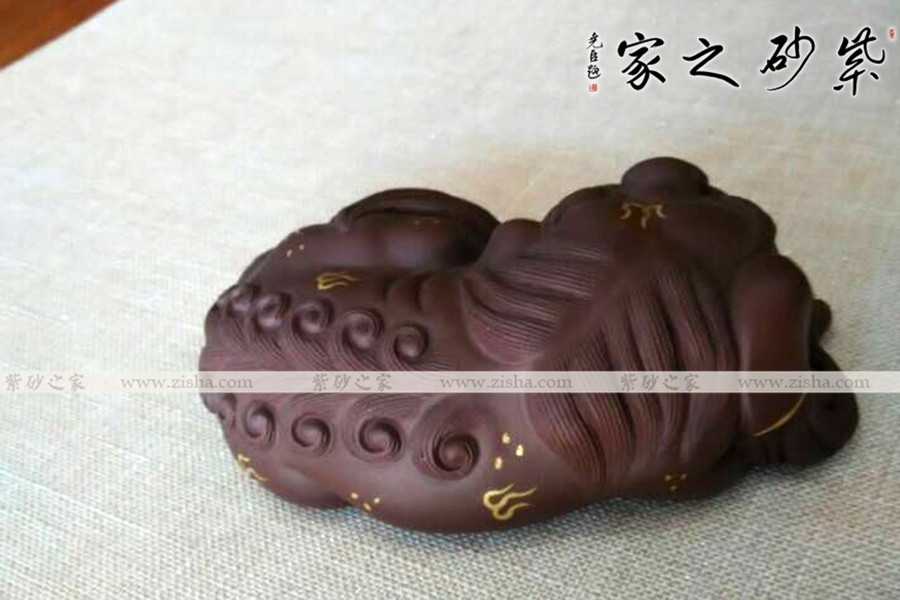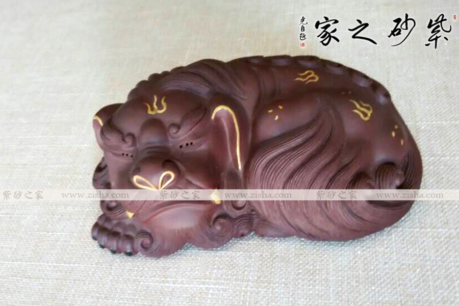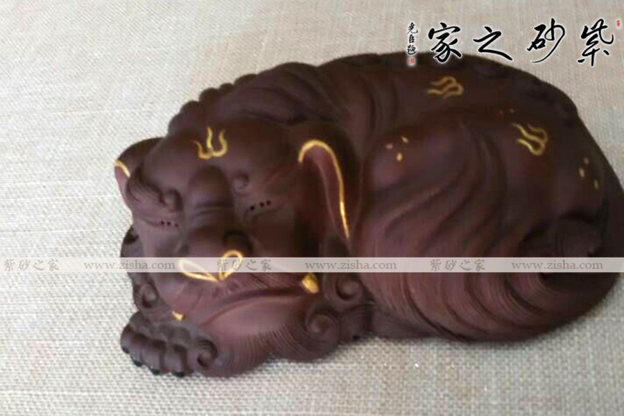 選用原礦紫砂泥手工制作而成,做工精致,形象生動(dòng),線(xiàn)條自然、有力,雖是趴著的造型,卻仍流露出一種威武的霸氣。描金裝飾華麗富貴,寓意更好。品茶時(shí)用茶水澆淋養(yǎng)之,質(zhì)感會(huì)日漸光潤(rùn)通透!