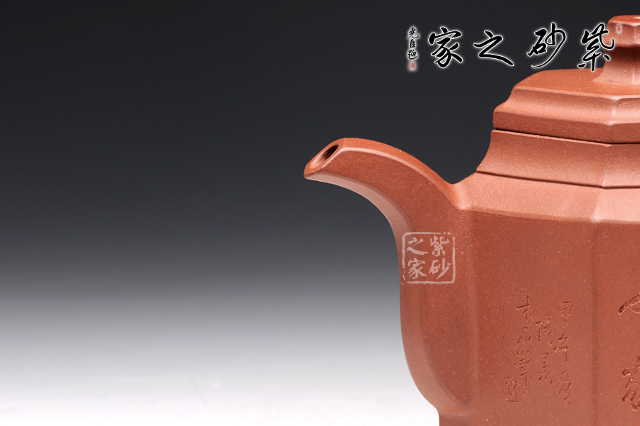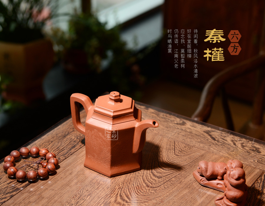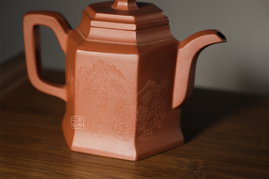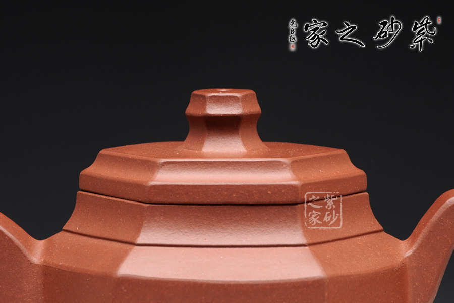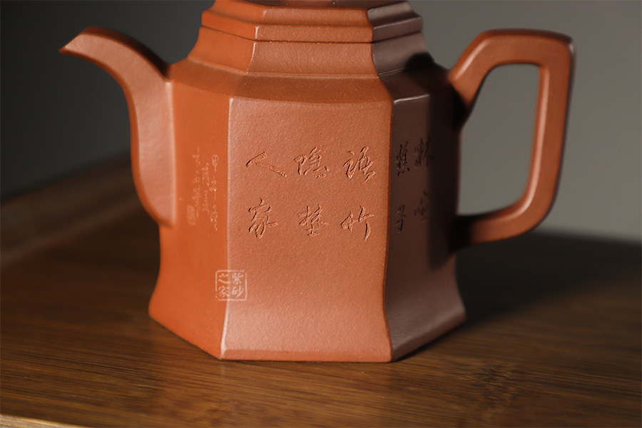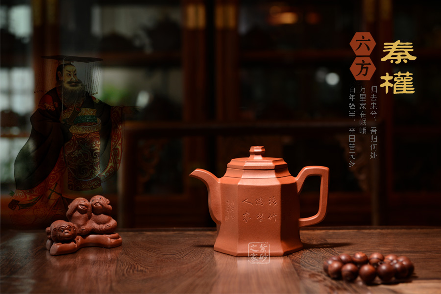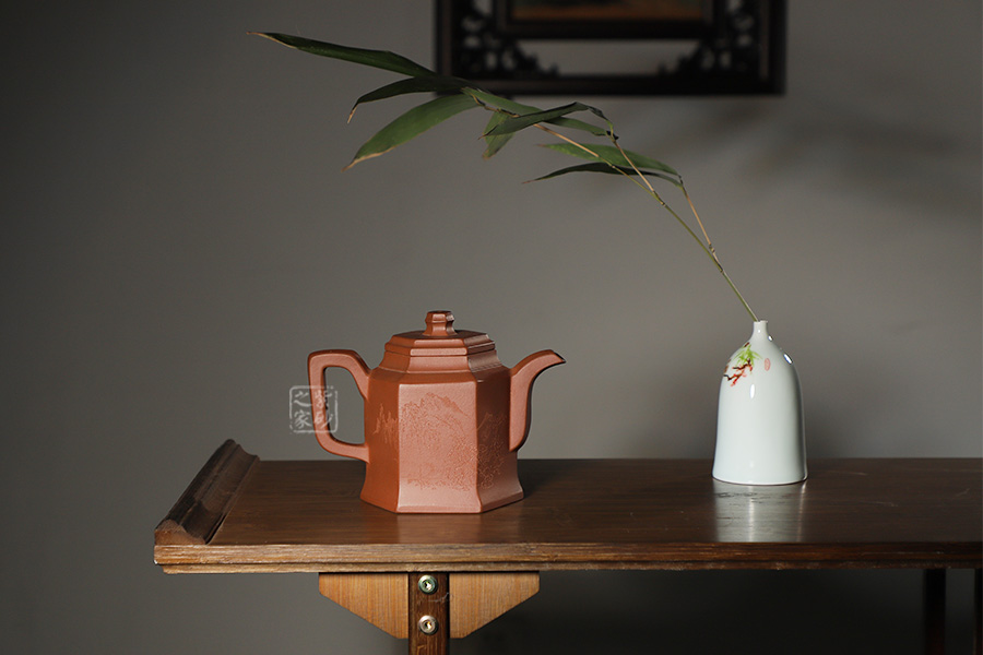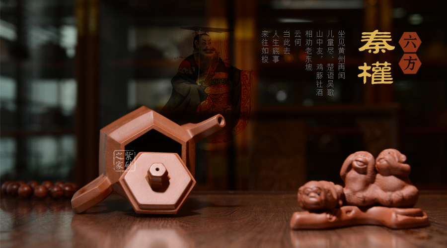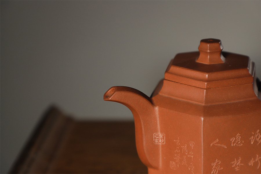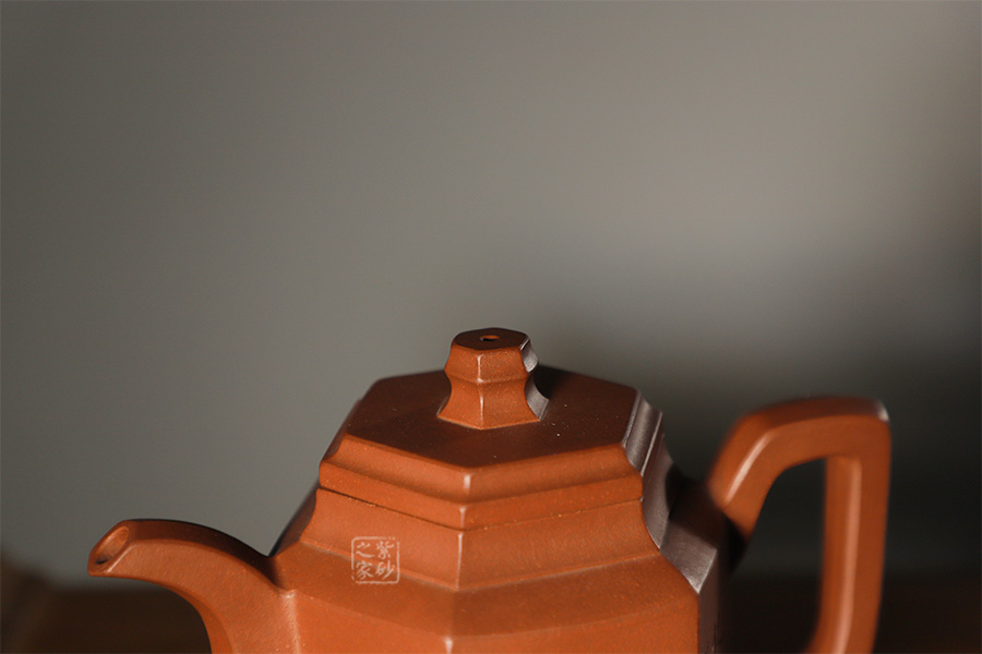 此壺根據(jù)傳統(tǒng)器型秦權(quán)改型創(chuàng)作而來,用方器形態(tài)展示秦權(quán)的另一種力量美,六方秦權(quán)壺線面挺括平正,輪廓線條分明,給予人們干凈利落,明快挺秀之感;壺身六面均勻調(diào)和,每一個面都平實(shí)、直挺,壺肩曲線過渡溫和;壺嘴、壺把、壺蓋及壺鈕皆為六方造型,銜接之處十分細(xì)膩,棱角從無到有的過渡令人驚嘆;此壺同時彰顯了作品不凡的技藝。