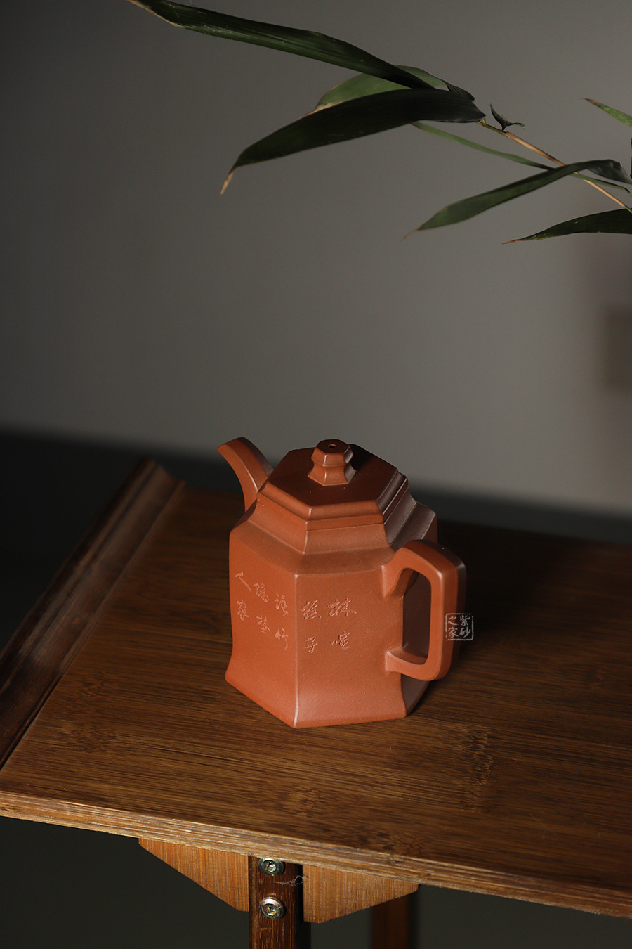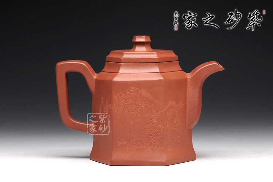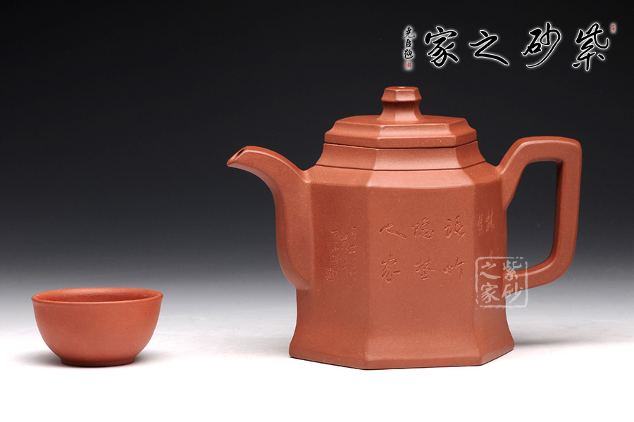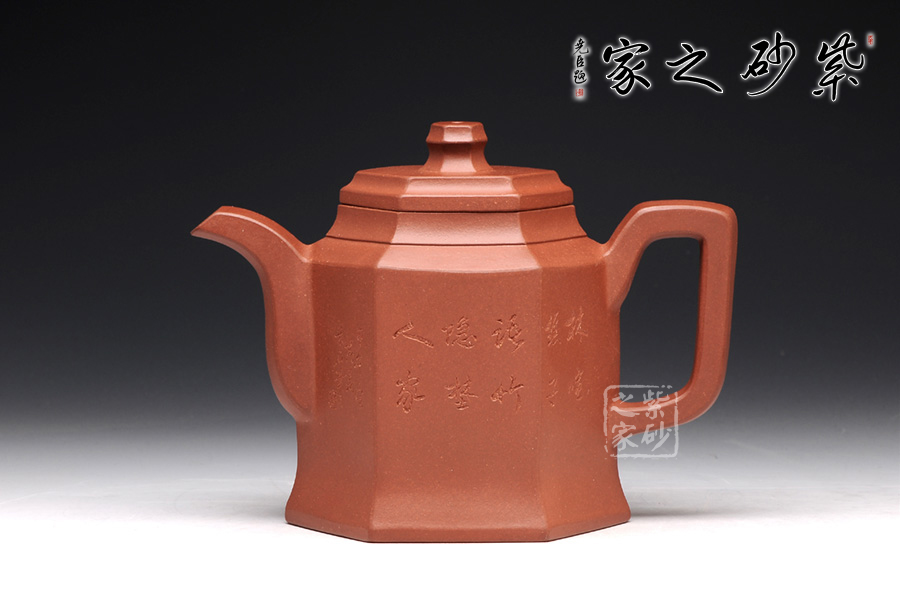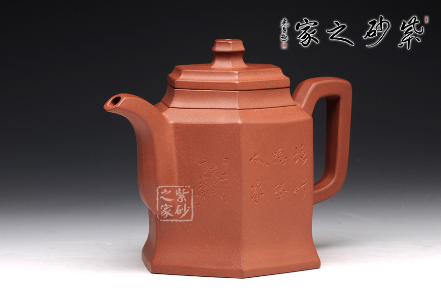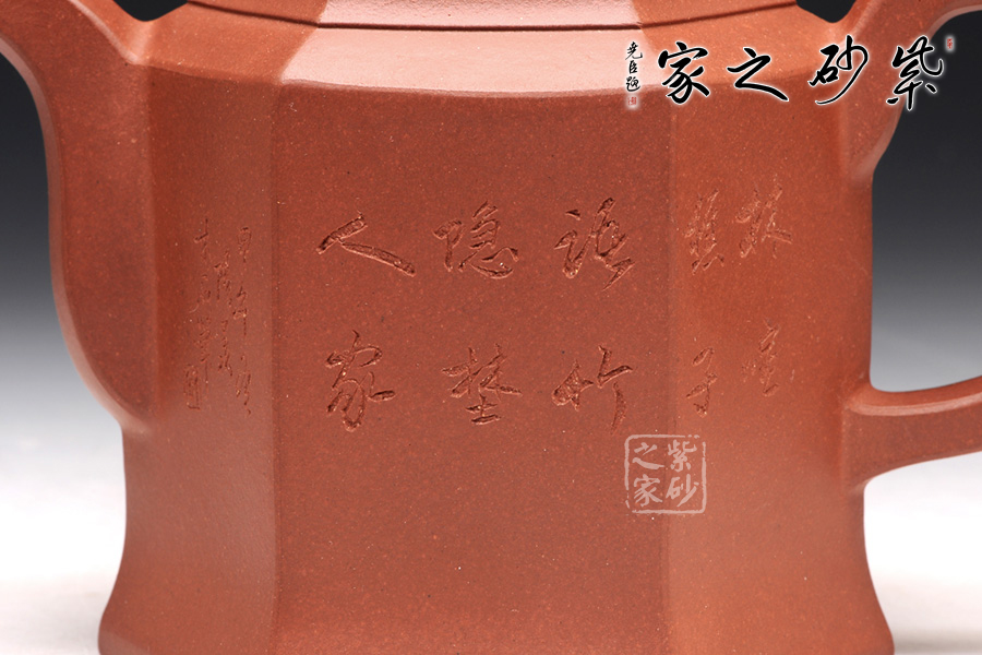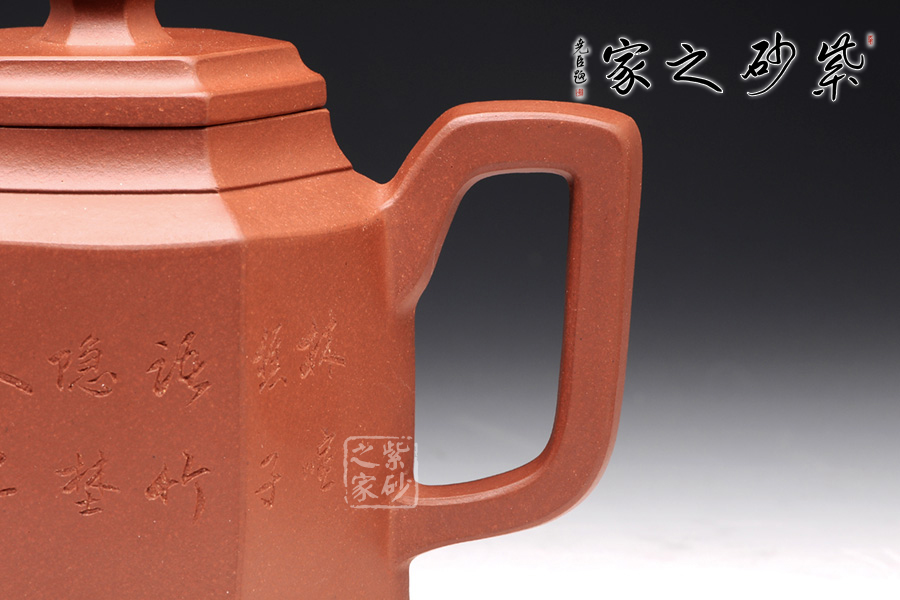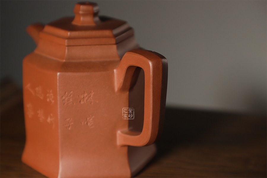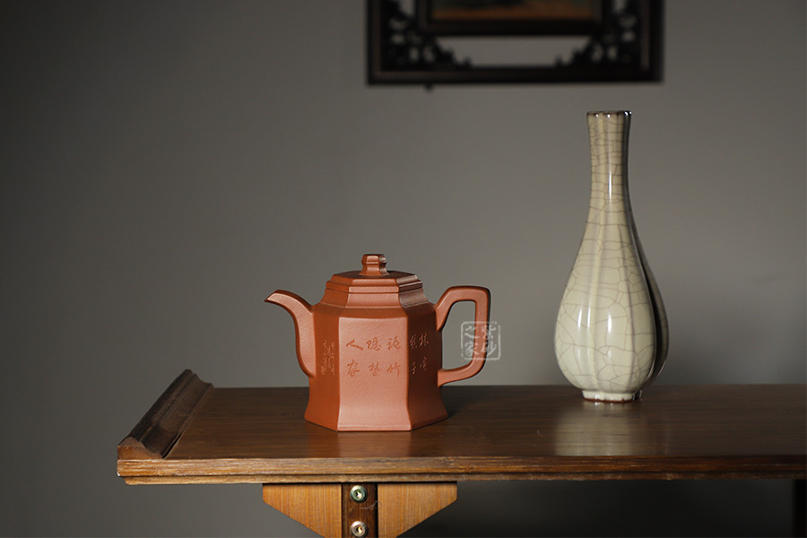 此壺根據(jù)傳統(tǒng)器型秦權(quán)改型創(chuàng)作而來,用方器形態(tài)展示秦權(quán)的另一種力量美,六方秦權(quán)壺線面挺括平正,輪廓線條分明,給予人們干凈利落,明快挺秀之感;壺身六面均勻調(diào)和,每一個面都平實(shí)、直挺,壺肩曲線過渡溫和;壺嘴、壺把、壺蓋及壺鈕皆為六方造型,銜接之處十分細(xì)膩,棱角從無到有的過渡令人驚嘆;此壺同時彰顯了作品不凡的技藝。