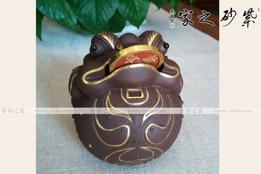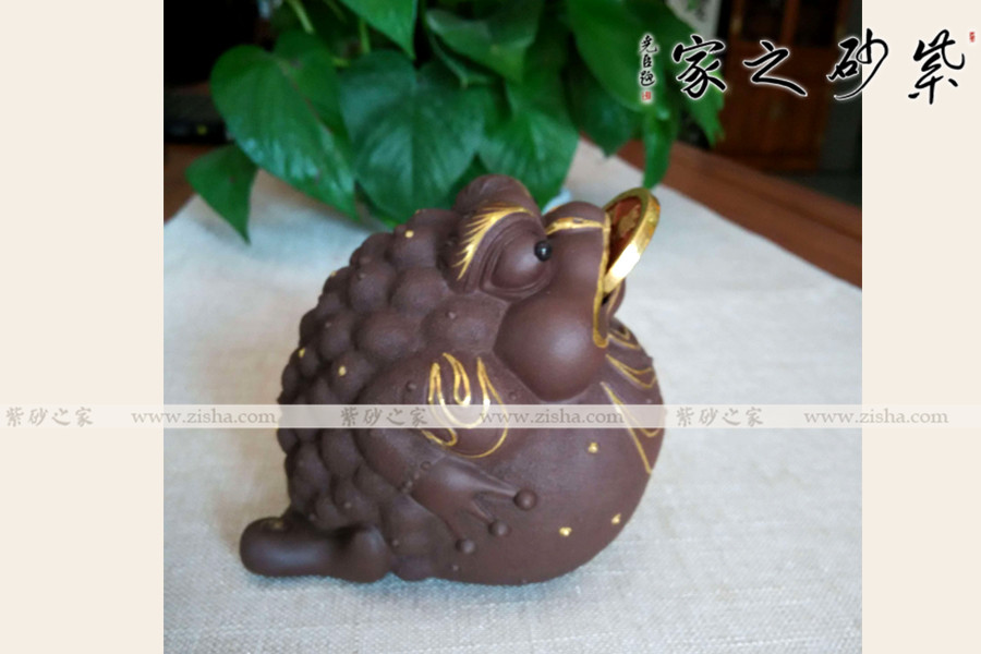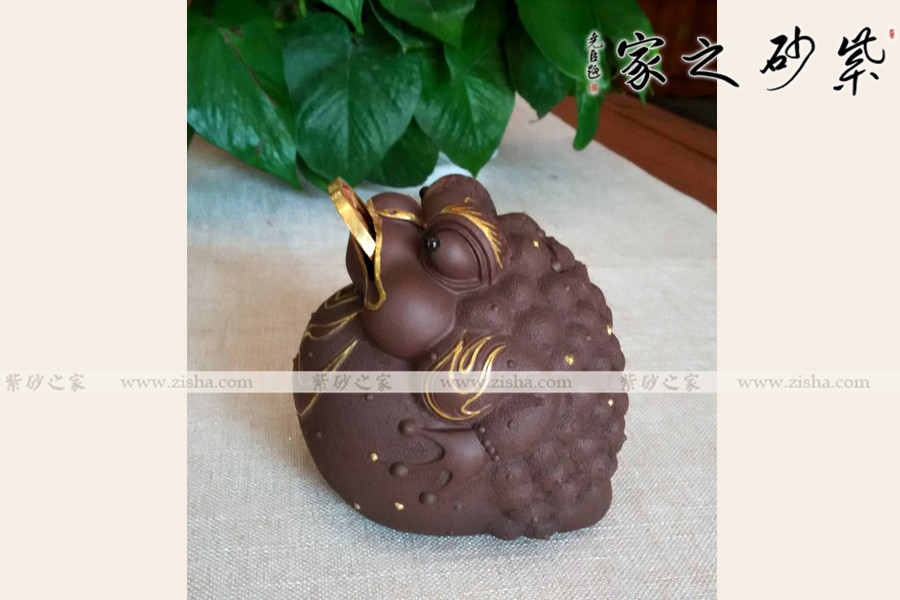 此擺件精選紫砂泥制作而成,三腳金蟾的造型憨態(tài)可掬,生動形象。口咬銅錢不言而喻,進財而不漏財。描金裝飾富麗華貴,氣勢逼人。
