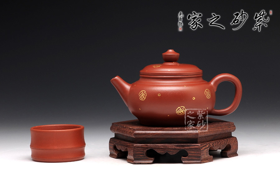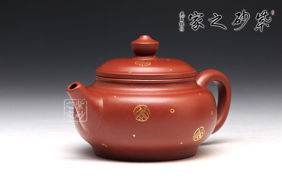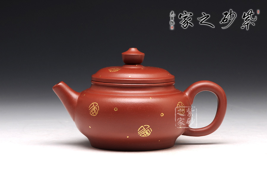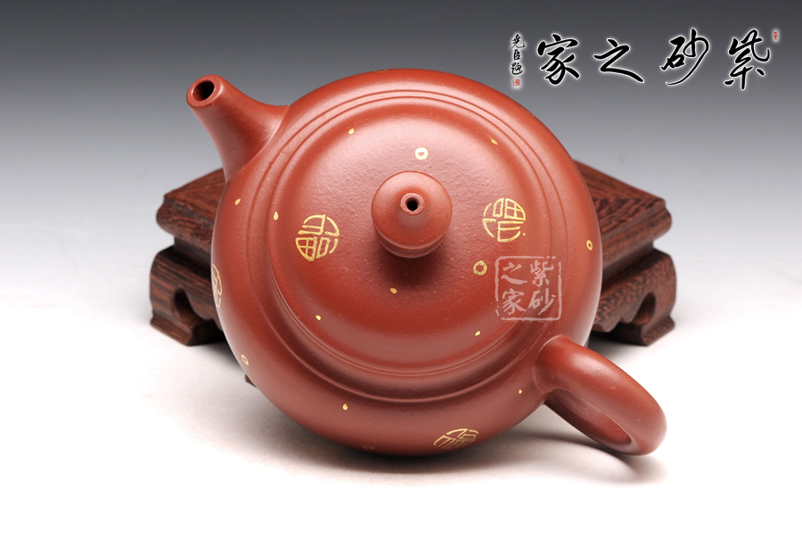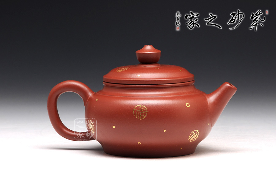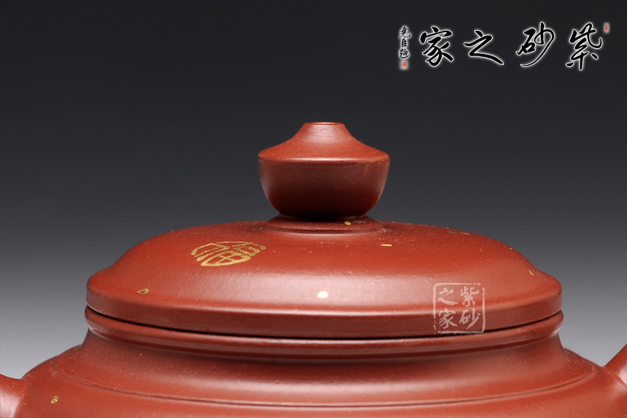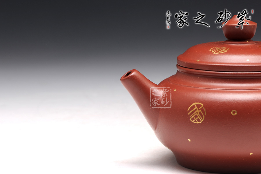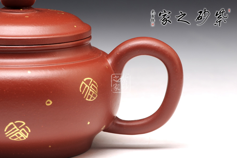 此壺形制飽滿圓潤,做工精湛,壺身造型十分經(jīng)典古雅,同時(shí)增添了動(dòng)感。挺拔的壺嘴與壺把同壺身呼應(yīng),整體協(xié)調(diào)統(tǒng)一,壺身方圓結(jié)合,粗細(xì)有度,外形簡練卻有變化,美感突出。加底簡約與壺身暗接溫婉,壺口微斂,壓蓋纖柔,蓋面飽滿,壺鈕圓滑獨(dú)特。描金福字祥和艷麗,華貴大氣,在紅潤的壺身上更加鮮明。