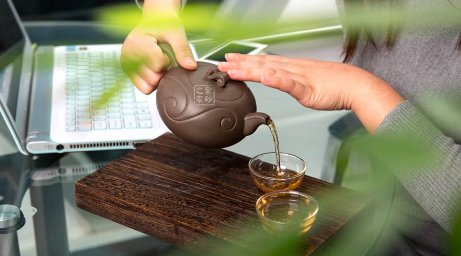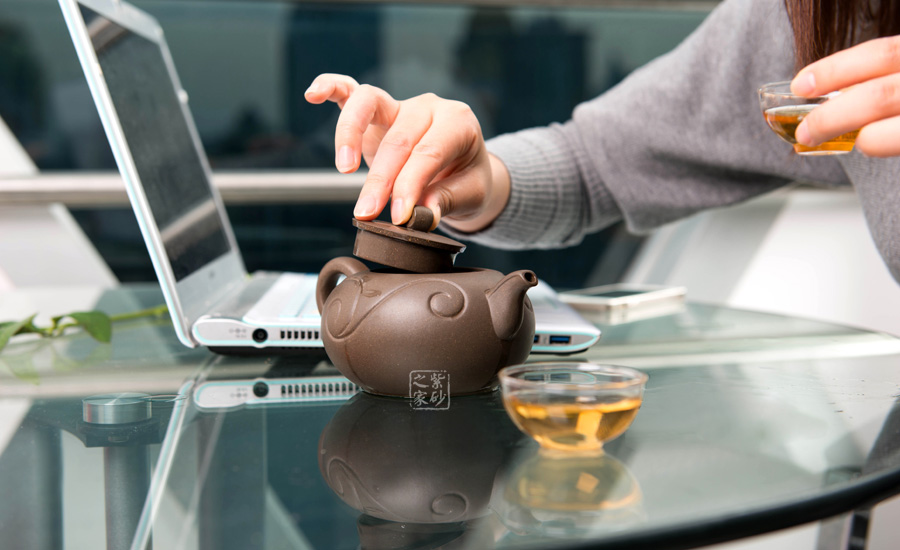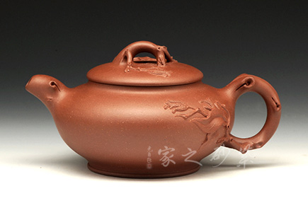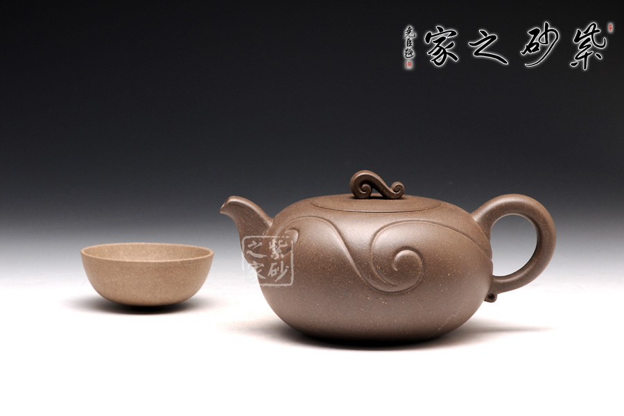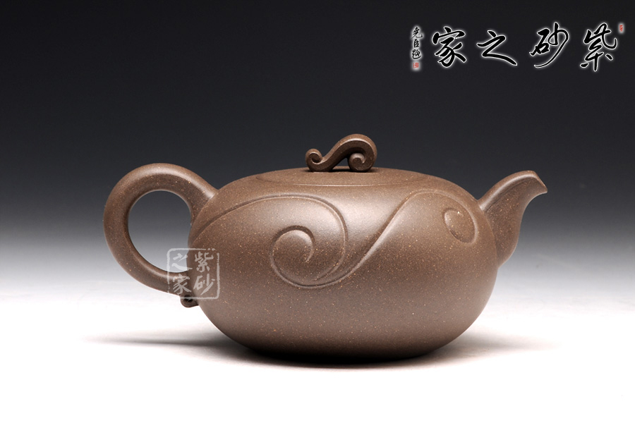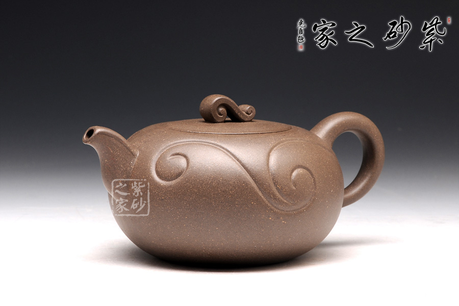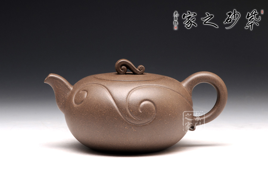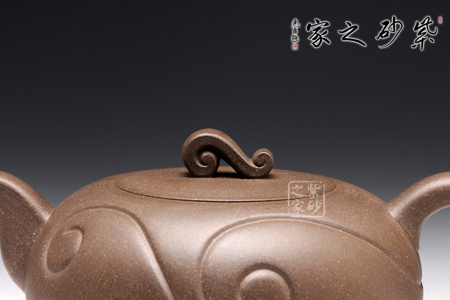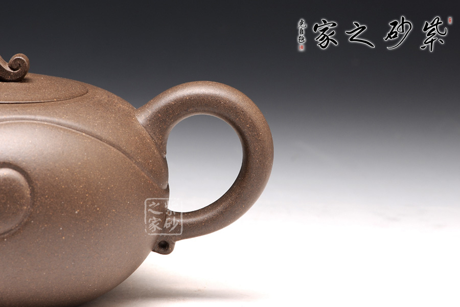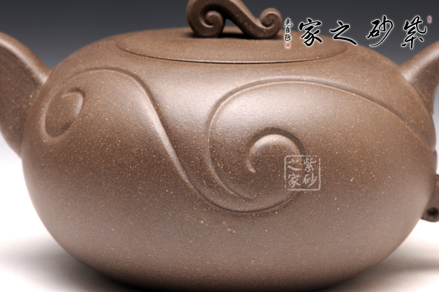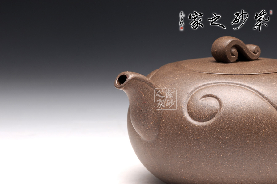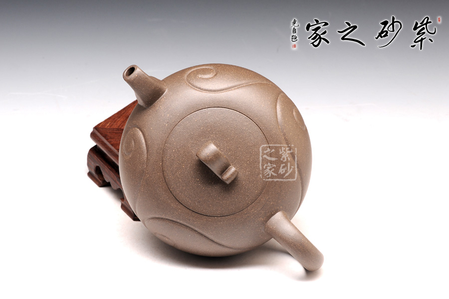 壺身為圓球狀,橫向空間更大,從而展示出厚重感。底部和壺蓋都十分平整,呈現(xiàn)出對(duì)稱的姿態(tài)。壺鈕十分小巧,紋理精美,仿佛就是一枚如意,映襯在壺身的線條里,更見大氣動(dòng)人。壺把和壺嘴是圓中有方的造型,圓滑里透出力道,工整不凡。