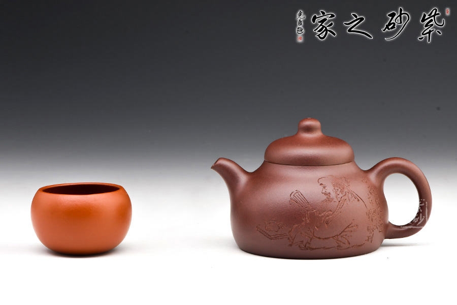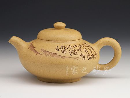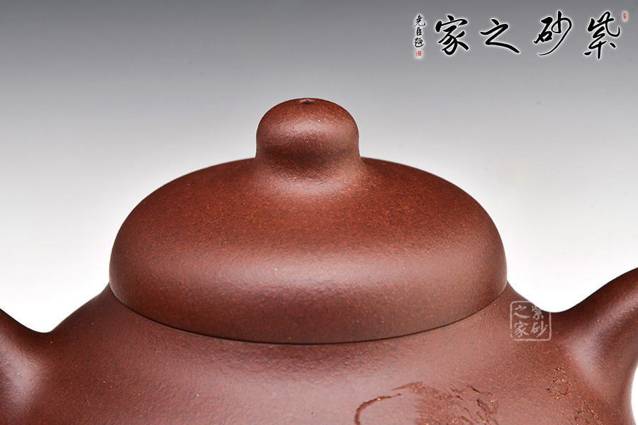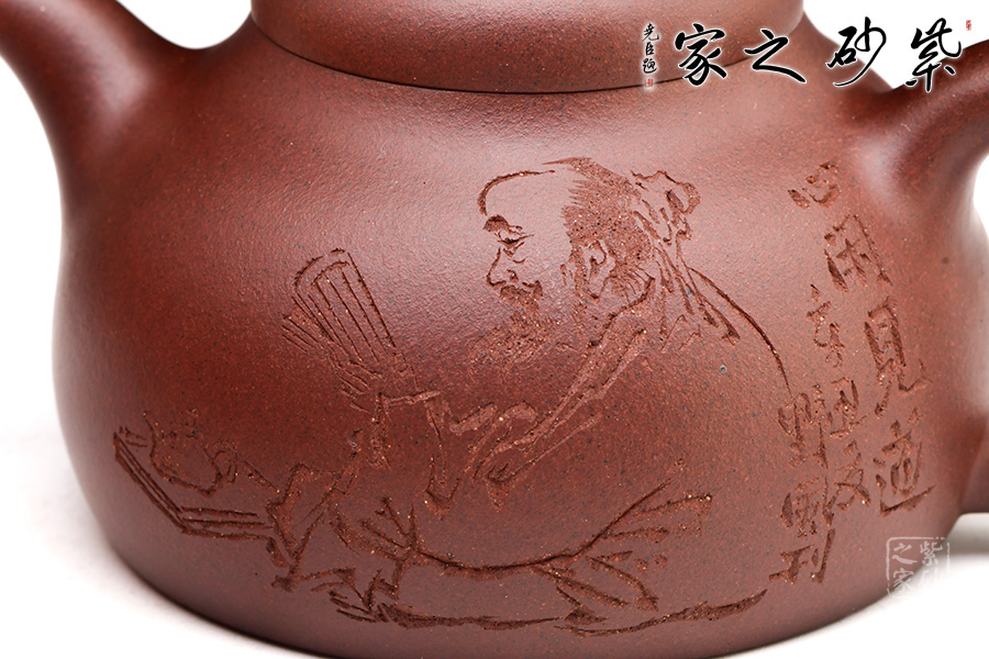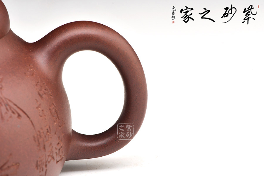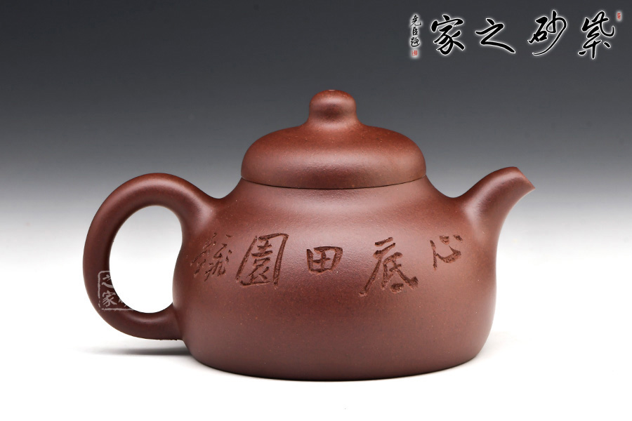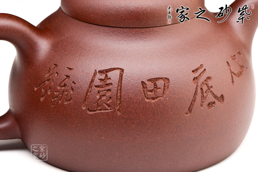 這把壺整個(gè)壺型乃是模仿半個(gè)匏瓜制作而成,的子就是匏瓜的柄,截蓋恰好在瓢瓜的頸部與壺口對(duì)接,嚴(yán)絲合縫,泡茶很實(shí)用。一變嘴短促有力,嘴頭齊整如刀裁而成,嘴口細(xì)致,不見鋒芒,所以整個(gè)壺嘴與壺體的圓潤所融合。倒把下沉,略呈扁圓形,拿捏在手很適合,應(yīng)該是老師刻意而為。壺身鼓脹飽滿,整把壺盈潤豐腴,很是迷人。壺身刻繪皆出自劉一飛之手,居士讀書和“心底田園”互相映襯,表達(dá)了歸于田園的情懷。