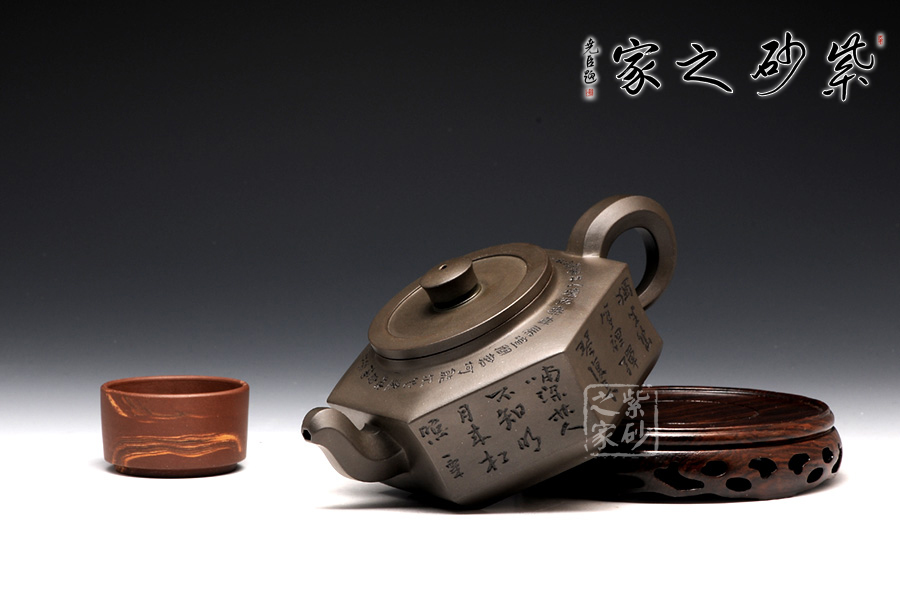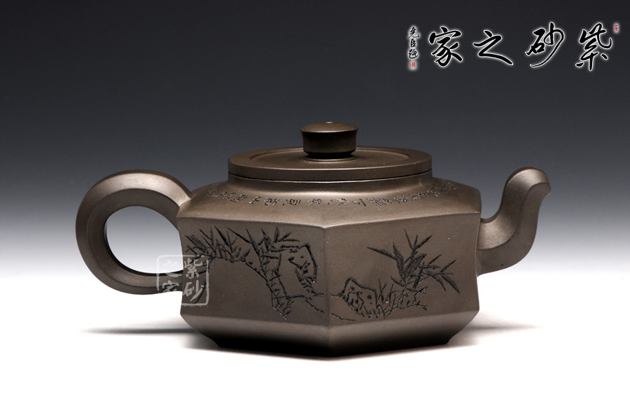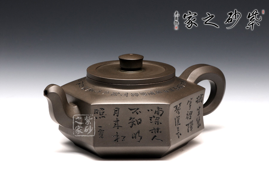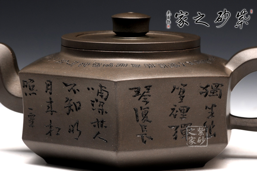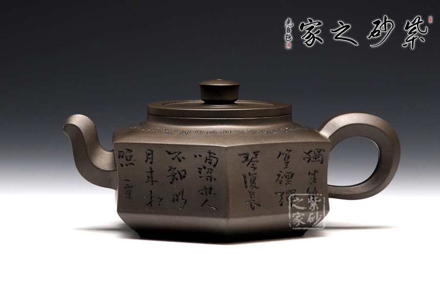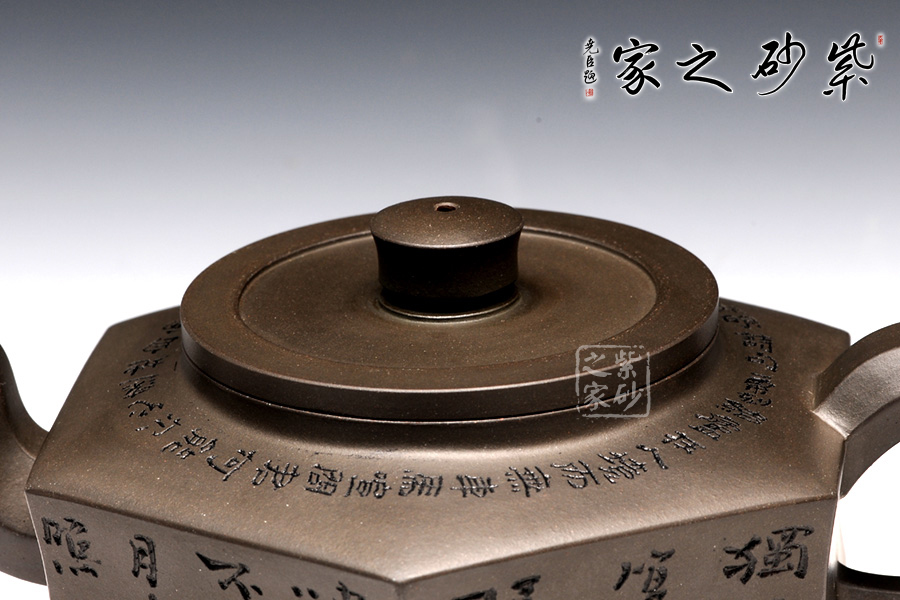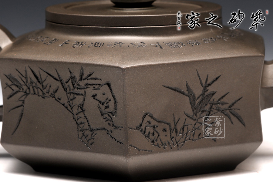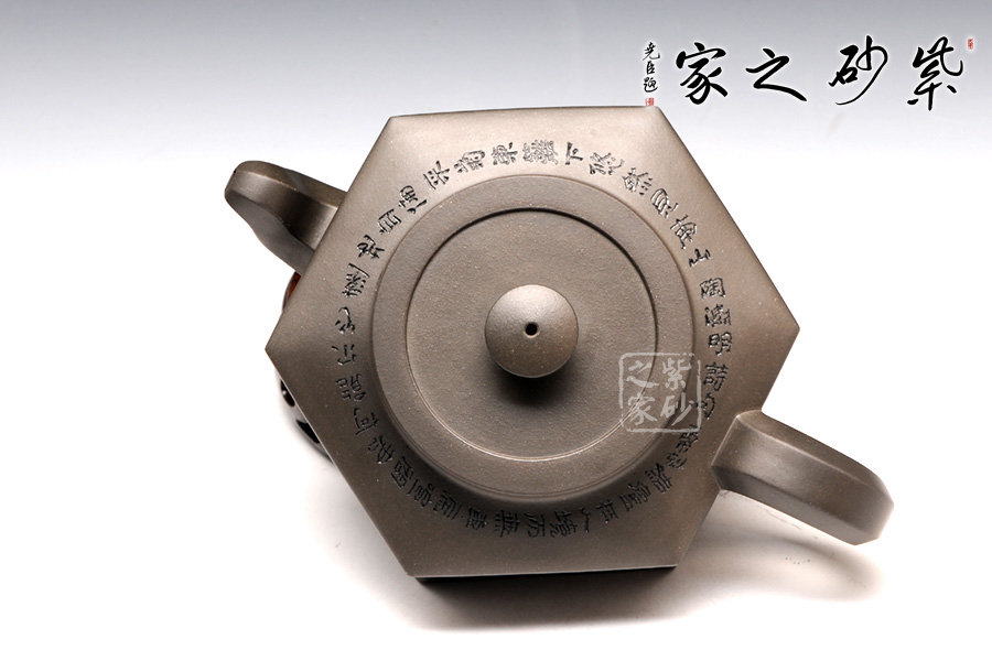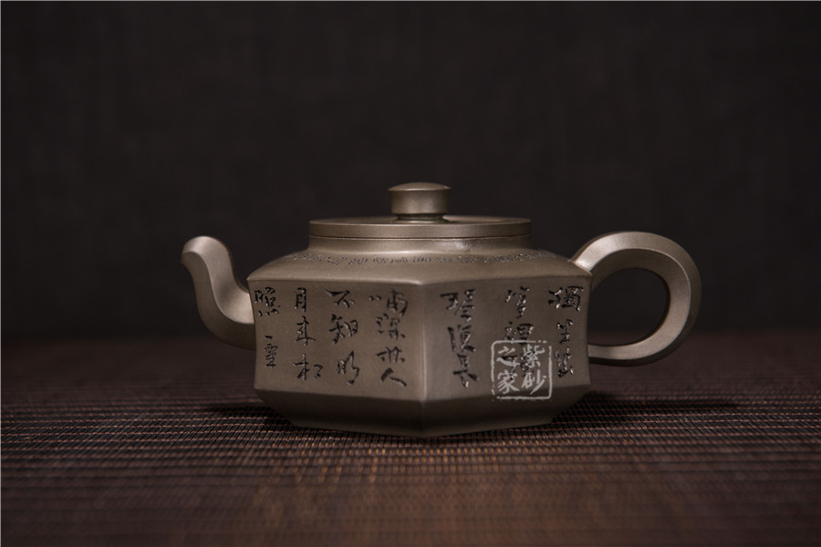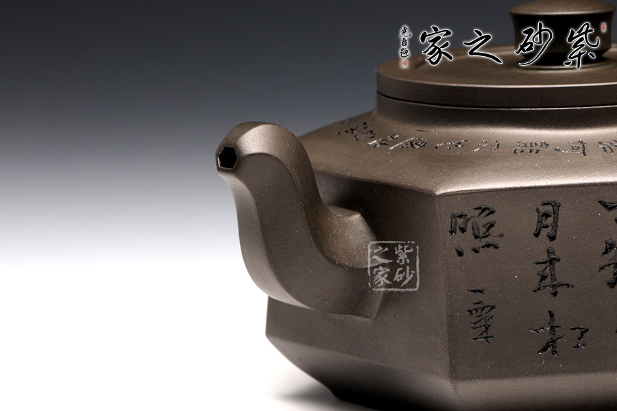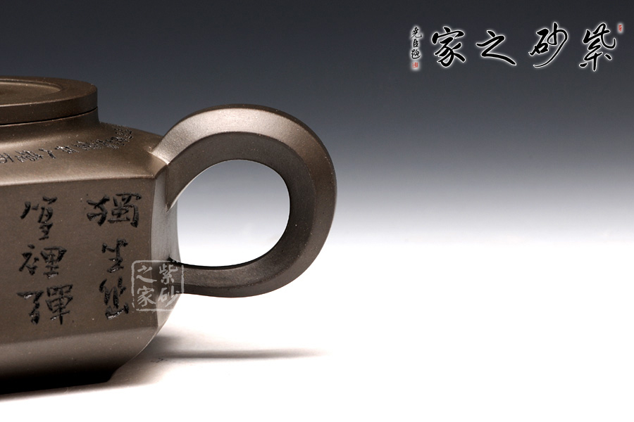 壺身被分為六面,切面平滑,棱角分明。肩部用斜角過渡,壓蓋對接嚴密,柱形鈕小巧簡潔。壺嘴和把雖然是弧形,但外觀用切面裝飾,于圓潤里透著工整和老味,意味獨特。