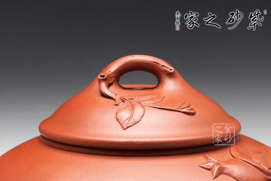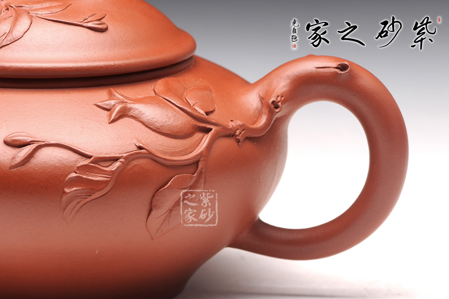 壺型是笑櫻變化而來,豐斂變化中展現(xiàn)泥質(zhì)特色,紅潤溫和。嘴和壺把則以線條表達(dá)幾何美感,曲折反復(fù)和爽利無阻,流光閃動(dòng)其上,意味超凡。橋形鈕是不同之處,貼花又非常出彩,葉片紋理清晰,石榴寓意多子多福,讓人愛不釋手。