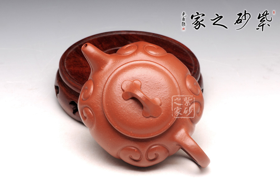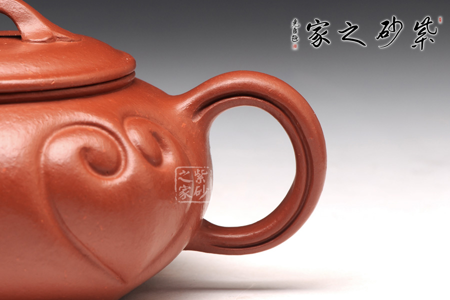 壺名為如意,壺身周圍皆為如意紋飾裝飾。橋形鈕美觀自然,壺蓋圓潤舒展,浮雕以如意紋飾,與壺鈕配合,俯視若盛放的牡丹,又似湖心蕩漾著暈開的層層漣漪,讓人不覺心生歡喜。壺嘴線條先揚后抑,姿態(tài)優(yōu)雅大方。壺把勻勢而起,把持舒適。壺身的如意紋飾凹凸有致,雖起伏錯落卻手感細(xì)膩。