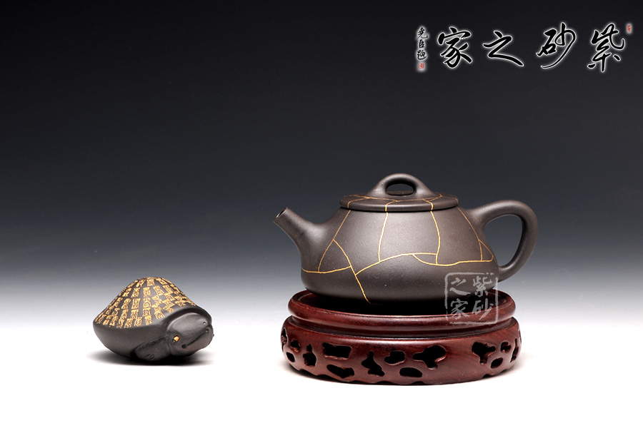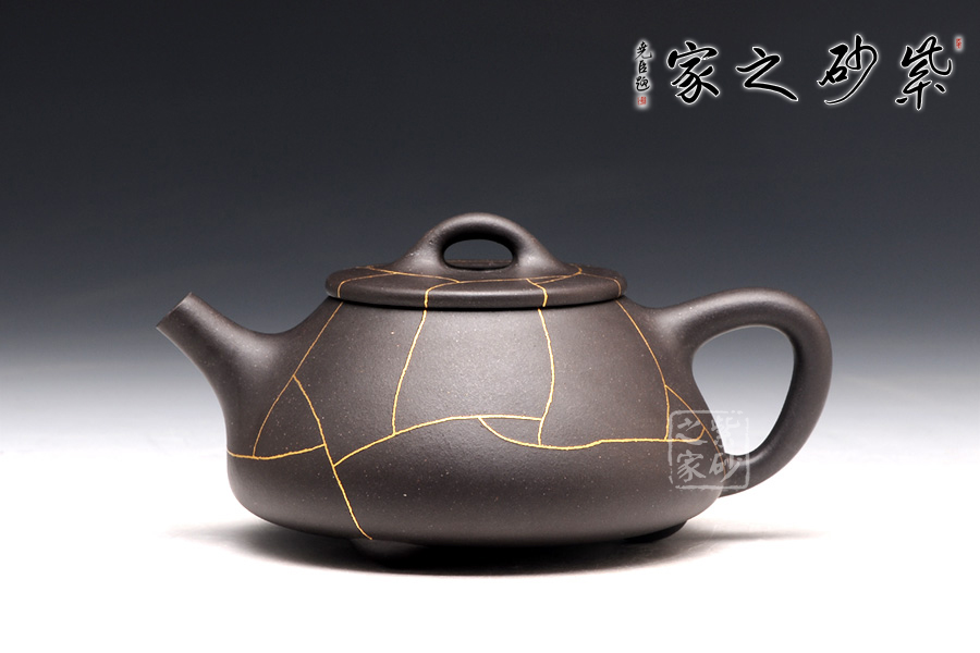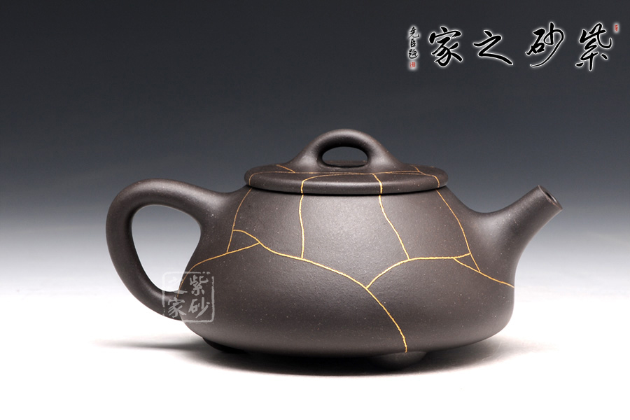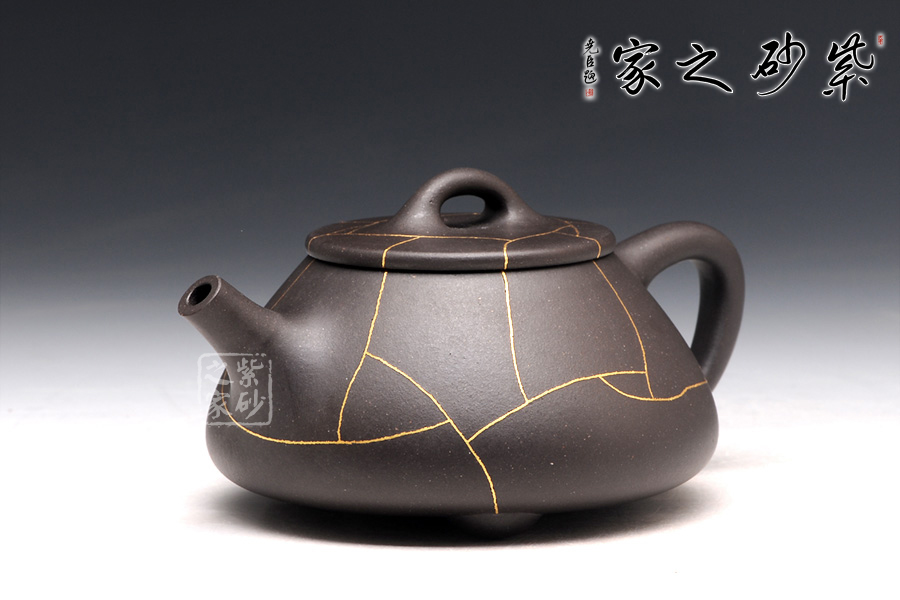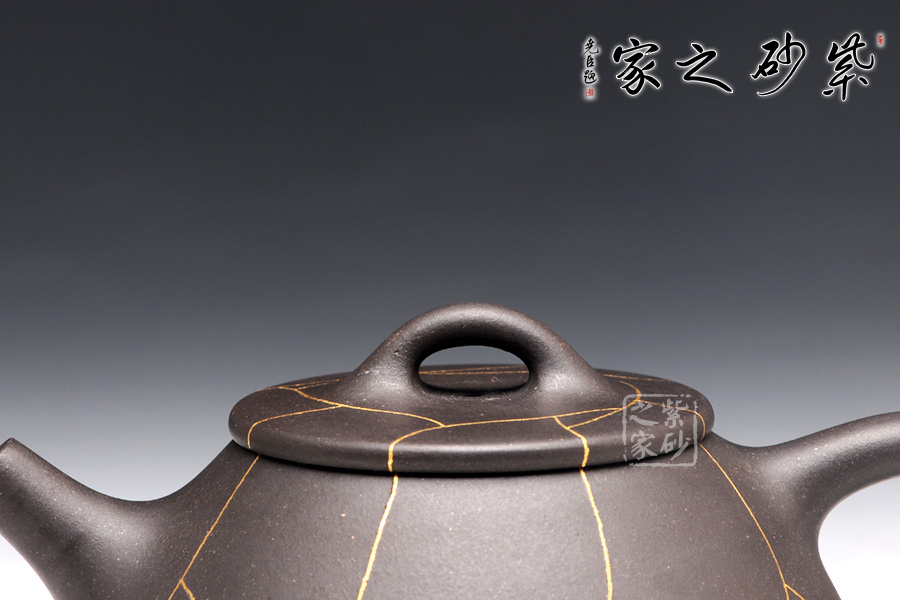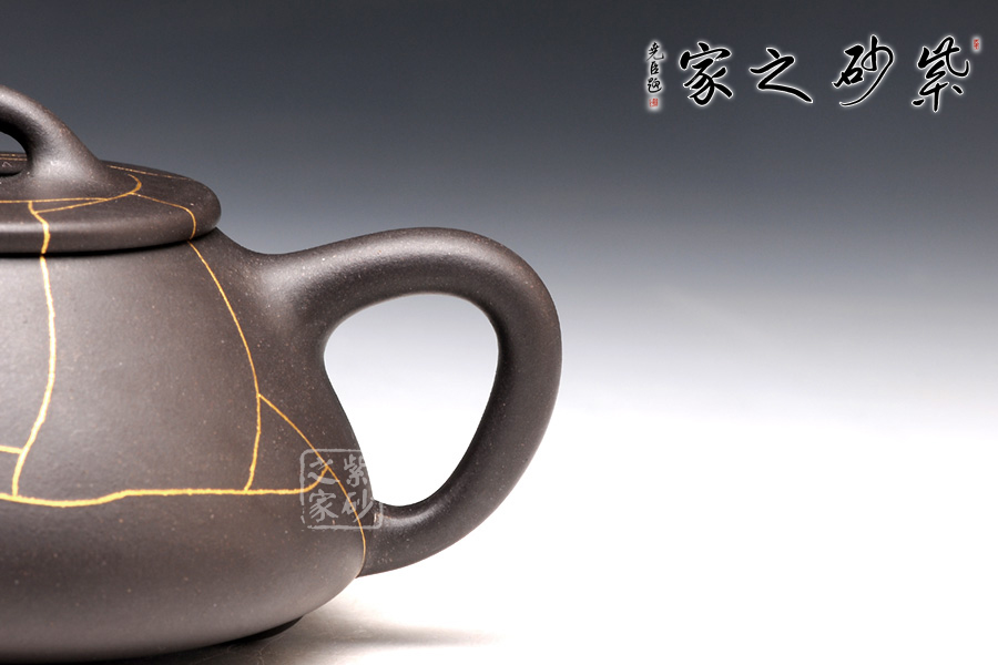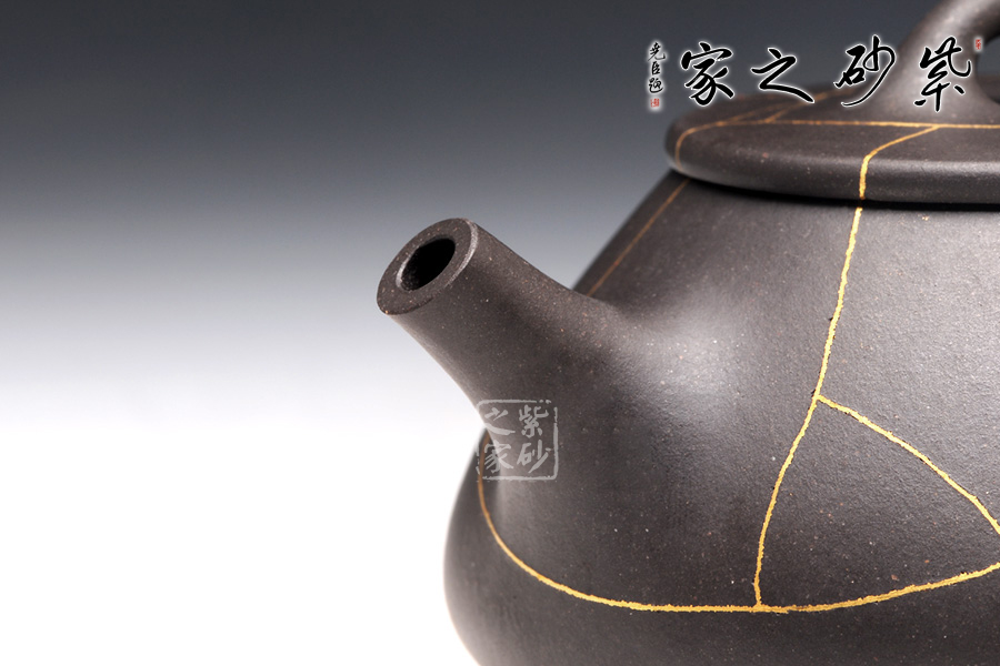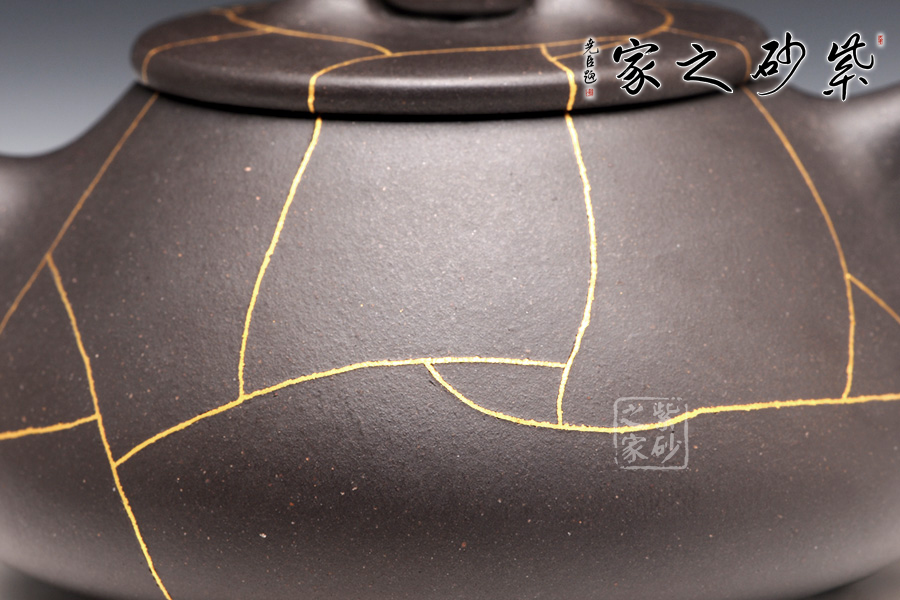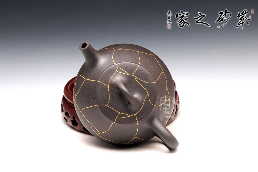 所謂的冰紋開片,要求在泥坯的時候在壺體上刻好紋路,在燒制的過程中壺體上會發(fā)生開裂現(xiàn)象,但是是輕微的開裂,并不影響使用。出窯之后在開裂的縫隙里手工鑲嵌真金(此壺共鑲嵌24k純金)。這種工藝難度極大,首先開裂是泥質(zhì)的自然現(xiàn)象,一般人很難精確把握;其次在2-3毫米的壺體上鑲嵌金絲裂紋要求極高,試想,手持鐵錘打金絲,可謂是如履薄冰。