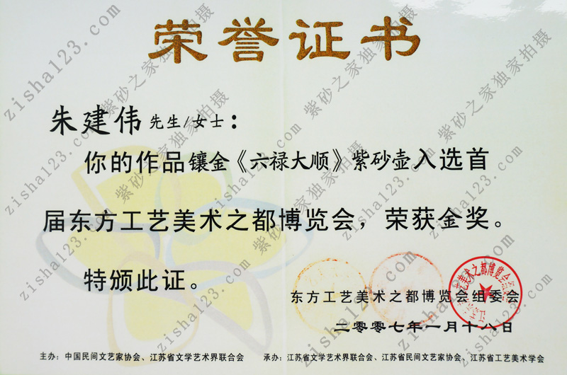 2006年《鑲金鳳祥壺》獲河北省“首屆秦皇島中國宜興紫砂作品展”評(píng)比金獎(jiǎng)