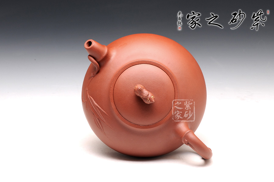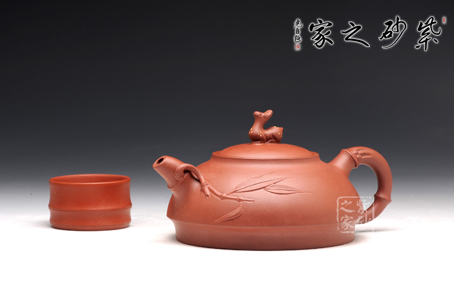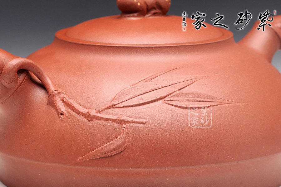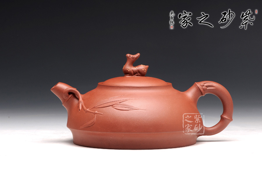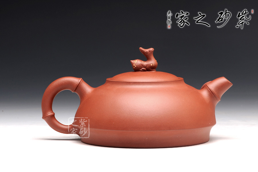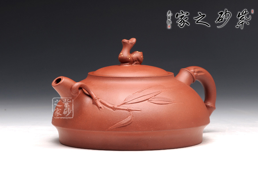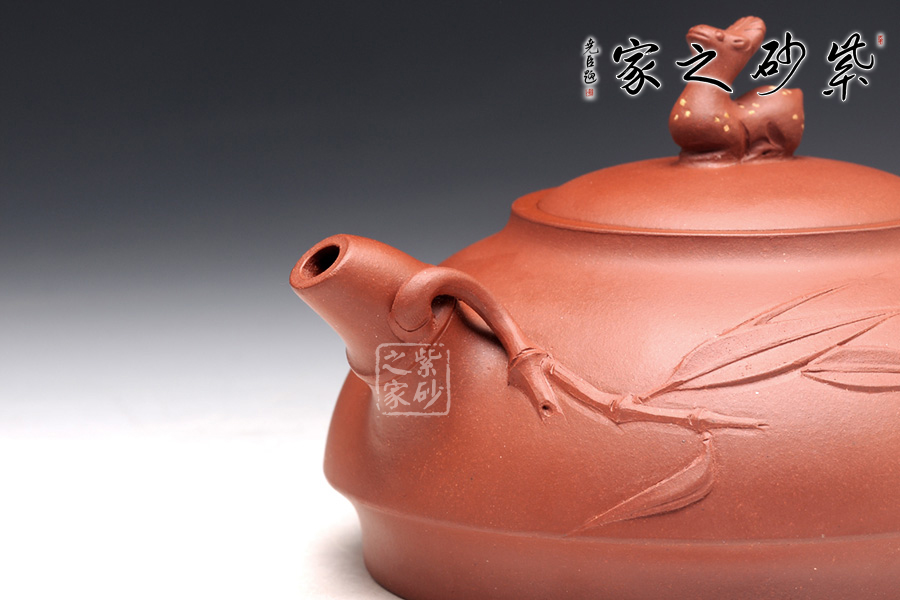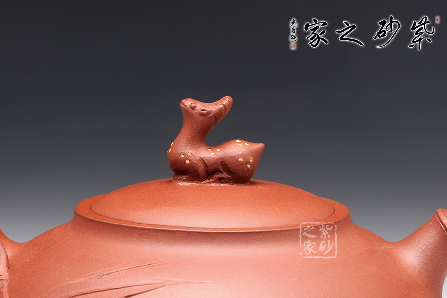 此壺造型清新雅致,蒼勁有力,端莊雅致,不失渾厚樸實(shí),質(zhì)拙中顯高意;流把竹節(jié)造型,一變嘴二節(jié)竹節(jié)裝飾而成,一只竹葉飄然而出,耳形端把四節(jié)竹節(jié)裝飾,壺鈕造型別出心裁,取一只神鹿為形,以鋪砂的工藝表現(xiàn)神鹿身上的斑紋,閃著金色的光芒,鹿諧音為“祿”,是招財(cái)聚福之意;嵌蓋設(shè)計(jì),壺頸略高,形成強(qiáng)勁的壓蓋之勢,壺身呈一只倒扣的碗形,且壺底邊緣向內(nèi)收縮一圈,使壺身更加挺立,古拙而富有老味;整款壺竹韻清疏,韻味不失,毫無矯飾,意蘊(yùn)深長。