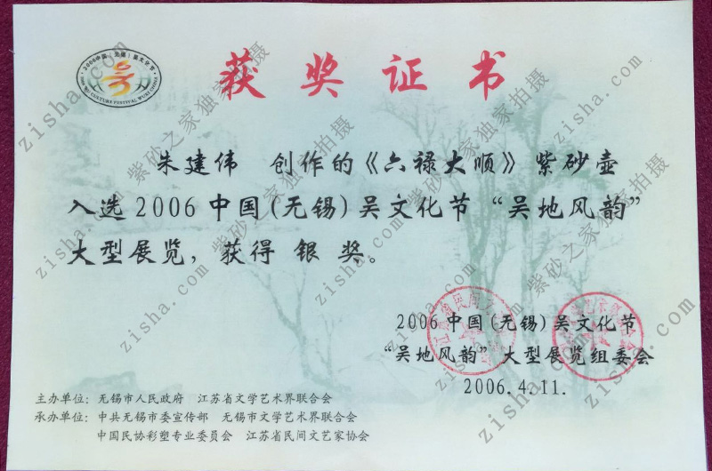 2006 年《鑲金六祿大順壺》在中國吳文化節(jié)“吳地風(fēng)韻”評(píng)比獲銀獎(jiǎng)。