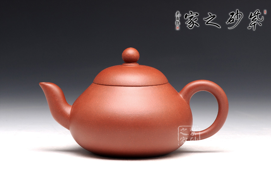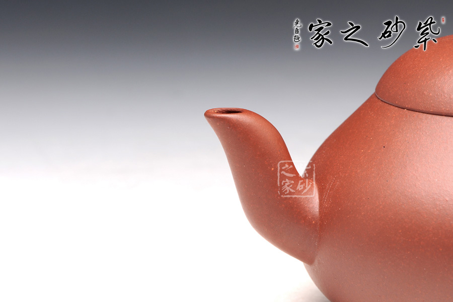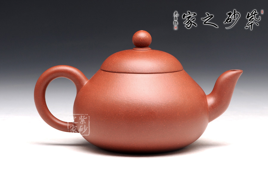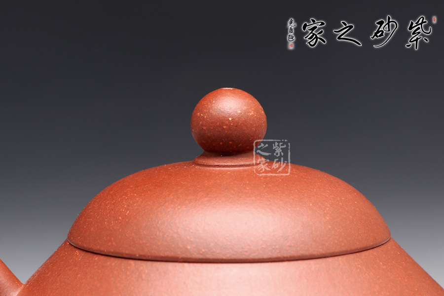 梨形壺,是傳承已久的一種經(jīng)典壺型,此壺整體極為敦厚穩(wěn)重,似乎全部的力量都在壺底;壺身呈圓潤的梨形,壺型略扁,上斂下豐,過渡線條流暢溫和,截蓋設(shè)計使壺型更為完整,小小的寶珠鈕、溫婉柔美的彎流、細膩的圈把,在矮實的壺體襯托之下均顯得力度欠豐,因此整個壺體猶如一尊彌勒端坐在那里,穩(wěn)如泰山;細看此壺,精品原礦紅皮龍的瑩潤質(zhì)感如少女的極富,仿佛吹彈可破,紅而不艷的色澤彰顯著儒雅和秀氣。