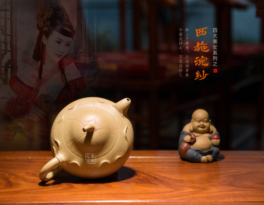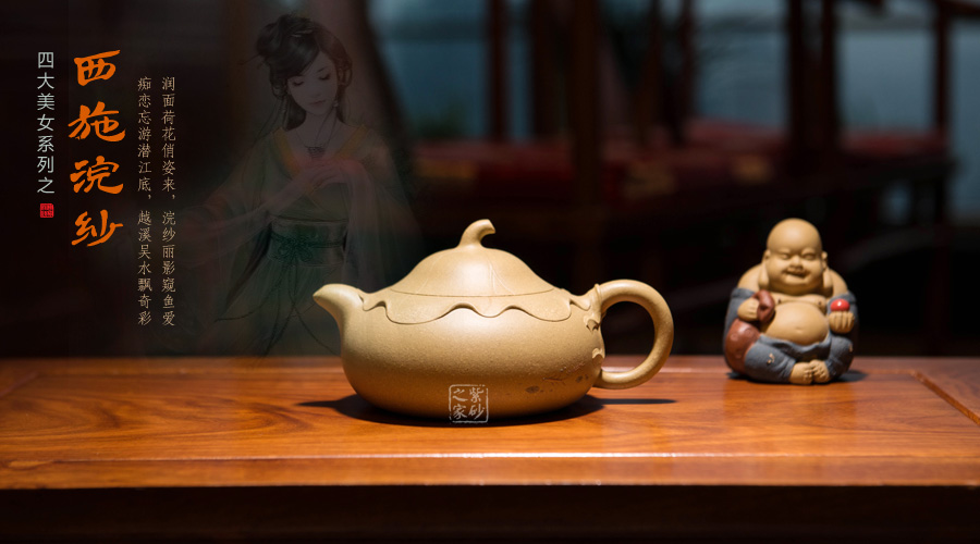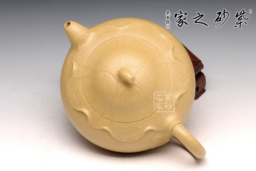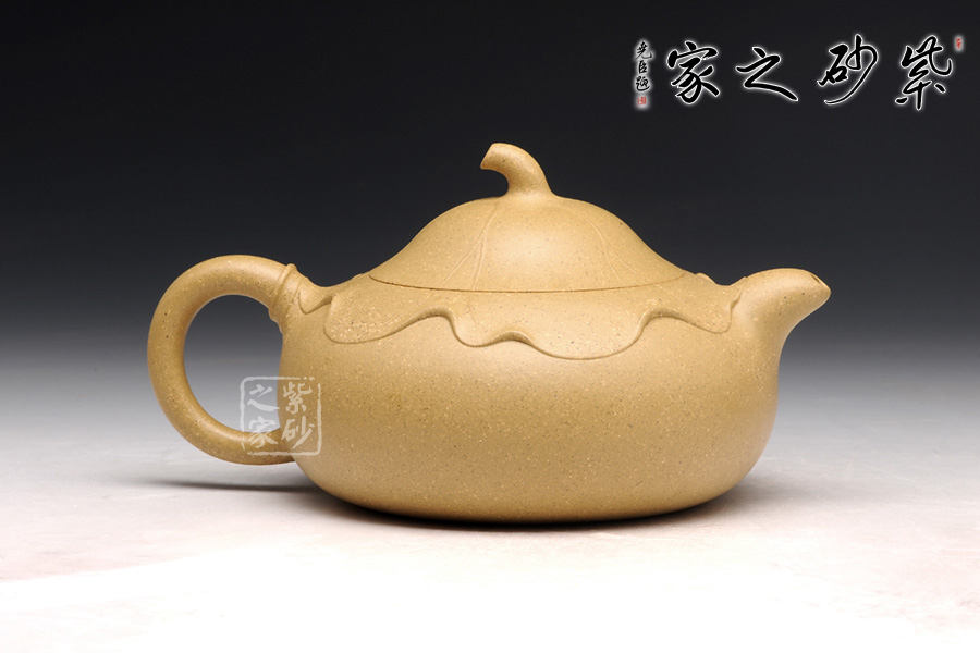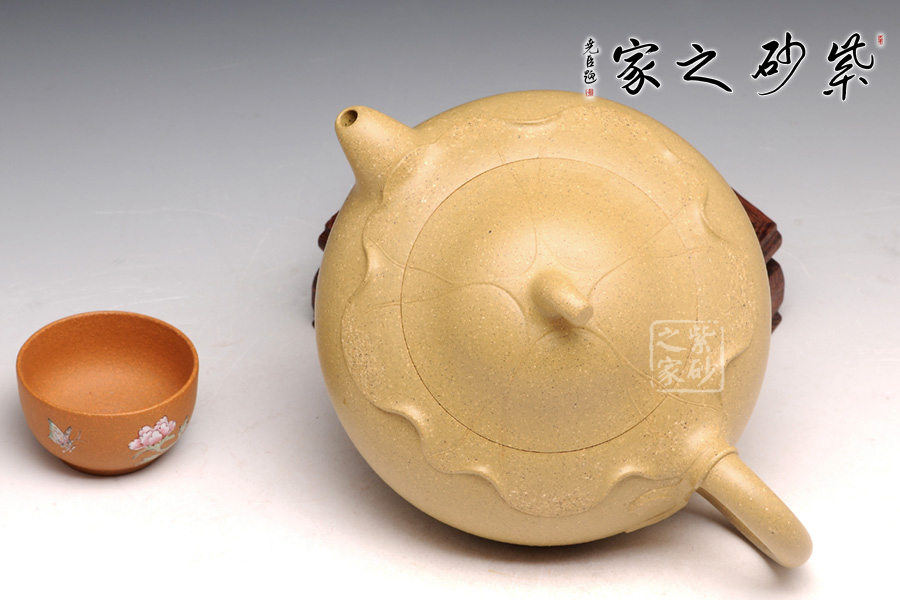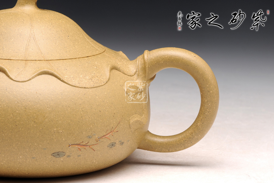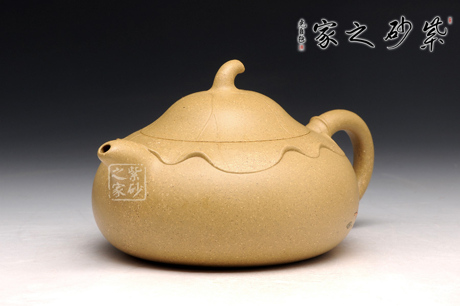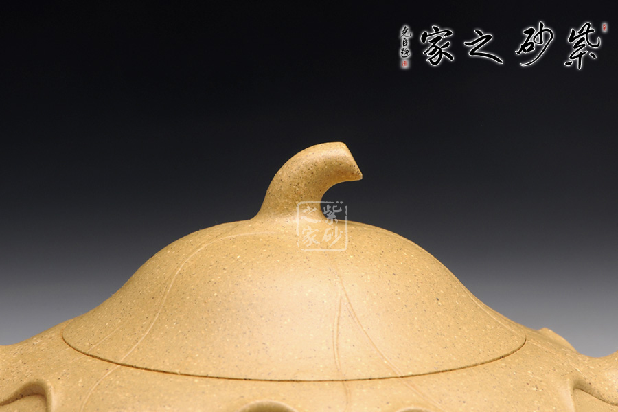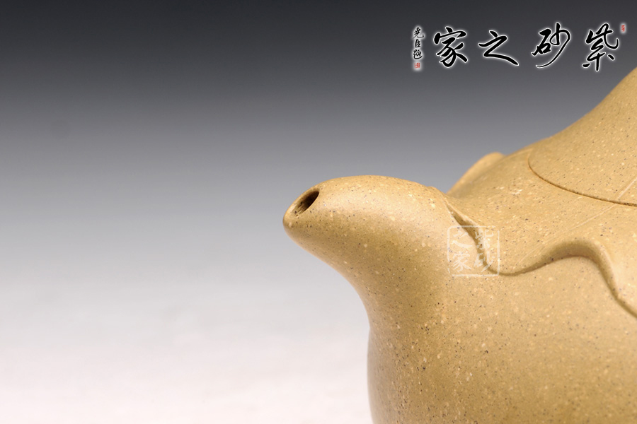 傳統(tǒng)的西施浣紗都要用西施形象來(lái)展示,但此壺看不到西施,只有黃金段泥鮮亮的色澤非常醒目。圓潤(rùn)飽滿的造型被大片荷葉包裹,氣質(zhì)更加自然。而西施浣紗,必然是在江南水鄉(xiāng),荷葉蓮花照應(yīng)之下,一定是出塵的美。此壺不著痕跡,但表現(xiàn)西施卻十足恰當(dāng),讓人嘆為觀止。