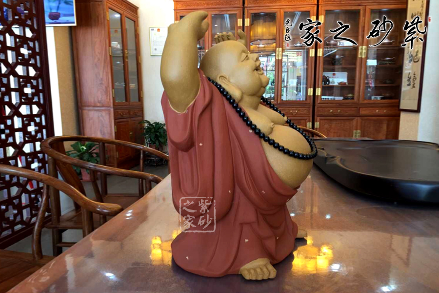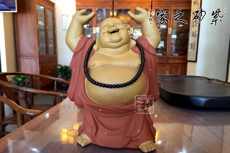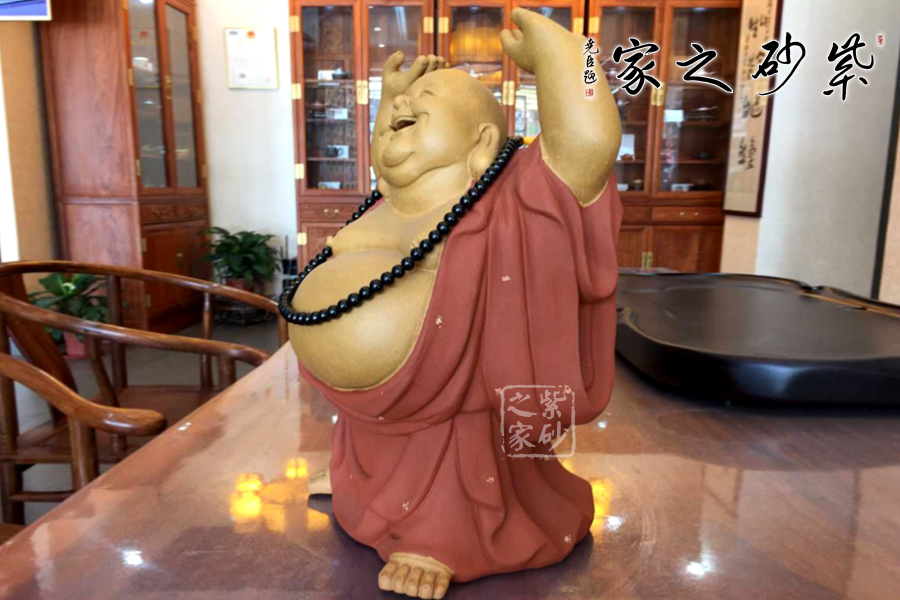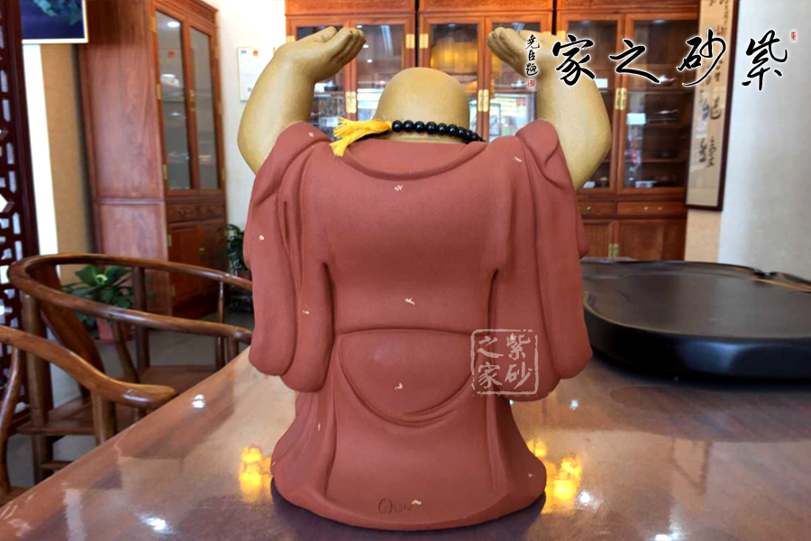 這款彌勒造型取名為“頂天立地”,其正立著,雙手托起,掌心向天,大串佛珠掛在脖頸垂蕩腹間,大大的肚子,肥肥的臉蛋,大耳下垂,笑臉盈盈,甚是可人。袈裟上點點鋪砂的工藝裝點,金光閃閃,更具靈韻。