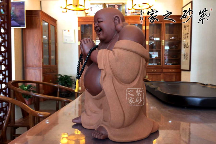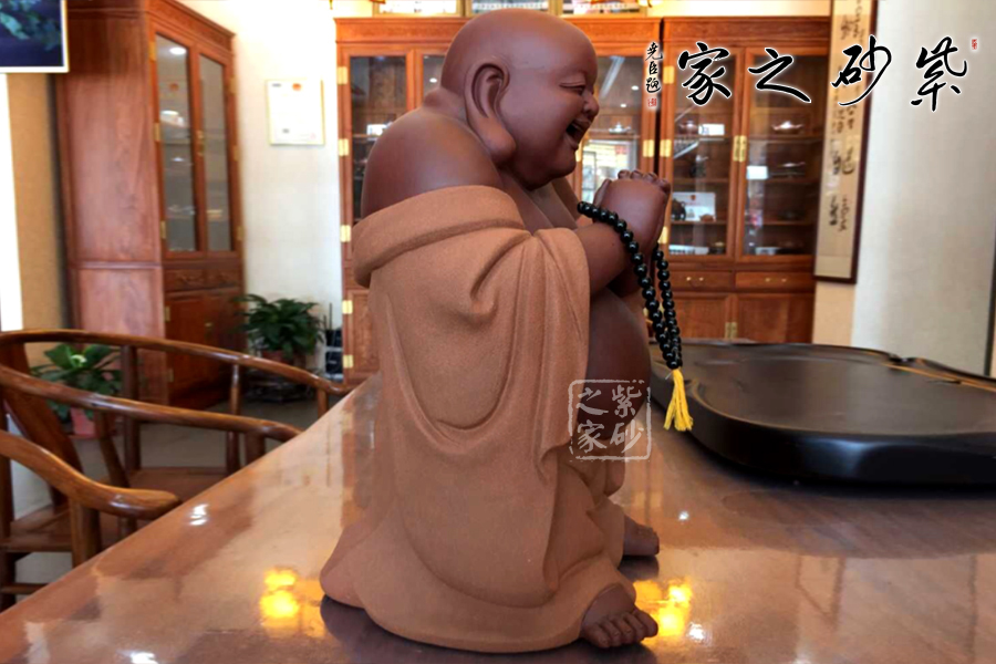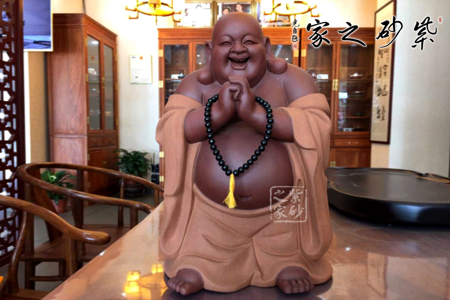 佛陀大肚滾滾,腦袋渾圓,肉鼻大嘴,笑得滿面紅光,神采飛揚。僧袍隨性而披,褶皺貼身更顯放達不羈。雙手抱拳作揖,佛珠掛前,祝福之意盡顯,寓意招財進寶,福源廣進,甚是討喜。