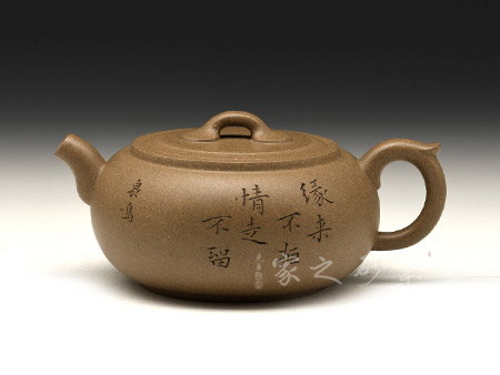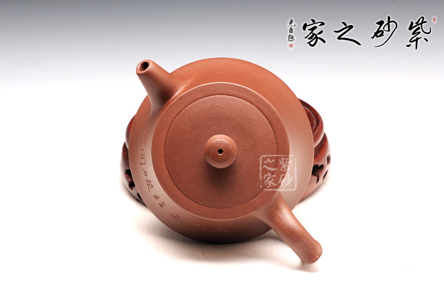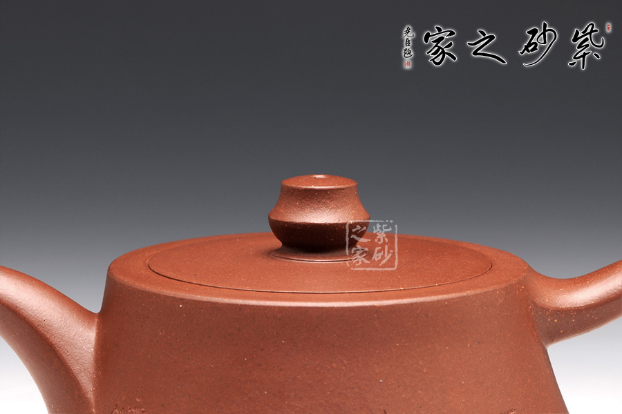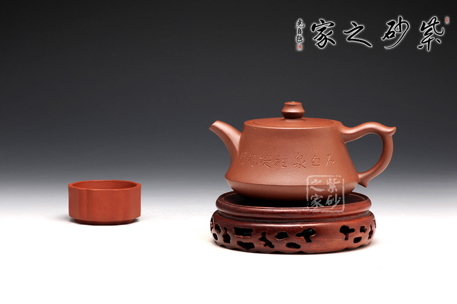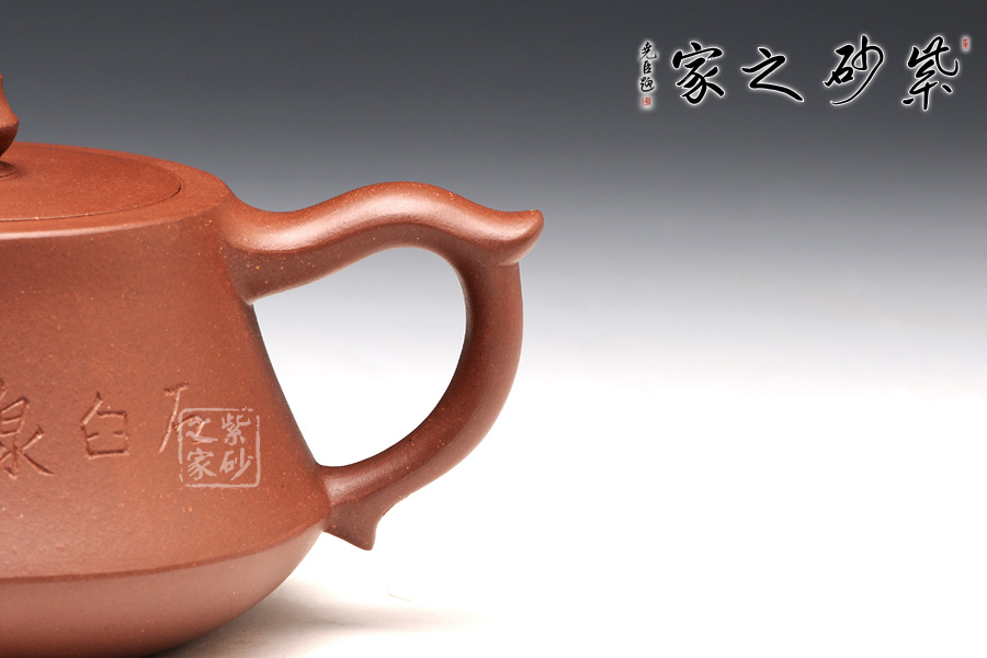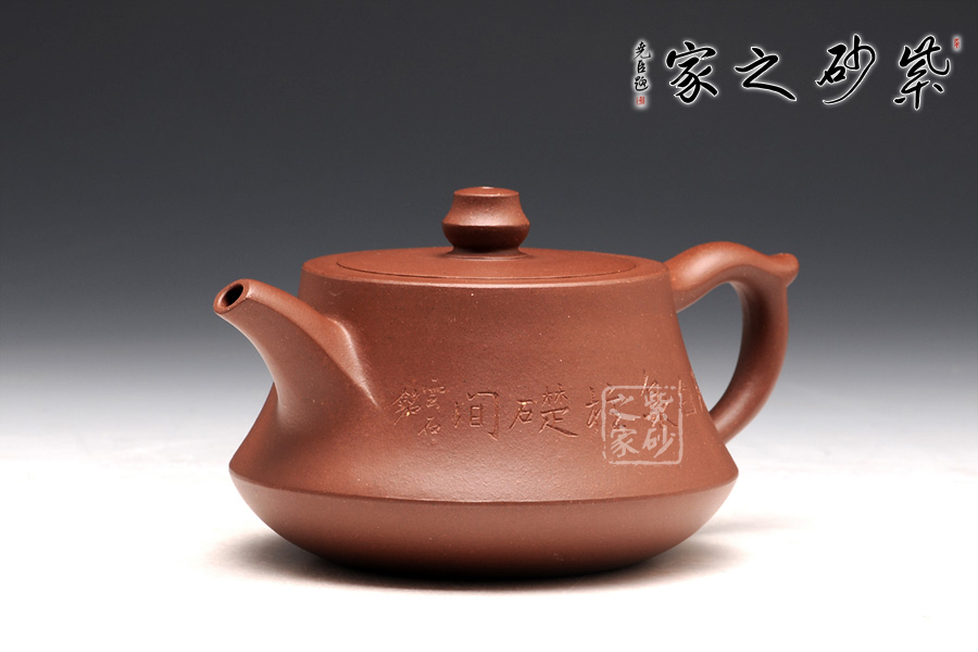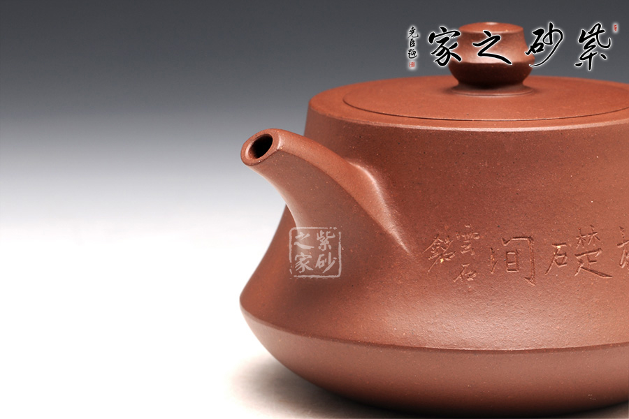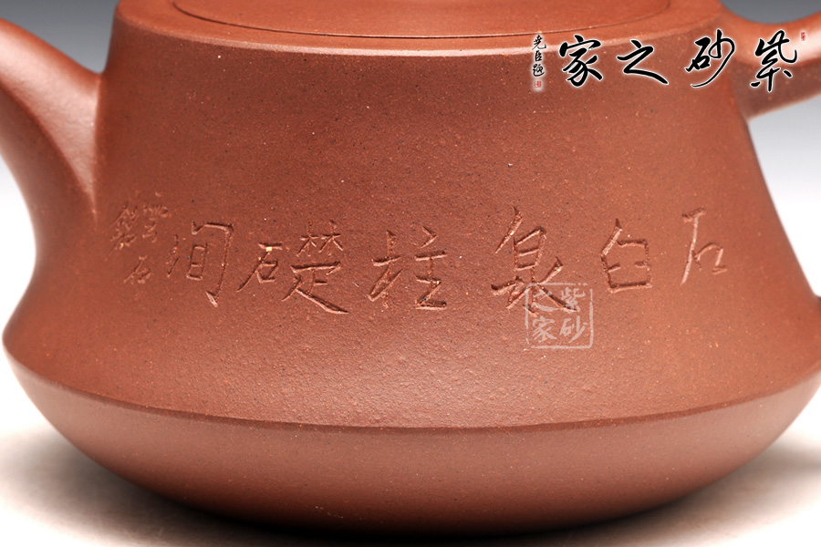 柱礎(chǔ)壺為清代韻石制,經(jīng)過后人演繹,尤其是老師們將個(gè)人對(duì)壺型的理解融入到壺中,如今的柱礎(chǔ)壺已大有不同。此壺選用原礦底槽清制作,做工很細(xì)致,色澤古雅,底蘊(yùn)十足。整款壺為柱形,上窄下寬,壺底如同一個(gè)盤子與壺身相接而成,壺身向內(nèi)凹陷,力蘊(yùn)十足。同時(shí),一變嘴扁平而修長(zhǎng),也是向內(nèi)凹陷,嘴口朝天,壺嘴上側(cè)為弧面,造型別致。而飛把呈倒耳形,拿捏方便。圓的子,嵌蓋,氣密性極好,歷久彌新,足見功力。該壺正面刻繪的是“石臼泉,柱礎(chǔ)間”。