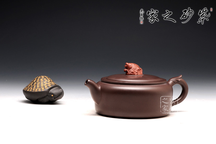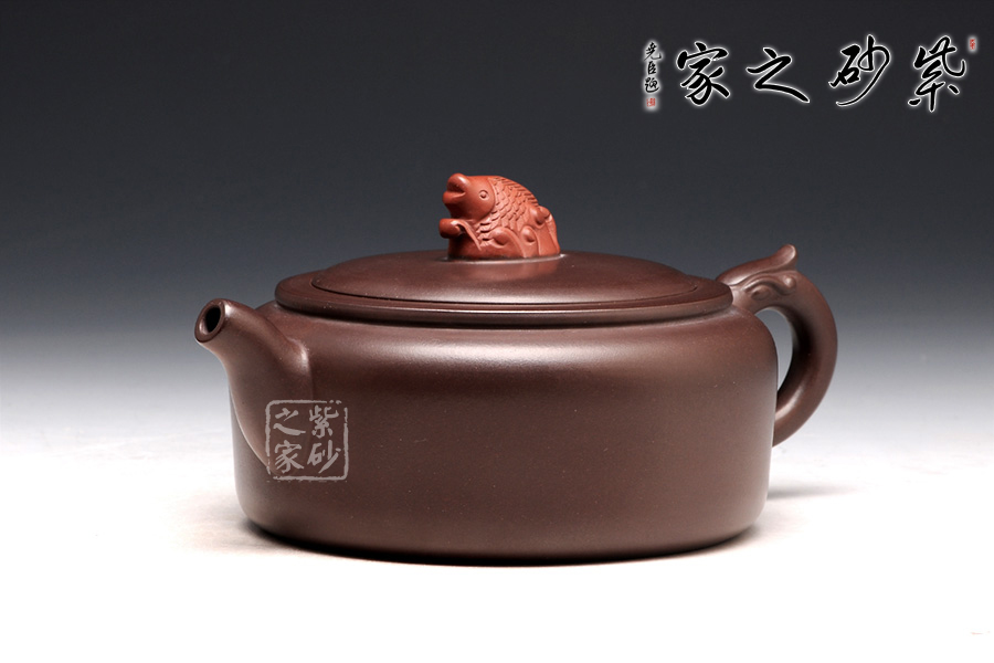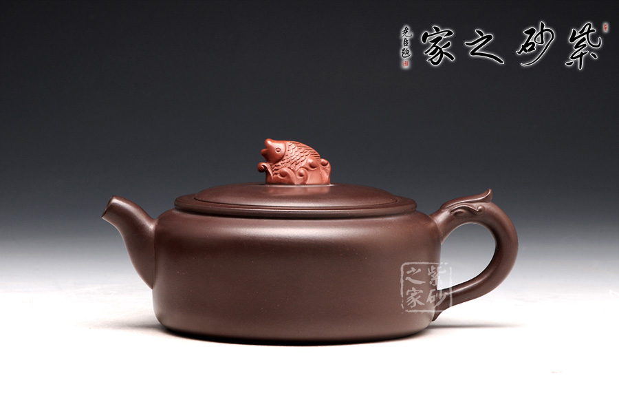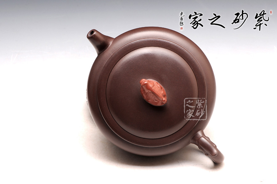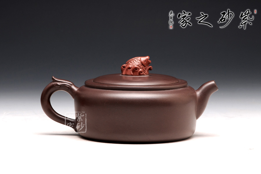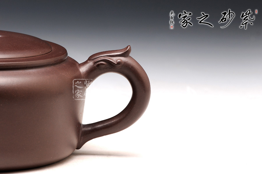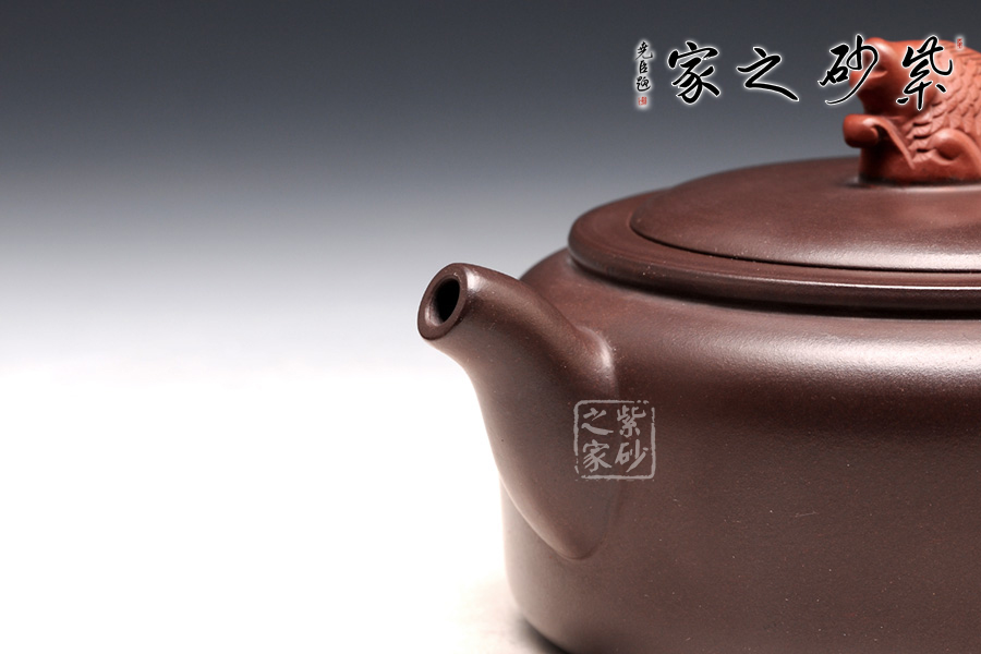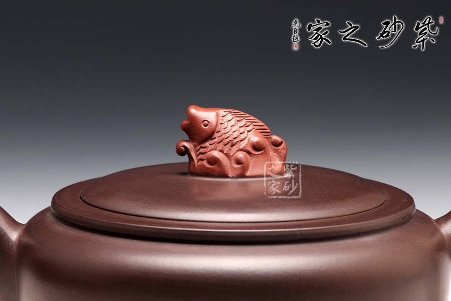 高升壺作為紫砂圓形光器,制作起來(lái)很能顯示工藝技巧和嫻熟程度,并且從藝術(shù)底蘊(yùn)中流溢文化趣味;原礦紫泥色澤沉穩(wěn),豐腴滋潤(rùn)的壺體,道法自然,妙化心造;壺身為扁柱形,簡(jiǎn)約大氣,壺口碩大,平蓋廣闊,壺鈕設(shè)計(jì)為“鯉魚躍龍門”,涌起的水浪簇?fù)碇庺~躍起,十分形象逼真;壺把為盤龍之形,輪廓飄逸,持握舒適;嘴型精巧,略富壺基,嘴口圓潤(rùn)平和,出水爽利。
