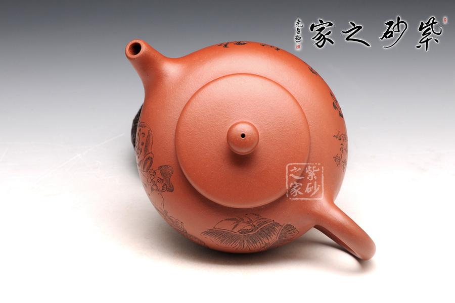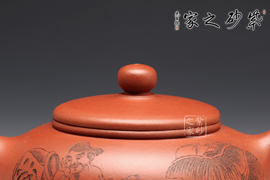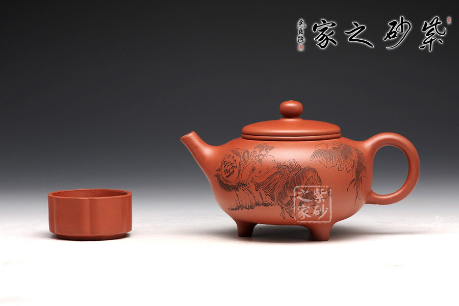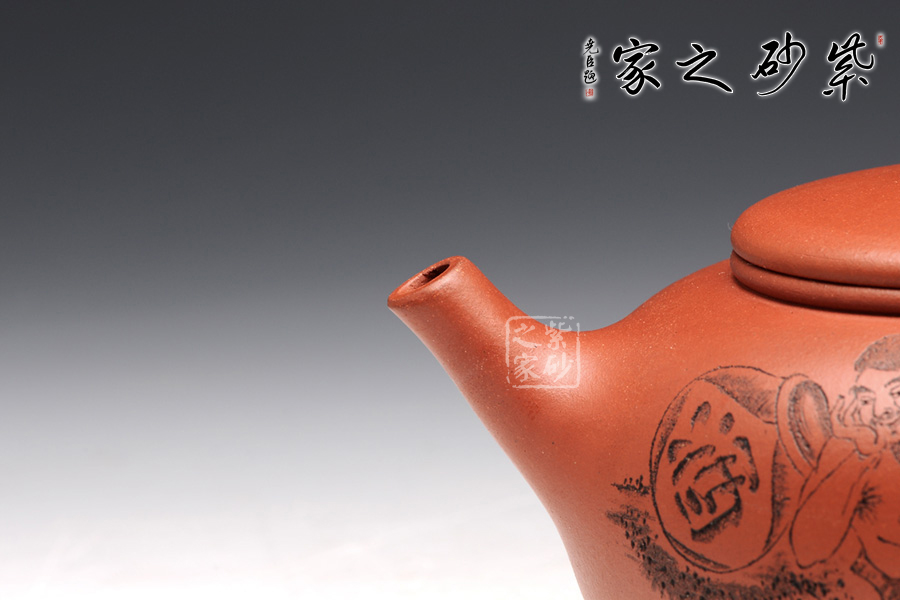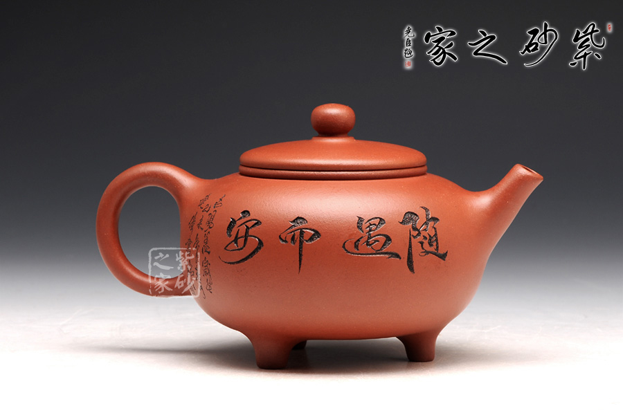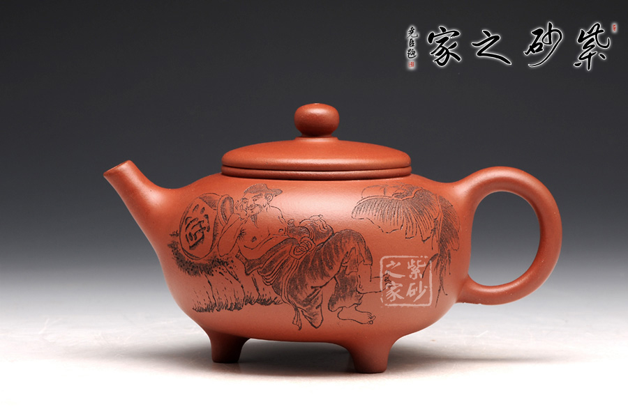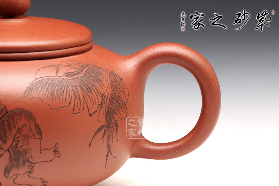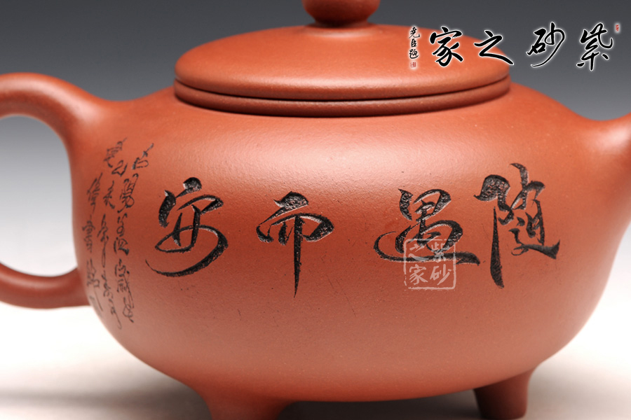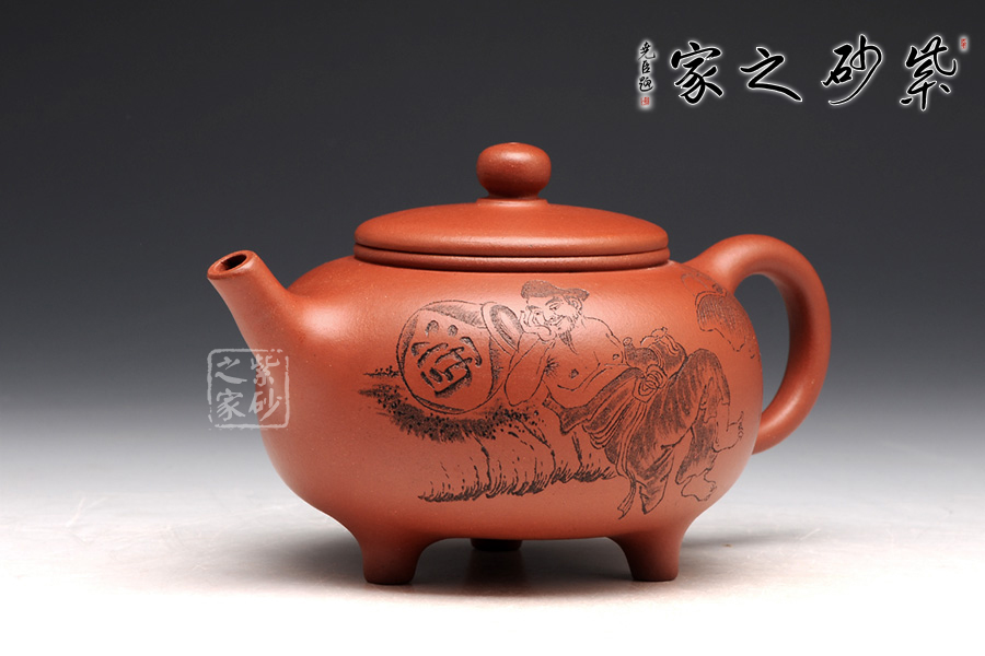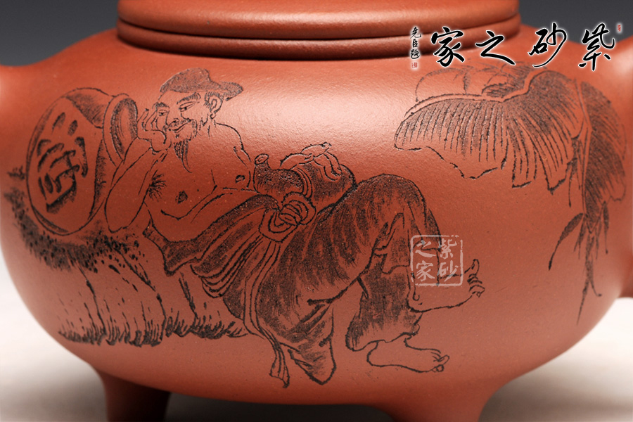 壺型皆用圓弧來展示,圓珠鈕、子母線、飽滿的壺身,平整的壺蓋,三足小巧平穩(wěn),耳形把渾圓均勻。壺嘴為直流,上翹的形狀可愛有趣。刻繪為朱建偉大師手筆,正面是捧著大酒缸的居士,背面是“隨遇而安”四個字,刻繪的筆畫生動有力,非常增色。