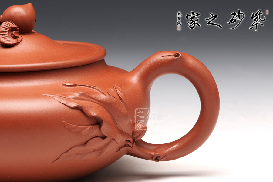 圣桃器型敦厚而穩(wěn)重,壺鈕為桃子造型,兩片桃葉舒展在兩側(cè),形態(tài)逼真,很是喜人;深入壺體,與飽滿的壺身切合恰到好處,壺身圓潤(rùn)飽滿,而在中國(guó)傳統(tǒng)文化中,“圓”往往是“圓圓滿滿”的意思,同樣表達(dá)吉祥祝福之意,與桃子的主題相得益彰。壺嘴和壺把桃枝裝飾而成,在壺把處一側(cè)伸出一條嫩枝,幾片綠綠的桃葉在壺身舒展開去,充滿生命的活力。