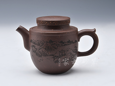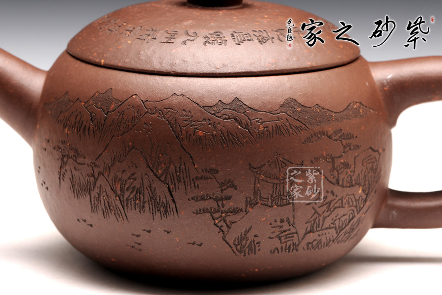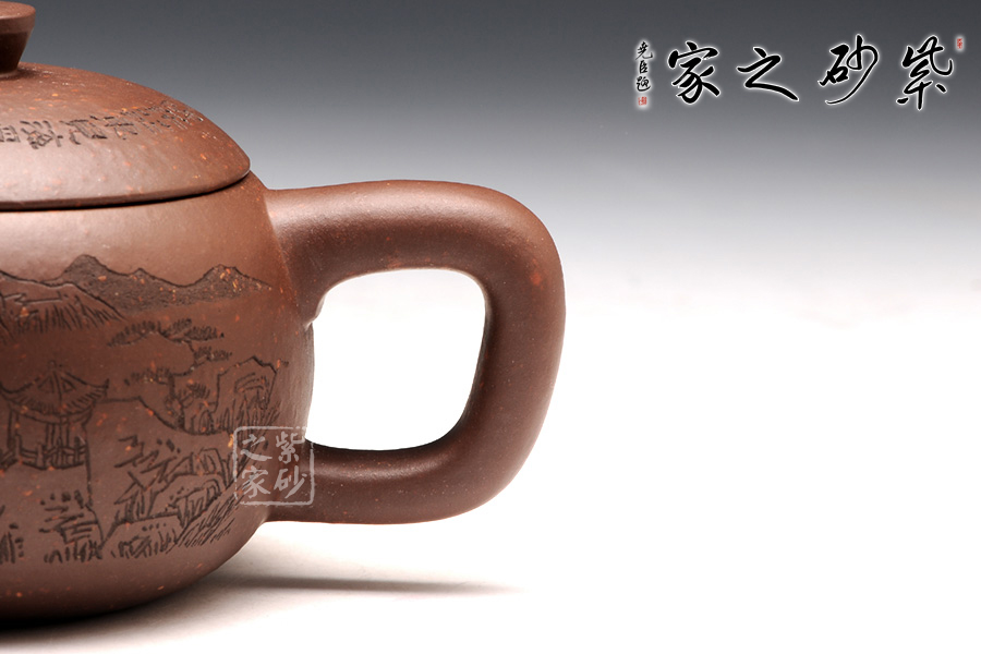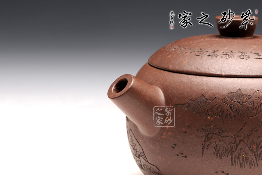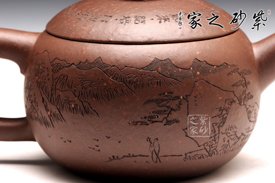 壺身所篆的山水畫及壺蓋上的詩詞,都由顧勤之父、中國工藝美術(shù)大師顧紹培親筆所題;壺身所篆刻的是一幅精美的山水風(fēng)景畫,崇山峻嶺間,飛鳥相與逐,云蒸霞蔚,氣韻蒼茫,篆刻極致細(xì)膩,傳神逼真;壺蓋上篆刻的是唐代大詩人李白的名詩《早發(fā)白帝城》,原文:“朝辭白帝彩云間,千里江陵一日還。兩岸猿聲啼不住,輕舟已過萬重山”。