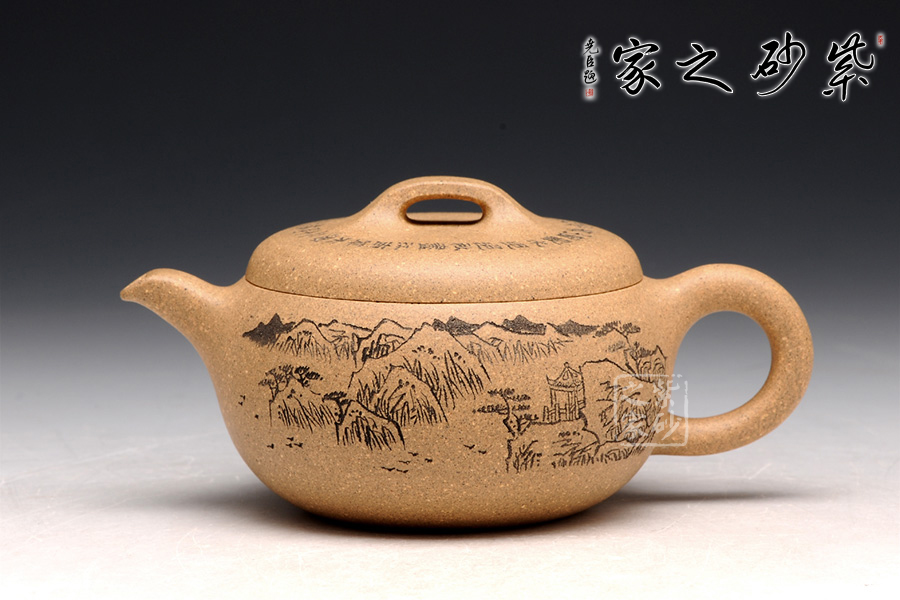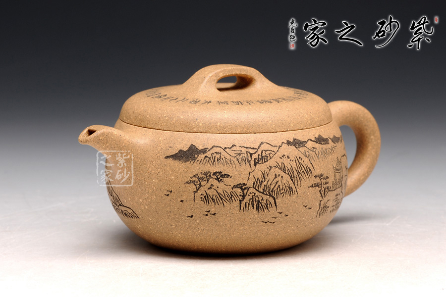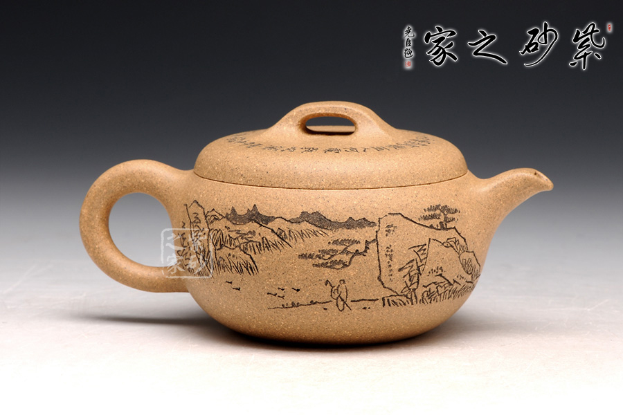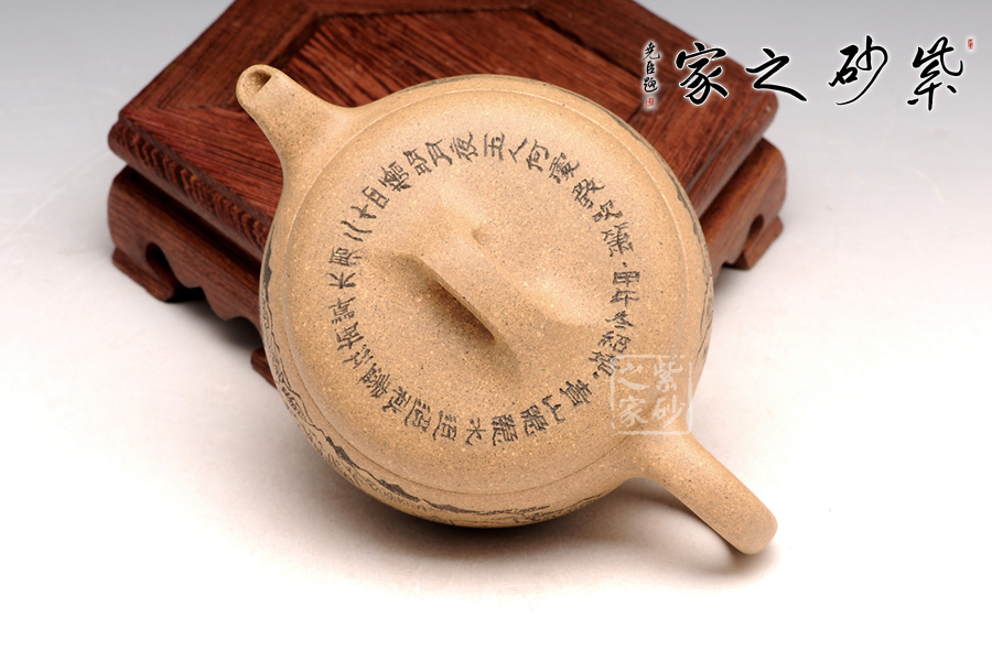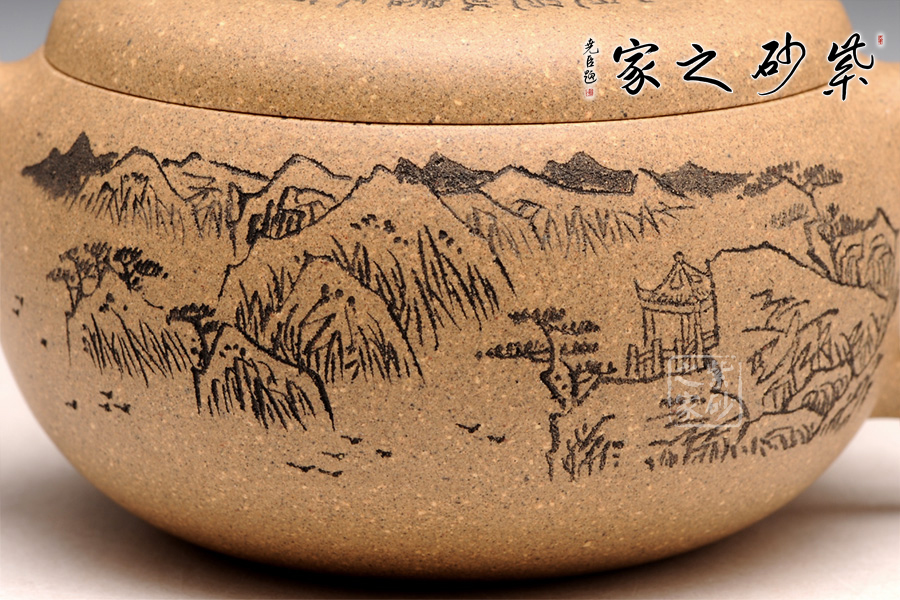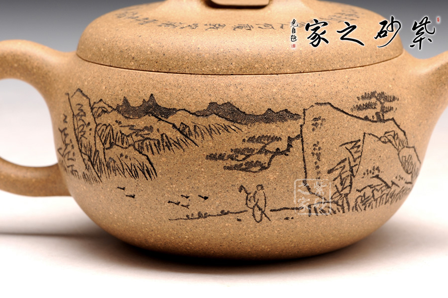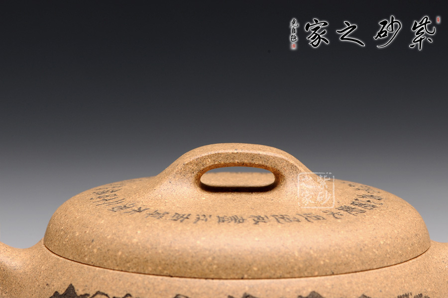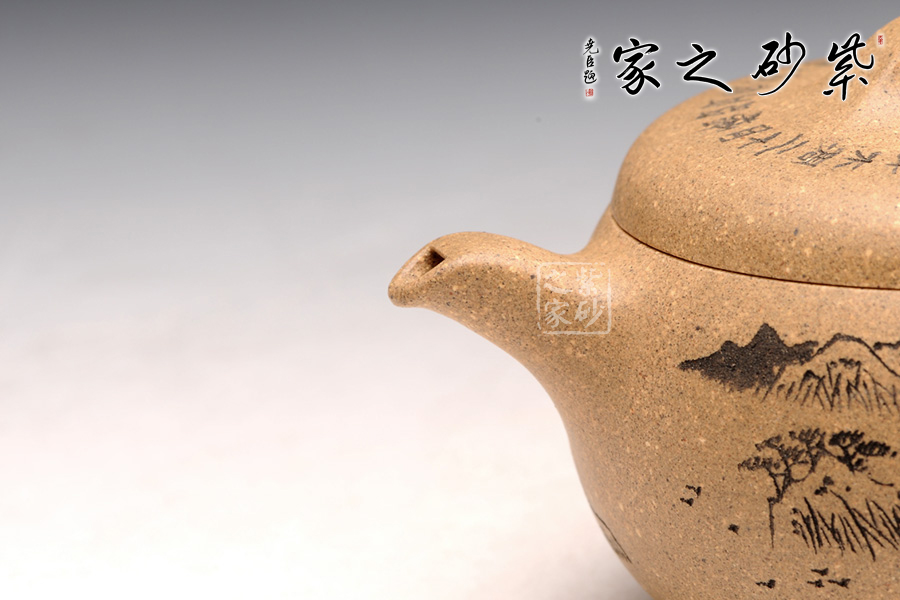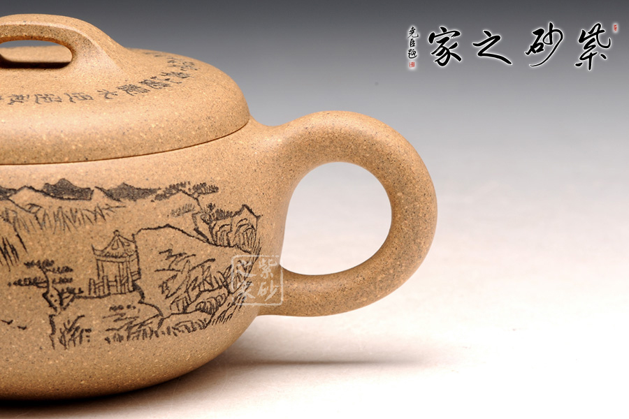 造型就是一只碗,上豐下斂且過(guò)渡柔和,外觀細(xì)膩,內(nèi)部平實(shí)。截蓋設(shè)計(jì),蓋上平整光滑,橋形鈕用方形演繹,愈發(fā)工整。耳形把爽利自然,彎流嘴簡(jiǎn)單胥出,爽利無(wú)阻。刻繪為顧紹培大師所做,山水畫(huà)高絕,對(duì)應(yīng)的詩(shī)詞則更富于古意,品之倍感享受。