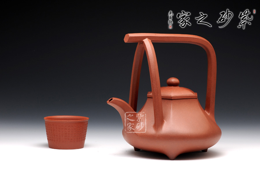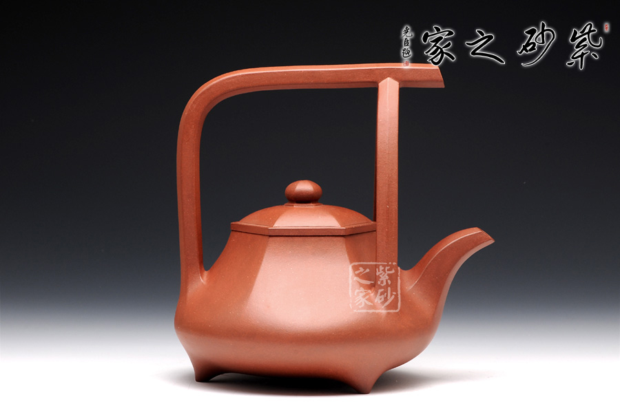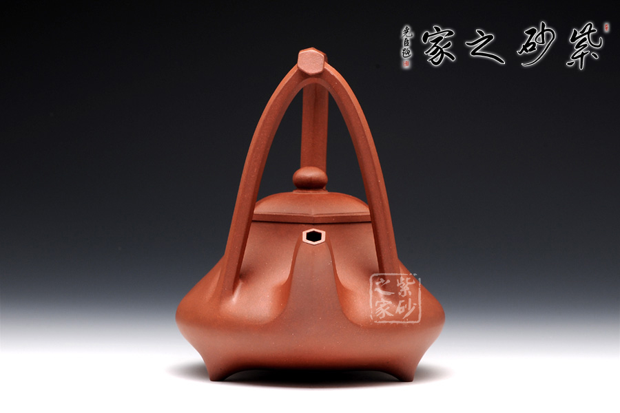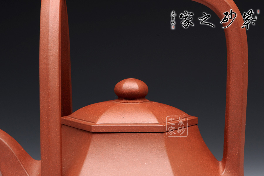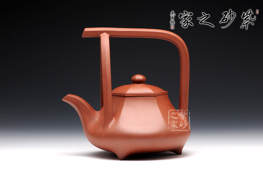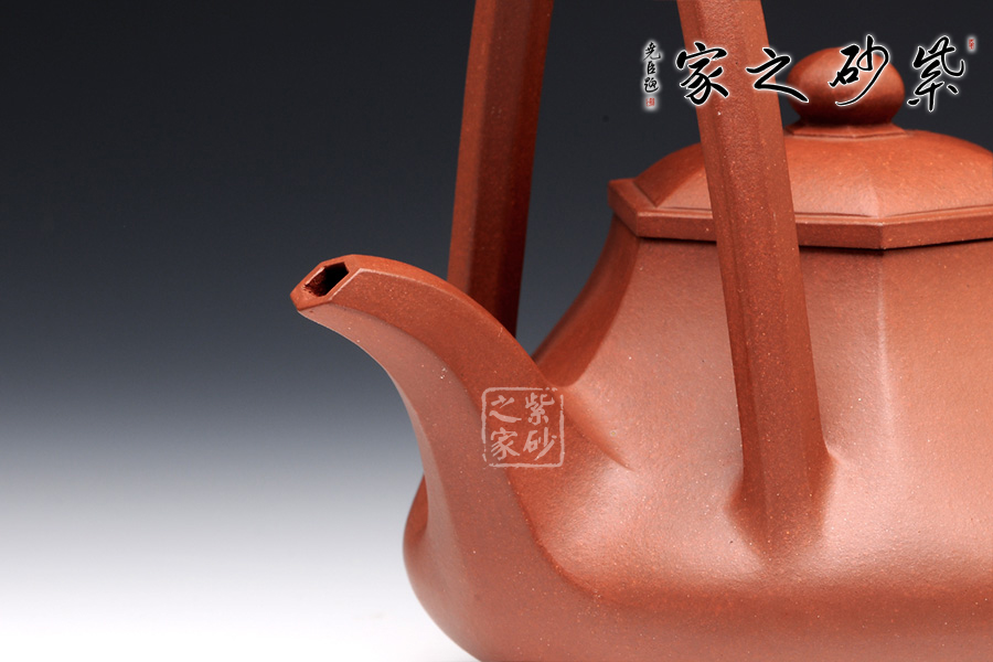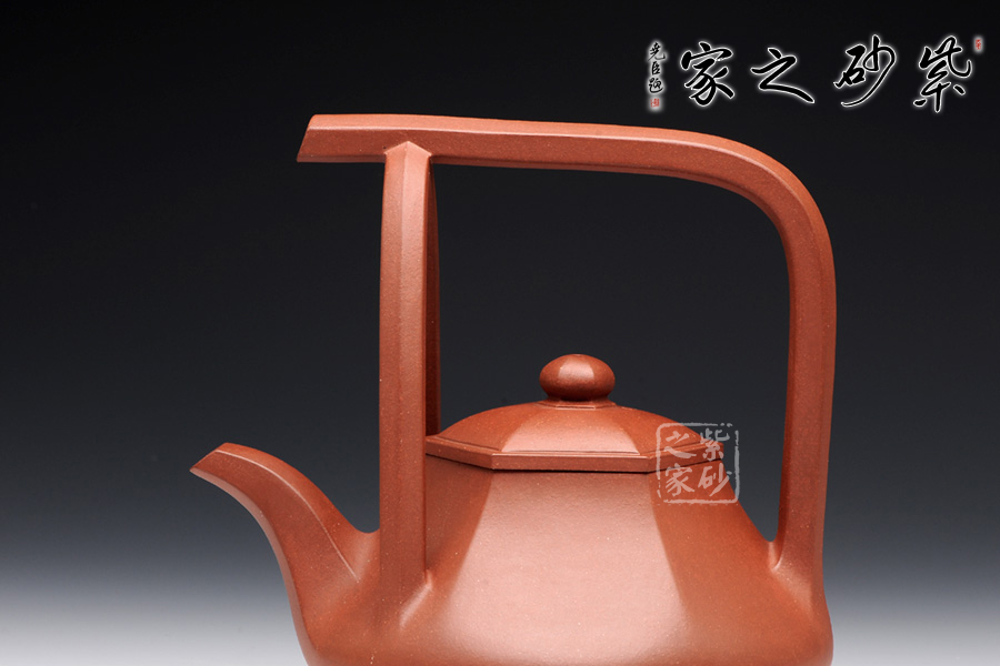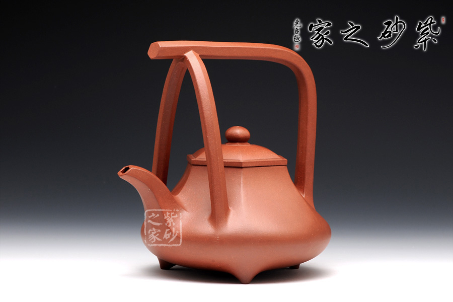 石瓢提梁是紫砂壺經(jīng)典壺型之一。該壺器形敦厚,大氣渾厚,線條流暢飽滿,提梁的空間感處理頗好,虛實結(jié)合,妙韻渾然天成。以方圓的結(jié)合再加入筆挺的線條,展現(xiàn)了非常優(yōu)雅的工藝美術。尤其特別的是彎流壺嘴推陳出新,其六方外形正好對應提梁把的簡練清晰,讓人有清晰的整潔感。