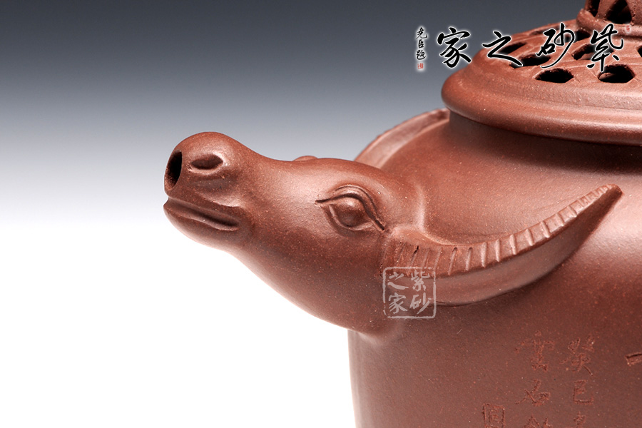壺型加入了經(jīng)典的田園生活元素,牧牛為壺嘴,制作精美傳神,讓人贊嘆不已。壺蓋是斗笠,鏤空的竹編形態(tài)讓人不禁想起田園。相對來看壺身就非常工整,方圓結(jié)合既有細(xì)膩,又非常大氣。壺把是牛尾巴,粗細(xì)漸變中可見力道。