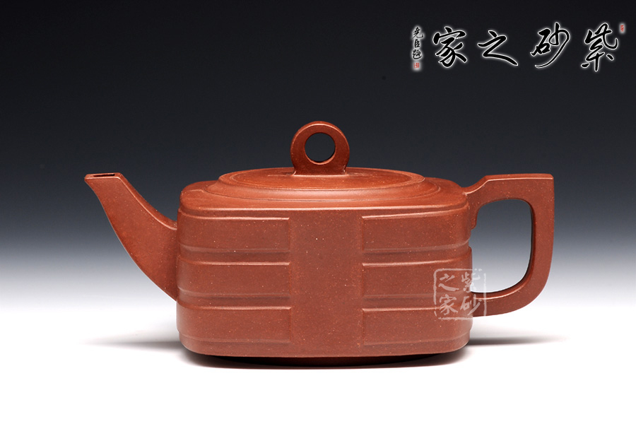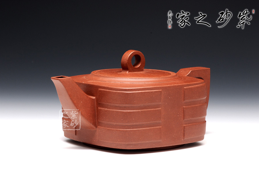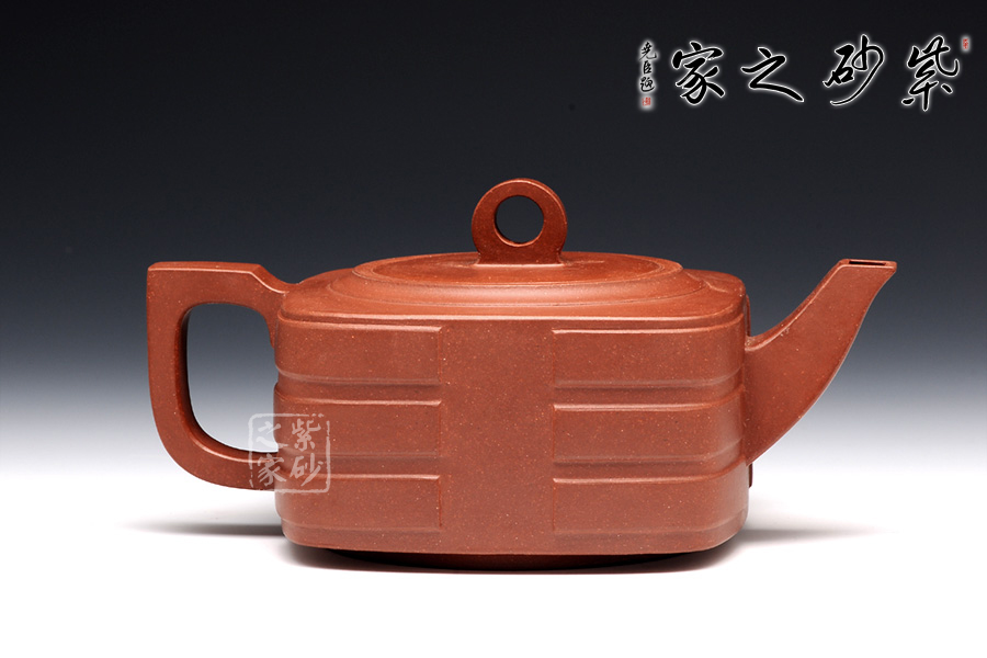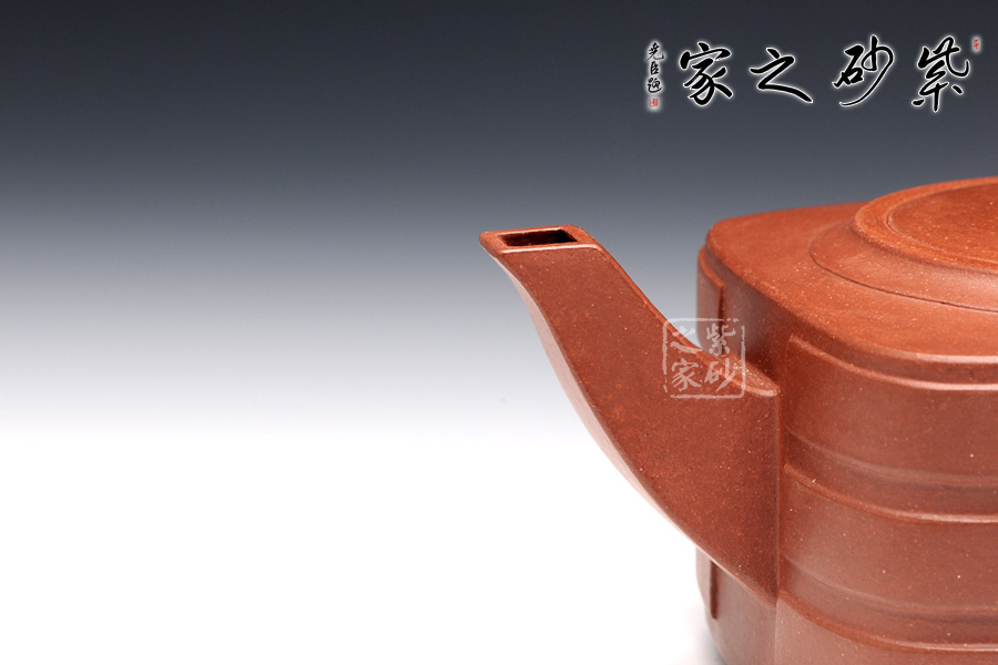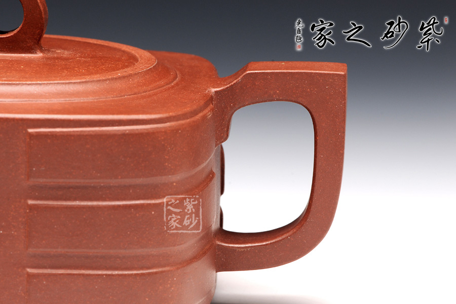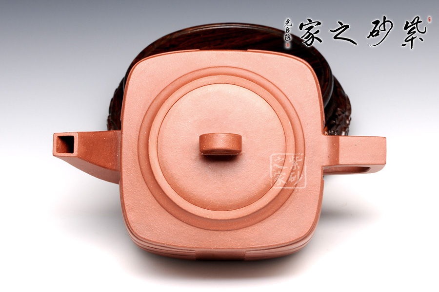 壺身是正方體形態(tài),棱角被巧妙地隱藏,正是方圓結(jié)合的形狀。壺身上加了線條分割,筆挺大氣,更有老味。壺嘴、把和鈕的制作都秉承了一貫的風(fēng)格,線條爽利卻有四方型來規(guī)整,氣息內(nèi)斂且悠長,給人以滄桑渾厚的感受。