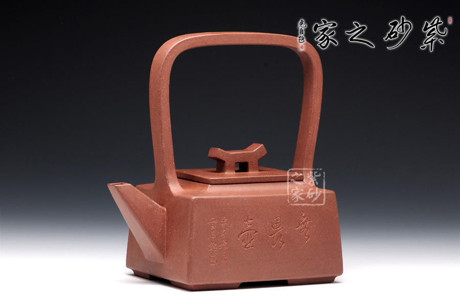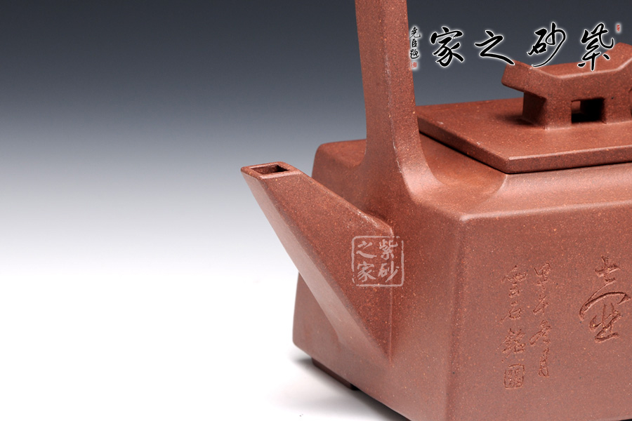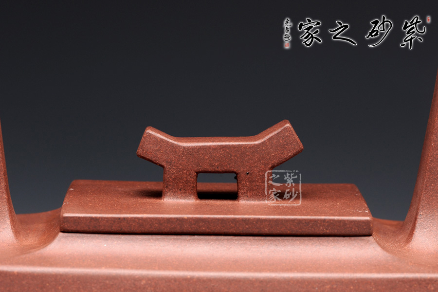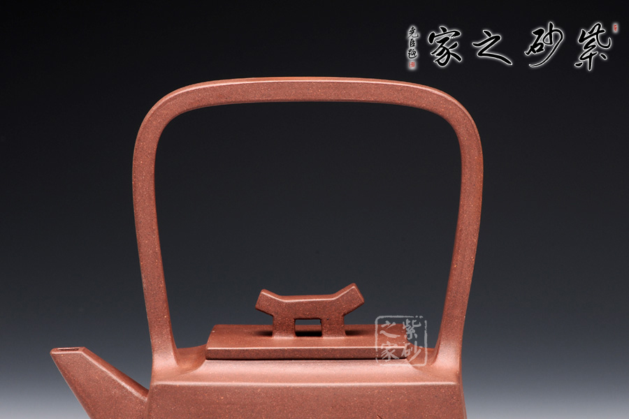 壺身主體為梯形,線條橫平豎直,底足平穩(wěn)大氣,肩部用弧線過渡,工整里又帶著柔和。壺蓋平整簡潔,橋形鈕兩端上翹,四方型大氣沉穩(wěn)。壺嘴是直流,尖角在口部拉直,平實自然。提梁在上部分營造出另一個空間,棱角隱藏從而展現(xiàn)出對應(yīng)的柔和感來,上下對應(yīng)更顯突出。