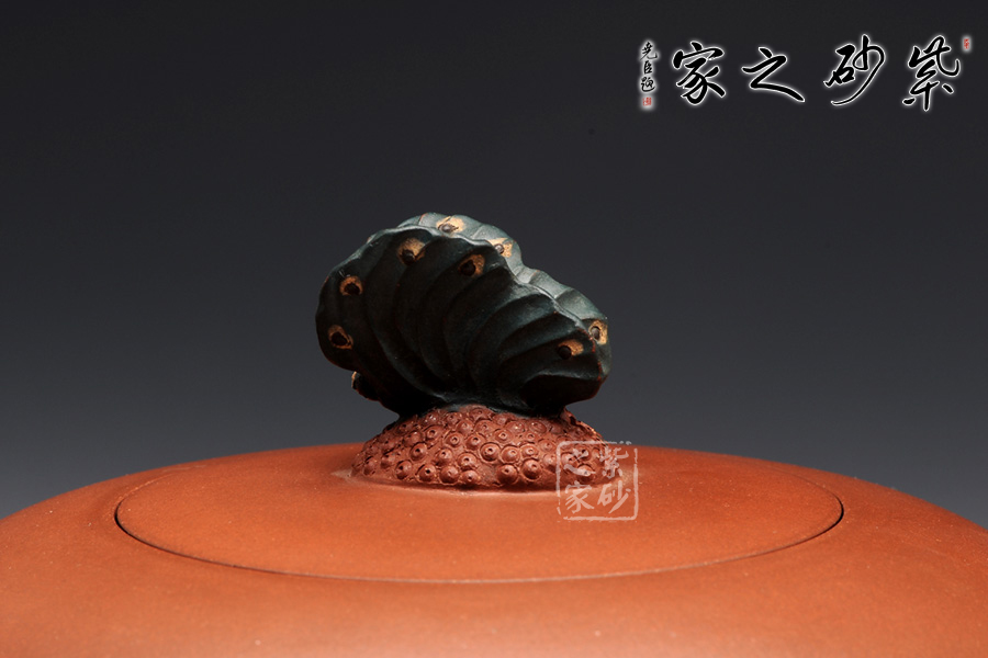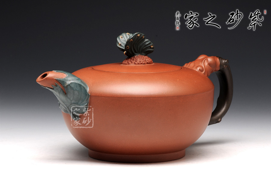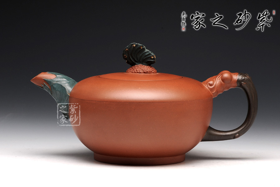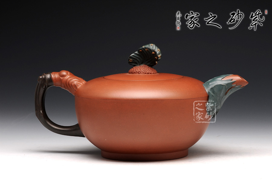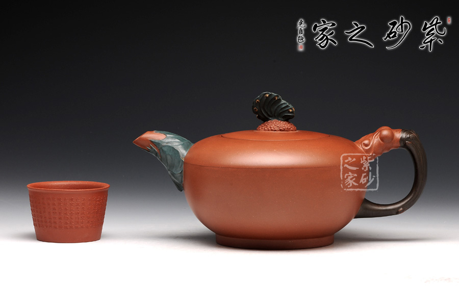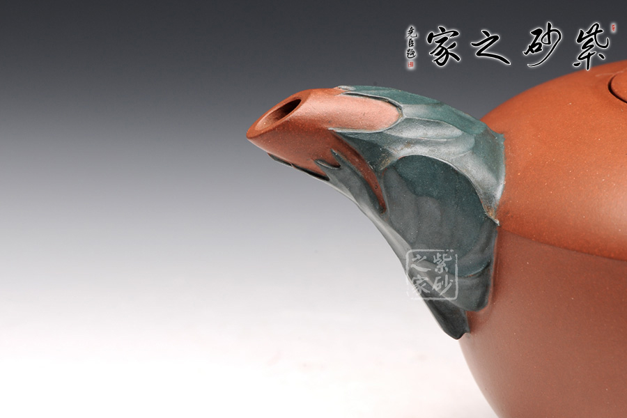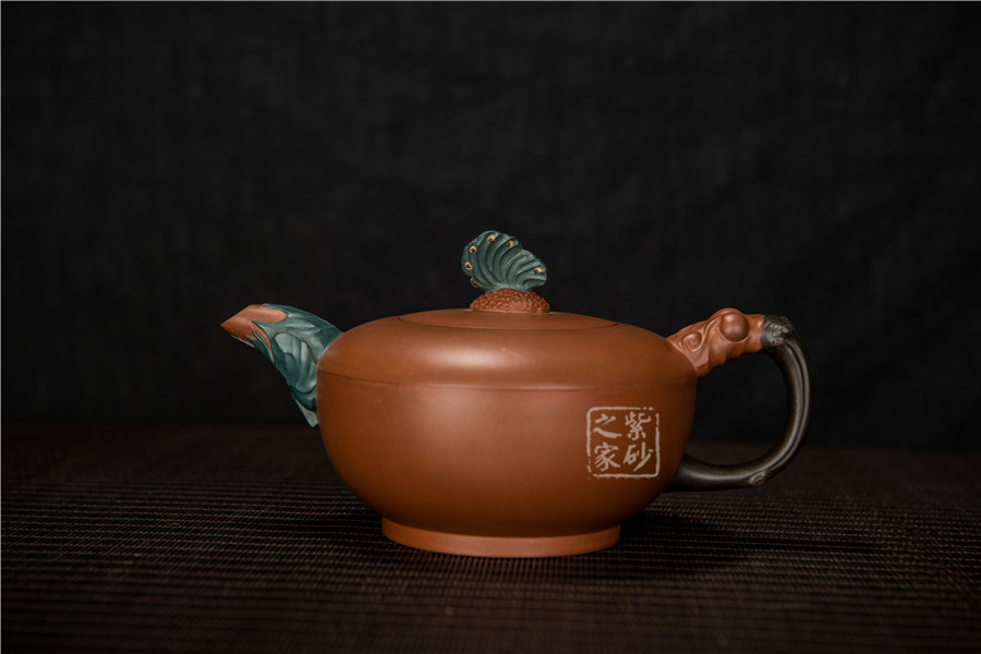 朱可心老師曾制作一款彩蝶壺,吳培林老師所制之示與其有異曲同工之妙,此款花蝶可謂高雅脫俗,人見(jiàn)人愛(ài),此壺造型令人第一時(shí)間想到的是《蝶戀花》。此造型與線條非常浪漫抒情,從壺型看,取花香蝶至之意,花蕾結(jié)于蓋頂,蝶撲于花蕾之上為蓋鈕,以簡(jiǎn)托繁,有壺靜蝶動(dòng)搖藤卷葉之勢(shì)。同時(shí)它也折射出了作者“心隨蝶兒上九天”的喜悅心情。