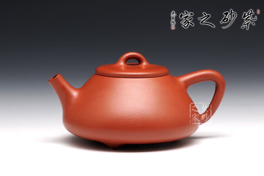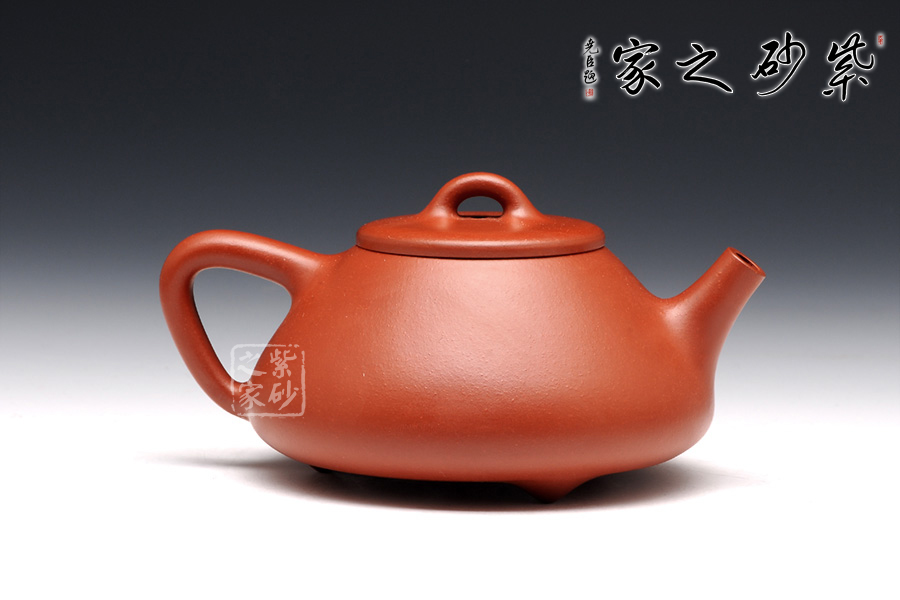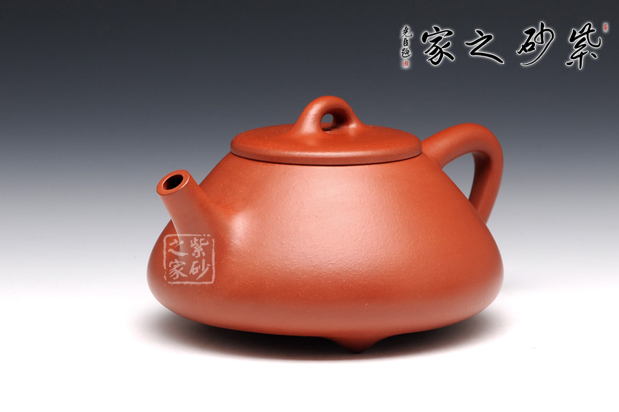 石瓢壺造型簡練,敦厚調(diào)和,壺身圓潤,線條柔和, 壺嘴為修長的直流嘴,暗接手法與壺身相連,環(huán)形壺把同樣采用暗接手法與壺身相連,而壺嘴與壺身兩者遙相對望,相對稱。愛壺者如果再仔細(xì)看,可看出整個壺型呈由兩個等腰三角形結(jié)合而成,首先壺身是大三角,而壺鈕內(nèi)是小三角,相當(dāng)穩(wěn)重的三角形再加上三乳足鼎立,整個器型便更加穩(wěn)實。