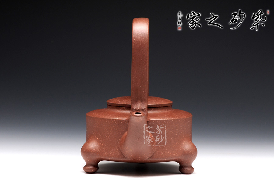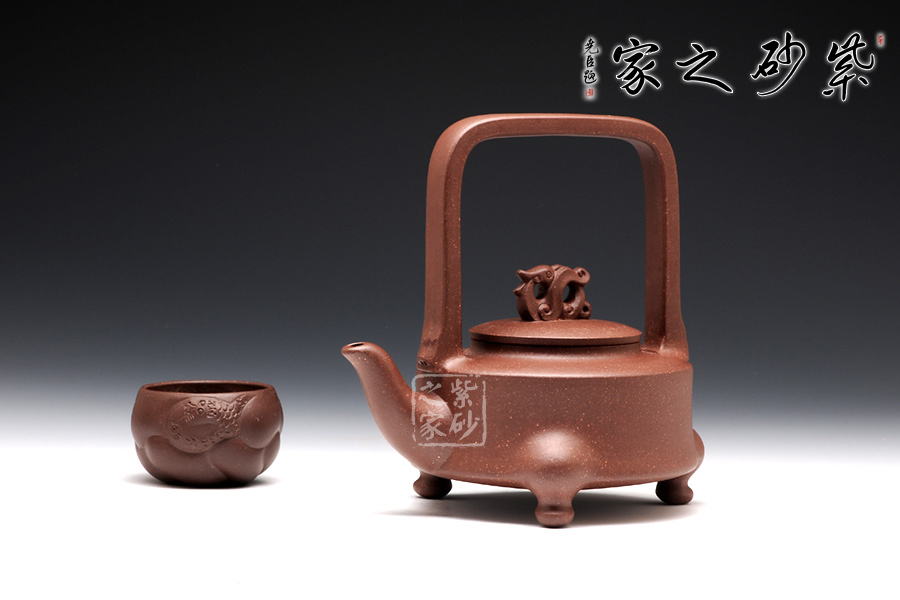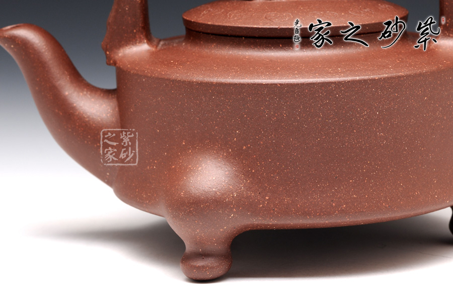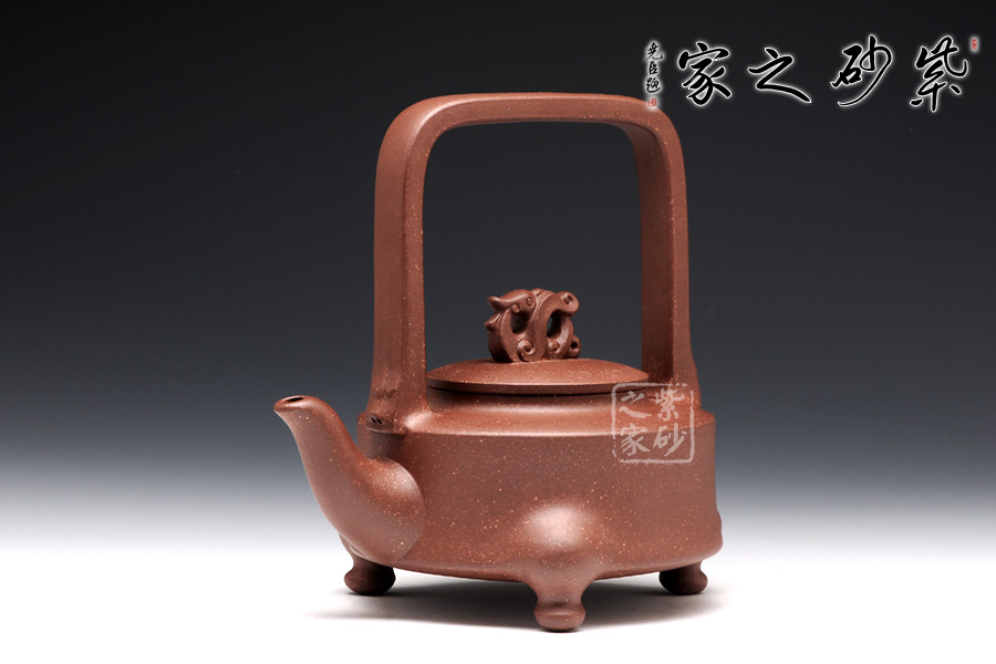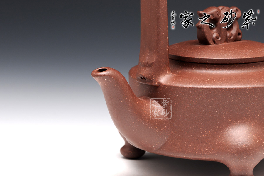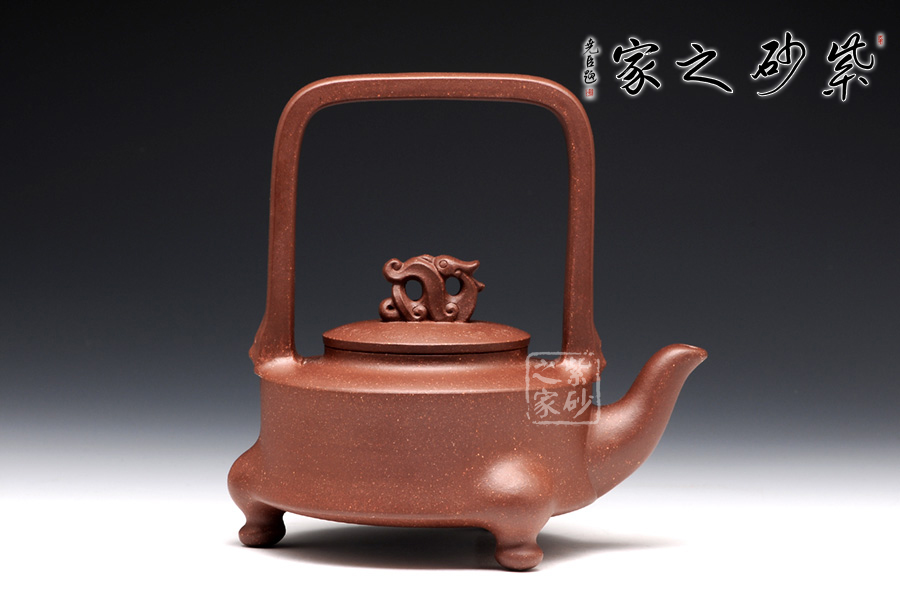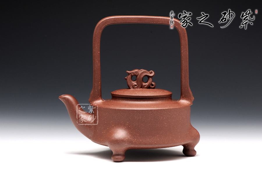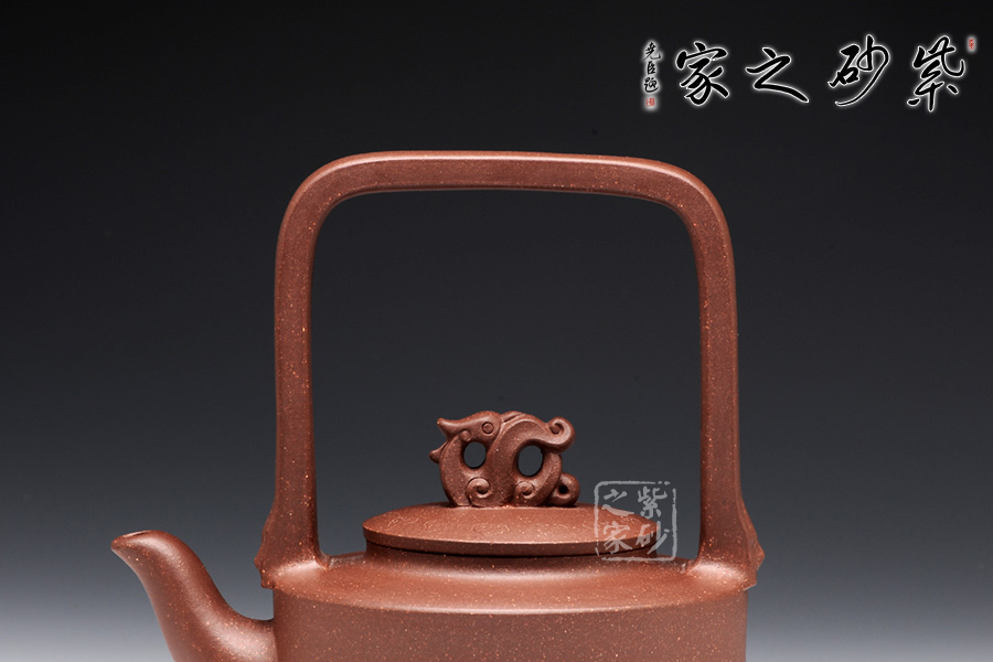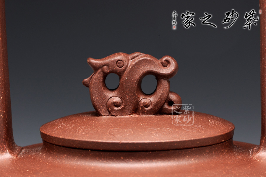提梁的虛實(shí)對應(yīng)把握得非常精確,上下兩層空間所占的比例恰到好處。三足對應(yīng)方形提梁,其古典意味更加凸顯。龍鈕和彎流嘴共同把線條美感展現(xiàn)出來,品之意味無窮。壺蓋和壺身的分層設(shè)計,線面配合默契,轉(zhuǎn)折和對應(yīng)鮮明亮眼,功力深厚。