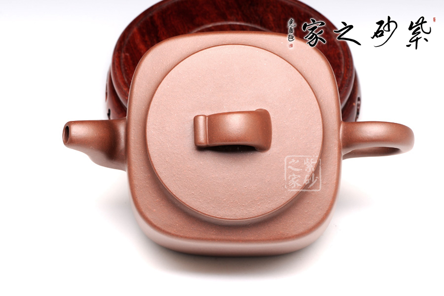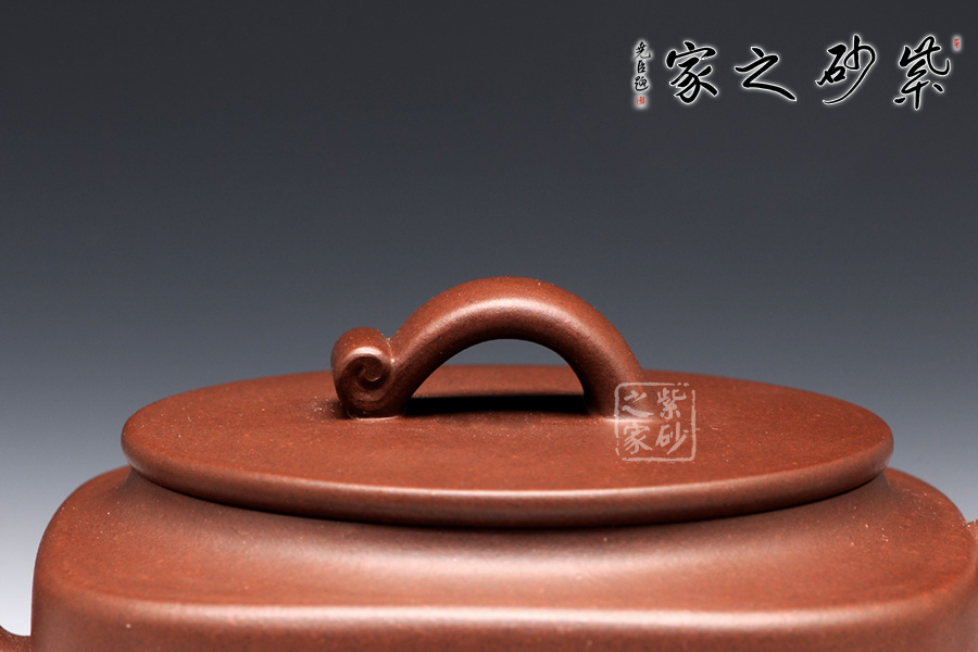 此壺方中寓圓,圓中見方,大有古意。原礦紫泥所制,色澤明潤光潔。壺身為圓角方柱體,短而敦實,沉穩(wěn)老意。圓形壺蓋,大蓋,短坡頸,圈足與口蓋一致,橋形壺鈕做如意狀,甚有韻味,觀之入眼。彎流、圈把,都是方形。彎流做外撇狀,橫向虛空間頓生。壺把與之應(yīng)和,不失均衡感。
