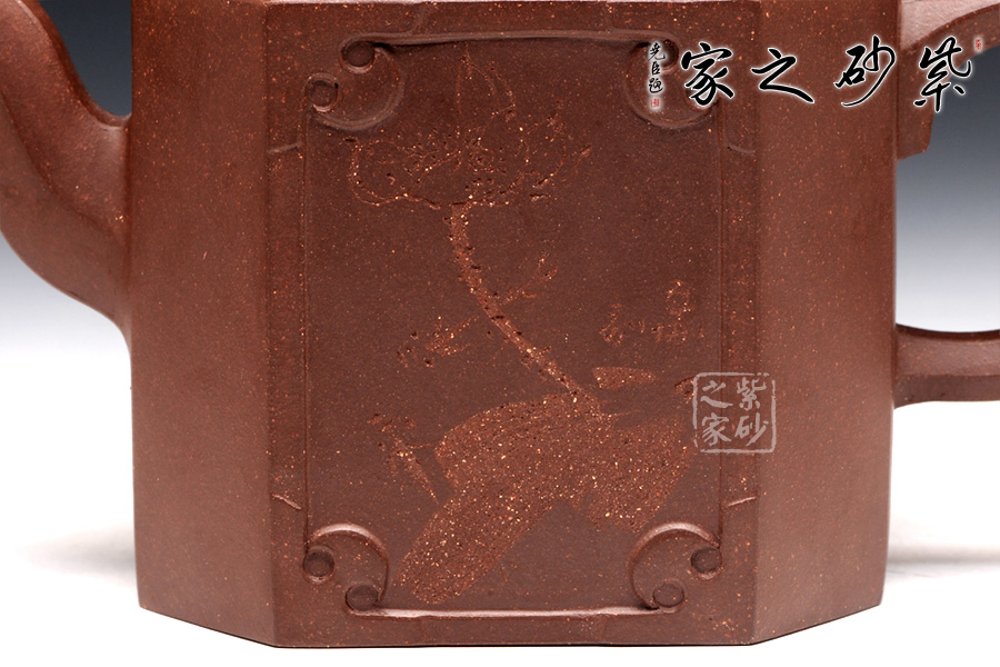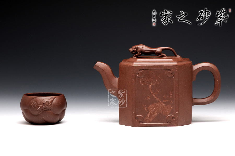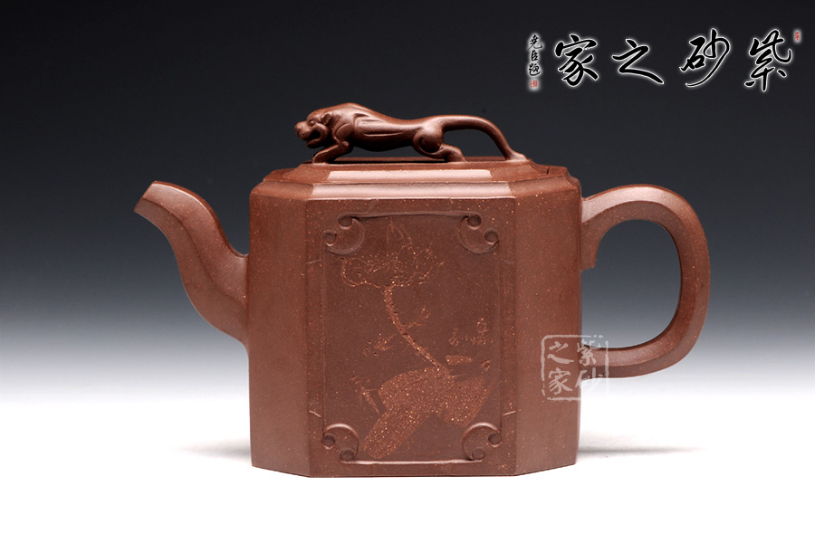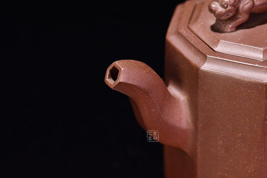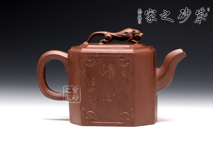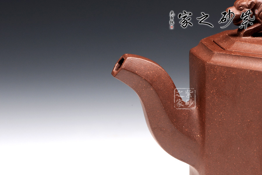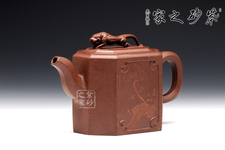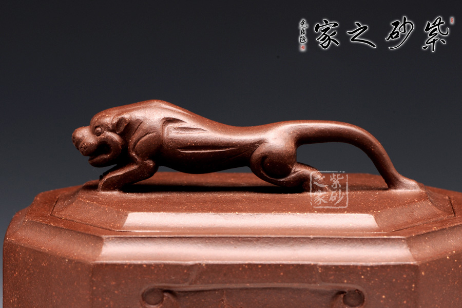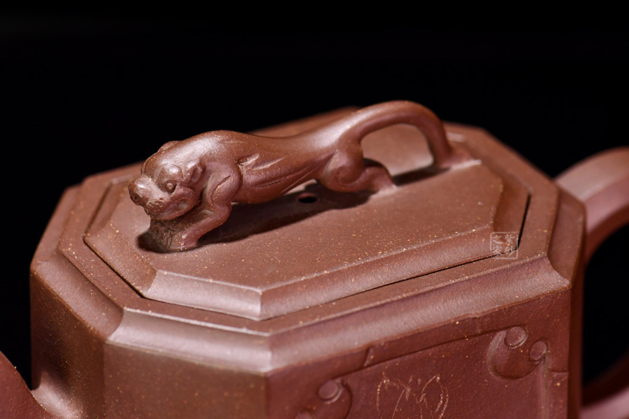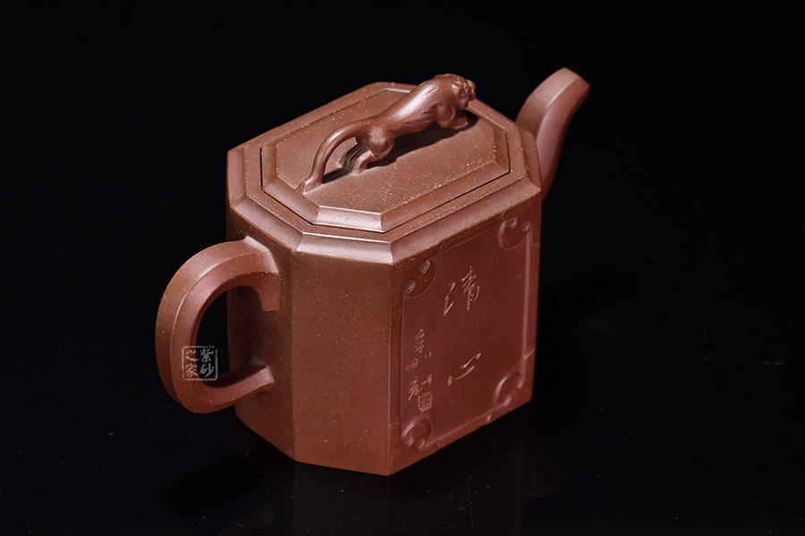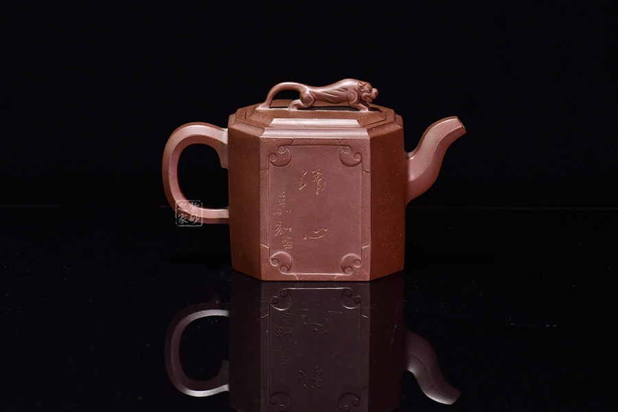 此壺名為獅尊,顯得沉穩(wěn)霸氣,拿捏穩(wěn)重。該壺是典型的方壺,高挺大氣,氣韻軒昂,挺括有力,方正有型。壺嘴和壺把的設(shè)計與壺身相應(yīng)成趣,呼應(yīng)主題。整個壺最大的亮點在于壺鈕的精美設(shè)計和壺身精細(xì)雕刻。壺鈕為一只伏身向前的雄獅,生動富有趣味,置于整壺之上,傲視群雄。同時,壺身正反兩面分別展示刻繪字畫,如同古時的屏風(fēng),極具美感,吉祥喜慶,精品之作乃饋贈首選!