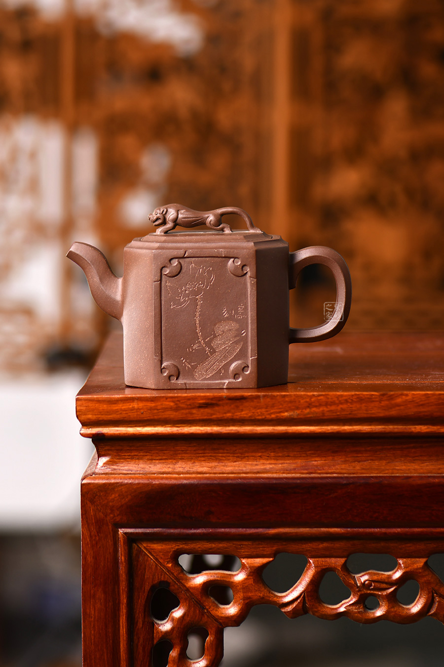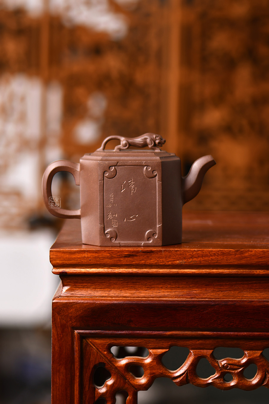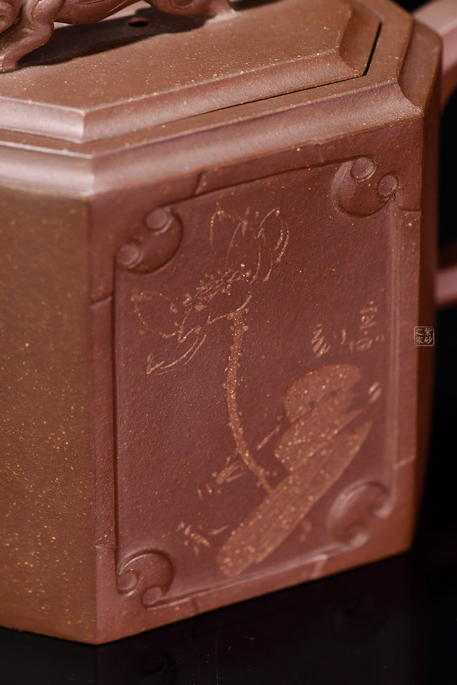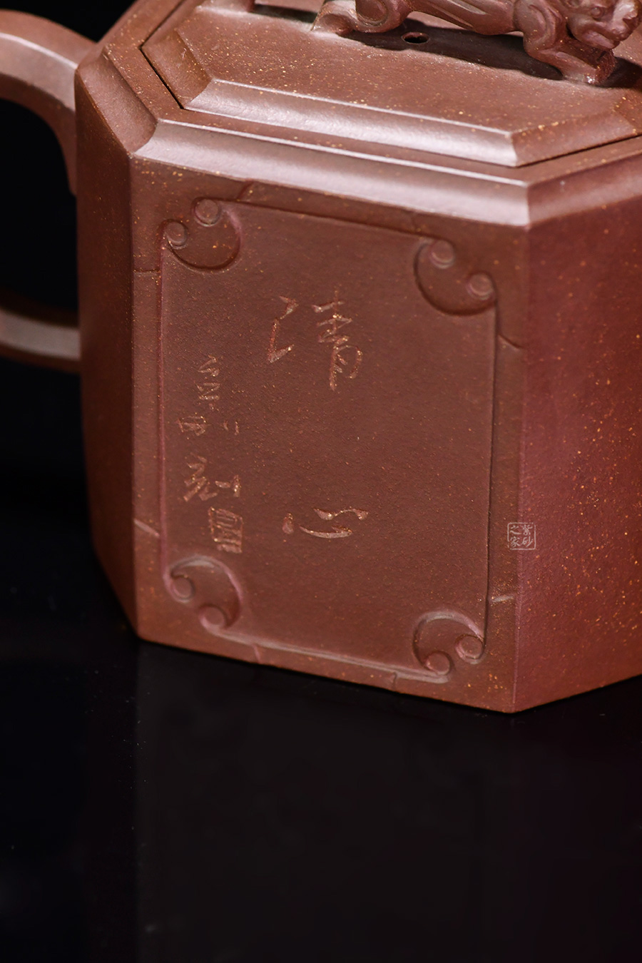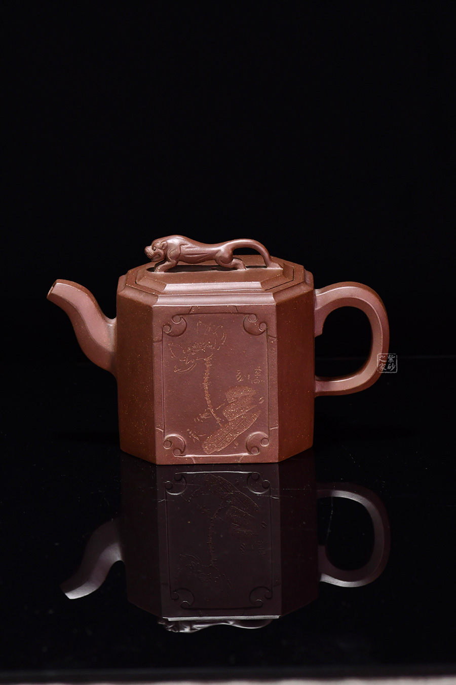 此壺名為獅尊,顯得沉穩(wěn)霸氣,拿捏穩(wěn)重。該壺是典型的方壺,高挺大氣,氣韻軒昂,挺括有力,方正有型。壺嘴和壺把的設(shè)計與壺身相應(yīng)成趣,呼應(yīng)主題。整個壺最大的亮點在于壺鈕的精美設(shè)計和壺身精細(xì)雕刻。壺鈕為一只伏身向前的雄獅,生動富有趣味,置于整壺之上,傲視群雄。同時,壺身正反兩面分別展示刻繪字畫,如同古時的屏風(fēng),極具美感,吉祥喜慶,精品之作乃饋贈首選!