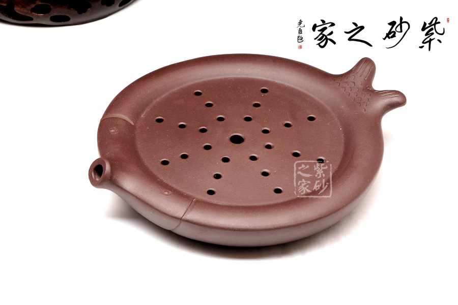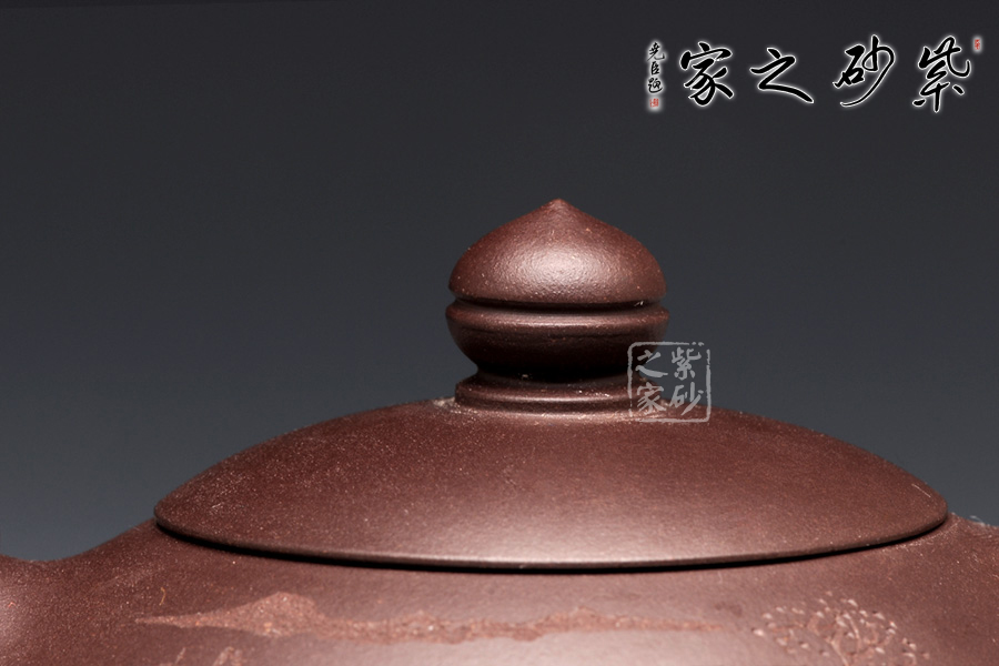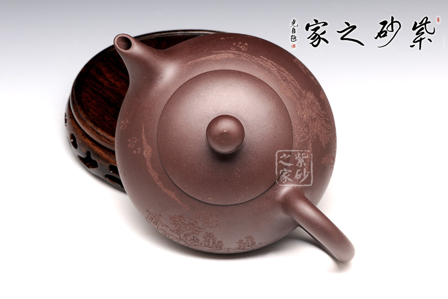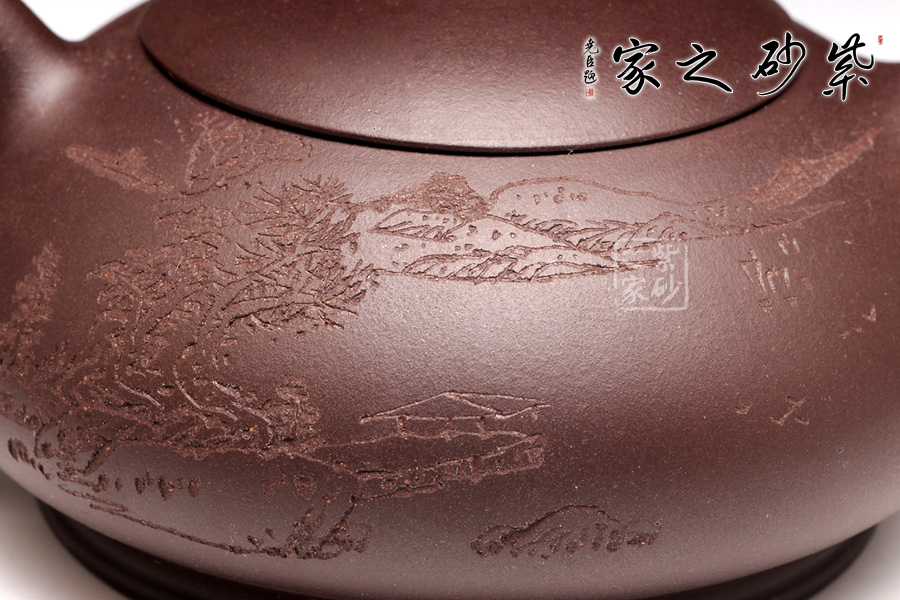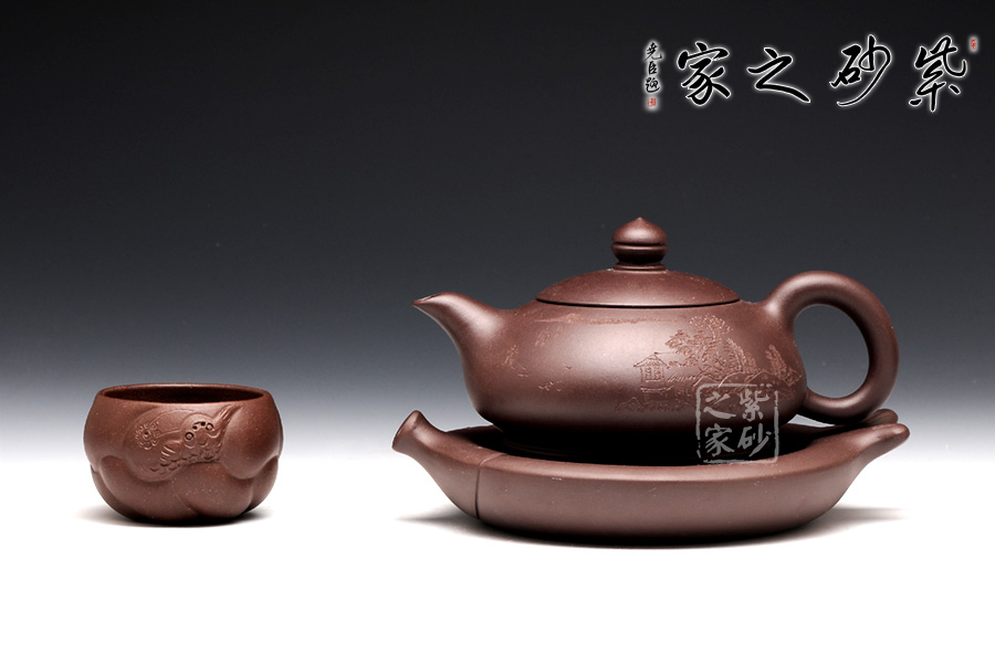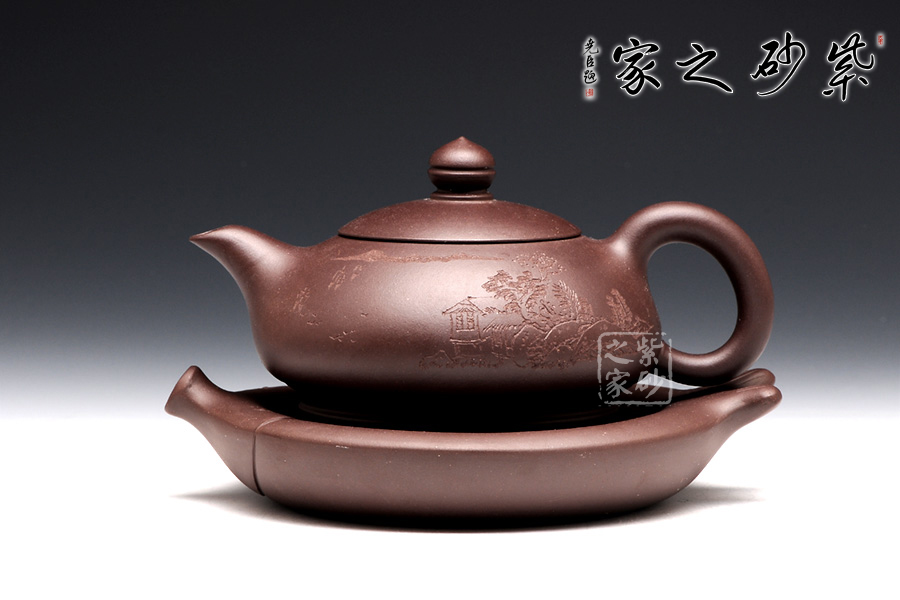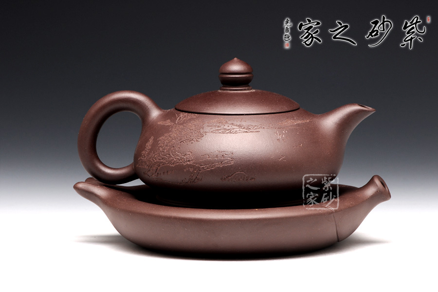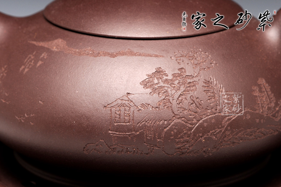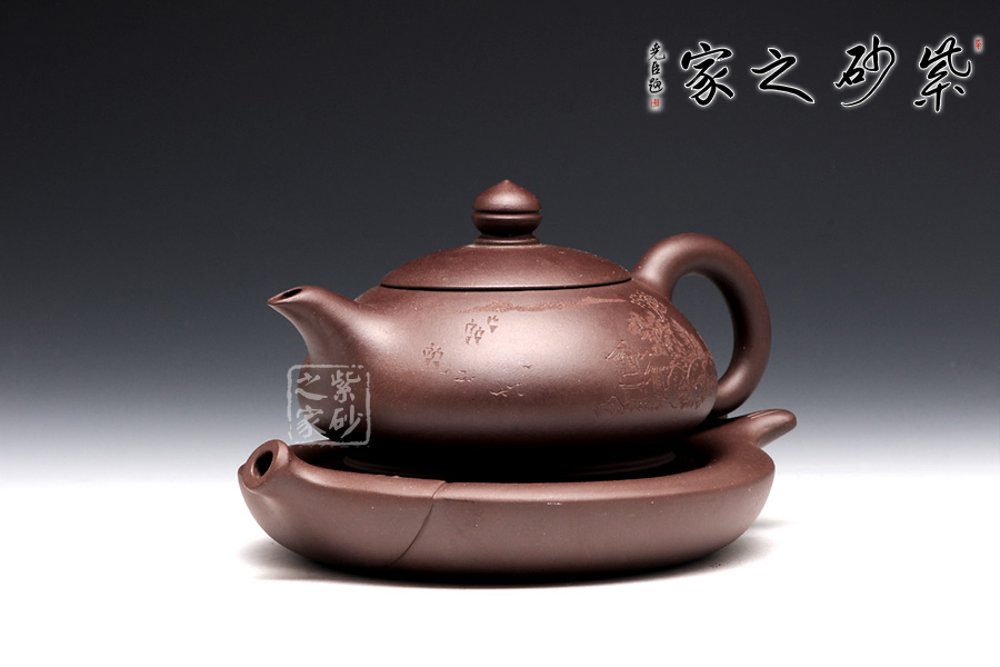 此壺泥質(zhì)純正,通體一色,砂質(zhì)細膩,撫之,溫潤滑若無骨肌膚;設(shè)計新穎,制作精湛,同時設(shè)計了一個壺托,為魚的造型,寓意“年年有馀”;一壺、一托,相映成趣,別出心裁的創(chuàng)意,集陶瓷造型美、紫砂材質(zhì)美、中華茶韻美、古典詩詞美與書法陶刻美,“五美”于一體;散發(fā)出淡淡的書香、茶香、翰墨香,令人心醉;古雅雋美,質(zhì)地細膩,造型端莊,有賞心悅目之感;壺身由盧寧剛老師親自操刀篆刻,正反兩面好似兩岸遙江對望,山野田趣之景。