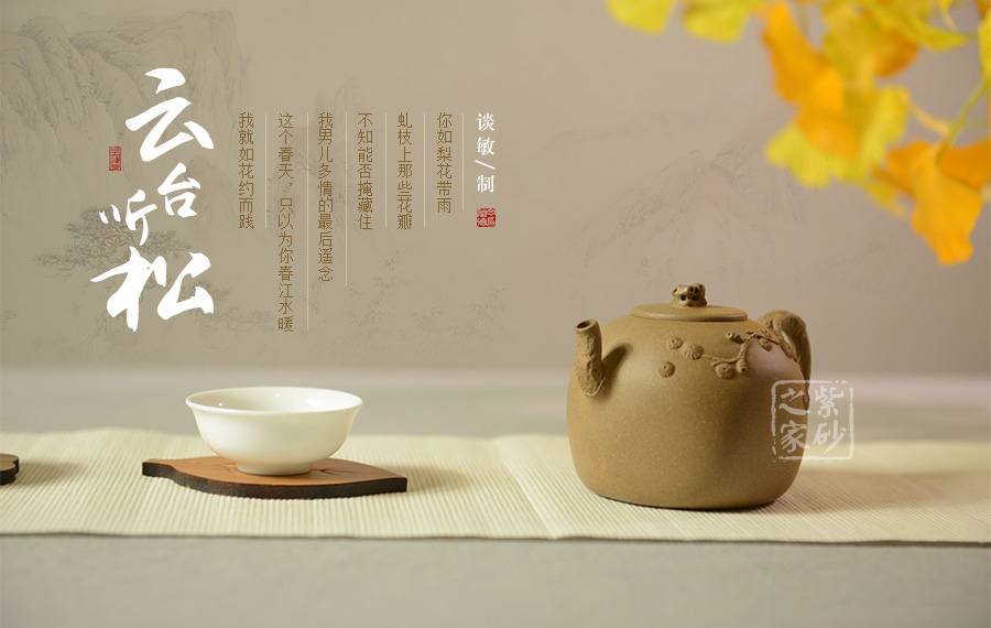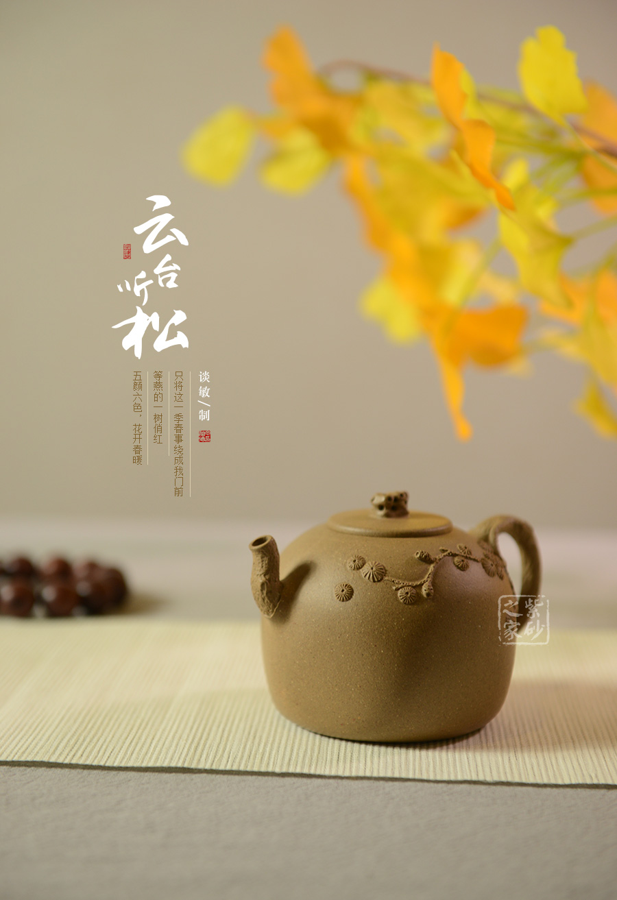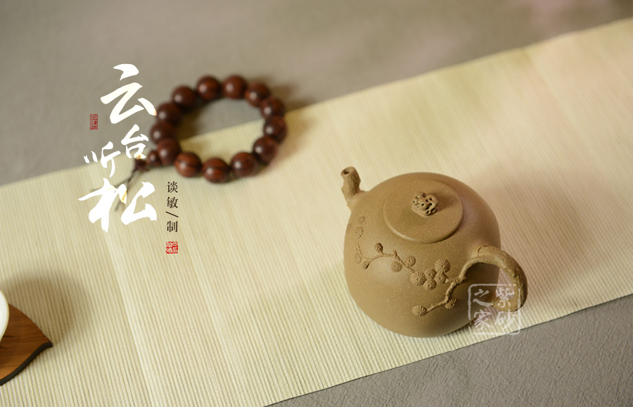 細看此壺,不禁令人想起一句詩:“靜臥云臺且聽松,不爭道旁苦李果”,與這作品對照,真是形意俱佳。厚重飽滿的壺身如同一座高山,壺嘴、壺把設計成松枝造型,便如同一顆松樹是高山懸崖邊旺盛的生長著,擁有頑強的生命力;壺蓋設計較為平坦,壺蓋之上以鏤空手機設計的壺鈕似那云臺上的亭臺,精致非常。談敏老師手工制作的此壺造型雅致,很有文人風韻,值得細細品味把玩!