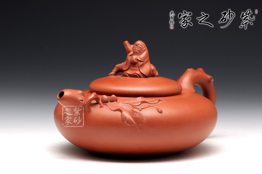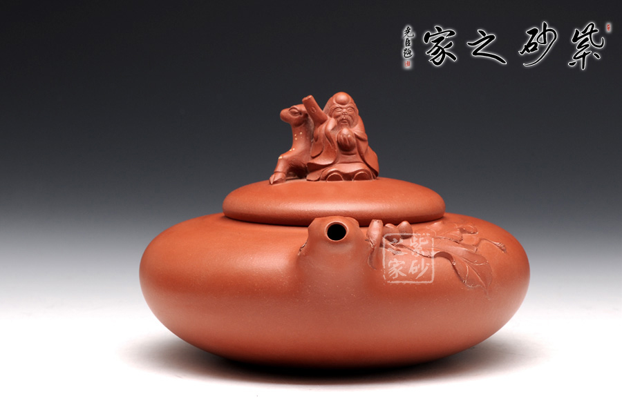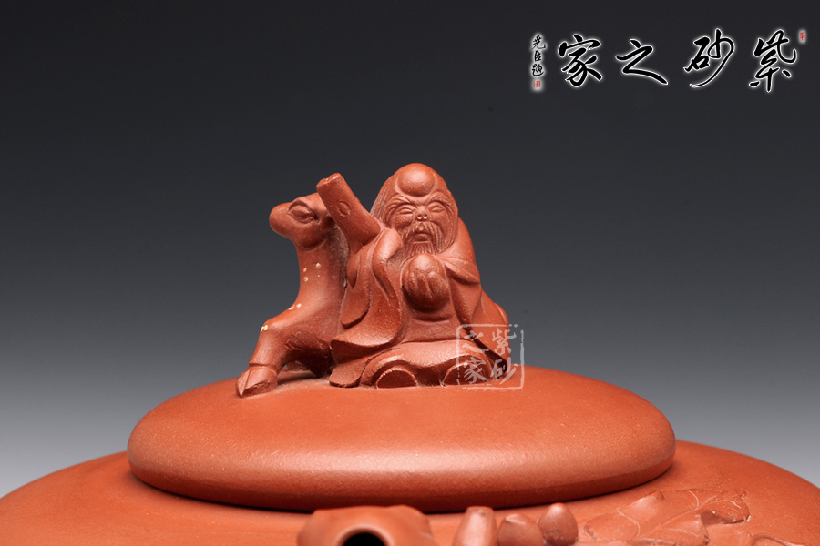 藝術(shù)家多愛將傳統(tǒng)文化融入作品中,壽星翁作為中國古老文明中不可缺少的一份子,又有著極好的寓意,自成為藝術(shù)家的青睞。此款作品壺身較扁,橫向空間感強(qiáng),極具張力;形雖扁卻氣度軒昂。加之桃枝的點(diǎn)綴,更是藝術(shù)盎然。壺鈕老壽星翁靠于靈鹿旁,可謂福祿雙全。光素器與花貨相結(jié)合,整件作品更具生命力