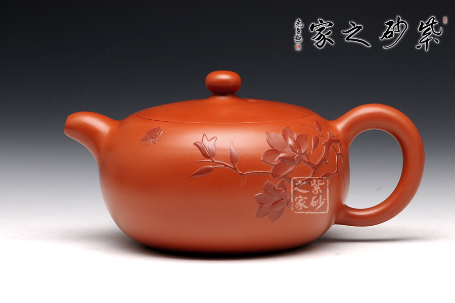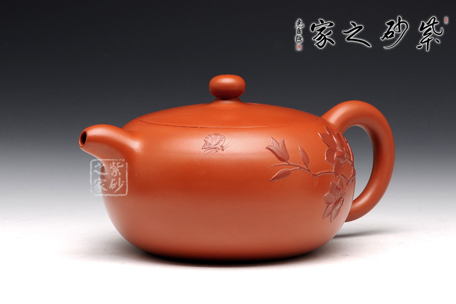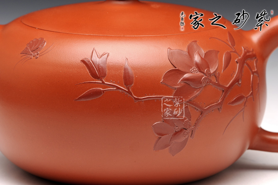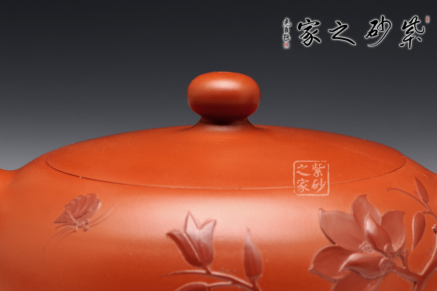 此壺選用原礦朱泥,整個造型古樸典雅,做工精細,從不同的角度均可見作者不凡的功力,壺身圓潤飽滿,光澤柔和,尤其壺口與壺蓋的配合恰到好處,與壺身如同一體,可見其技藝非同凡響。壺身泥繪彩蝶花舞,花卉生動柔美,氣韻渾然天成,意境柔和。使得整個作品氣韻高雅,叫人愛不釋手!