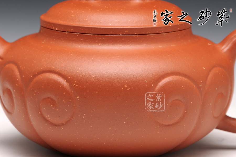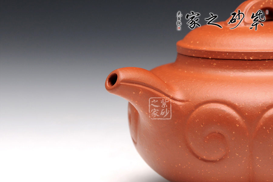 從壺體上來說,整器敦龐周正,猶如謙謙君子,力蘊(yùn)內(nèi)中,壺頸淡化。鋪砂工藝精美絕倫,而且能夠在泥色的襯托下呈悠然、典雅之美。