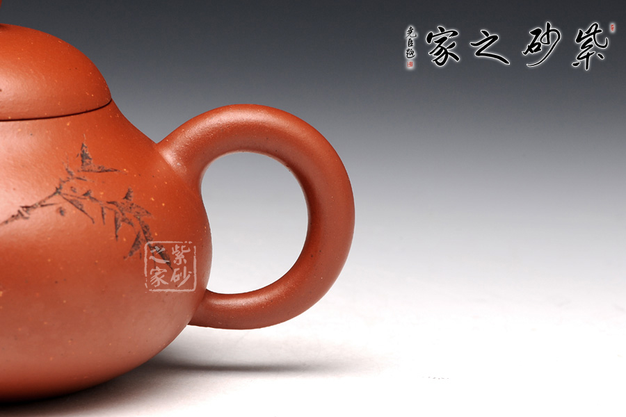 壺身狀似梨,鼓腹,圓韻,蓋拱起與器身相切,壓截蓋,貫氣融為一體,圓鈕有的腳,結(jié)構(gòu)交代清晰。三彎嘴朝天,嘴根與流口粗細變化不大,出水孔位網(wǎng)孔,形制有明顯的清中期手工捏造法所致。圈把,粗細均勻,底向里凹為包地圈。與器身渾為一體,整器造工精確,梨式造型,樸素清雅,用以泡茶品茗,尤為茶人所喜愛。