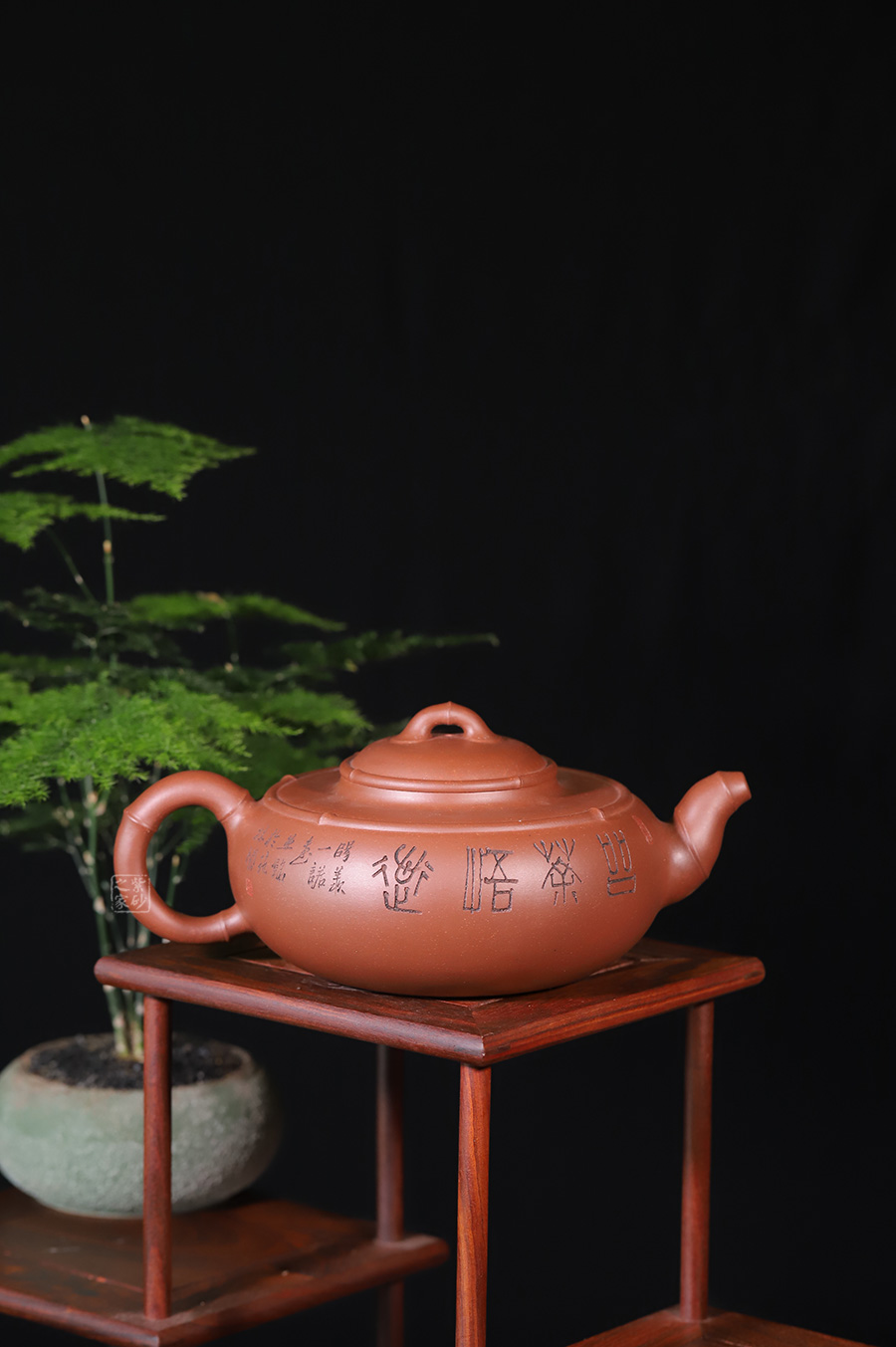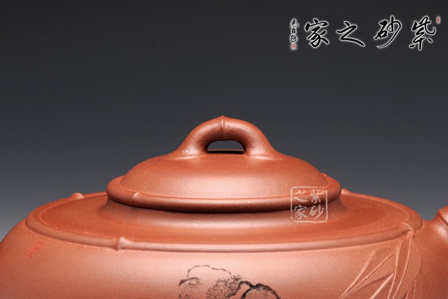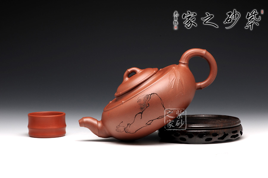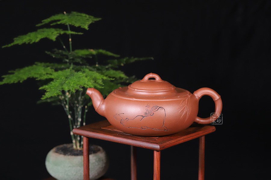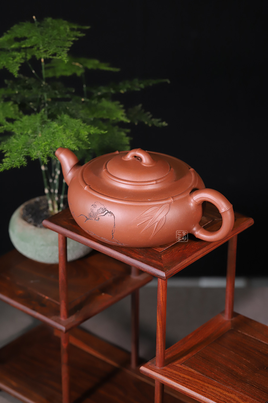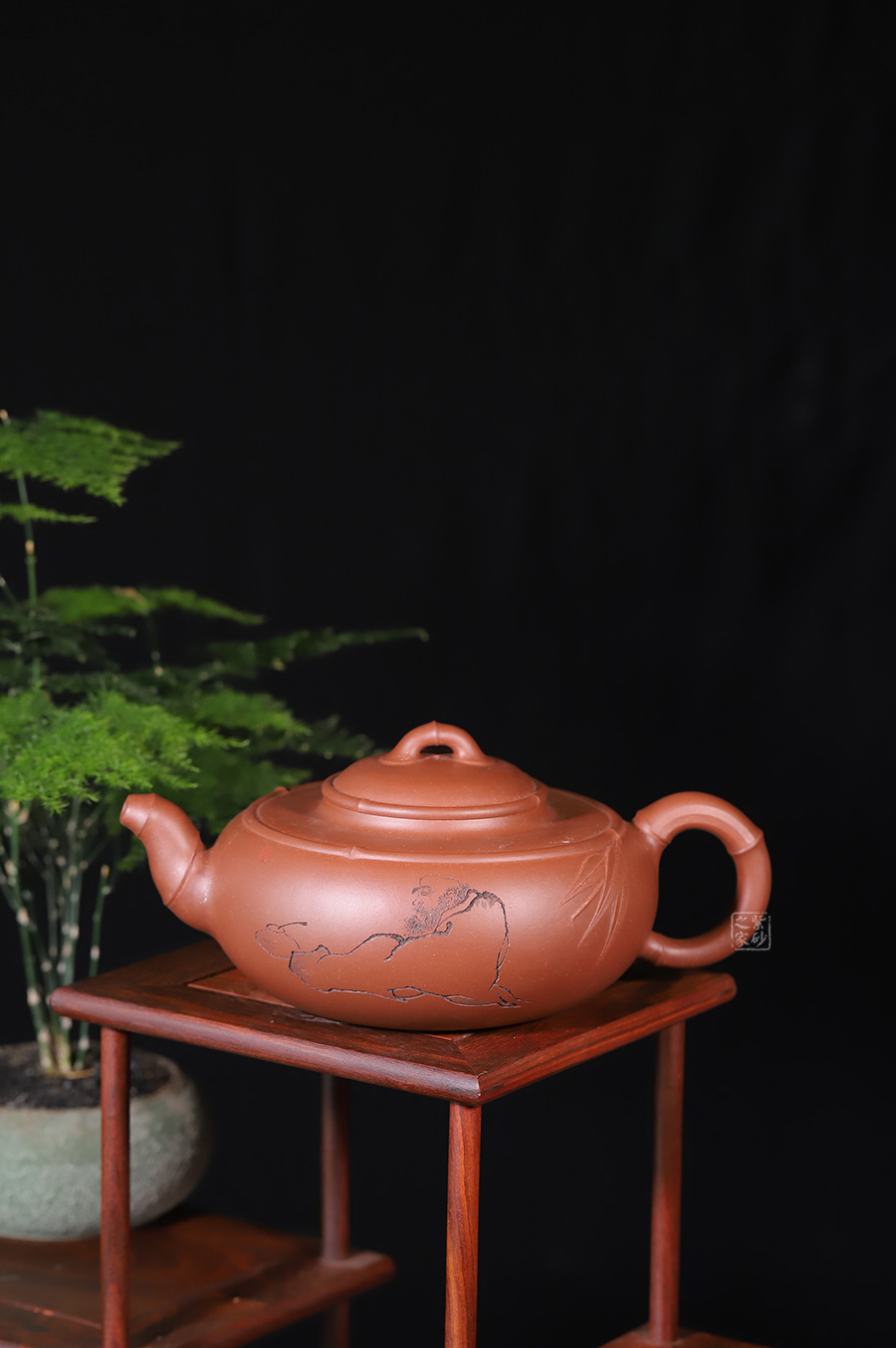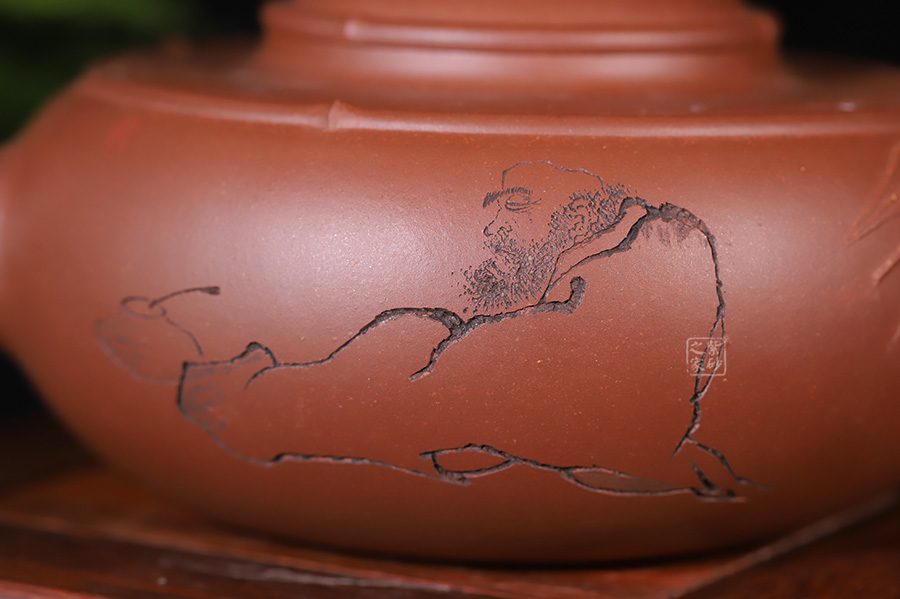 此壺名為禪壺,壺身扁圓,平肩,橋鈕,壺身上所刻的夫子若有所思,此番情景與另一名的詩(shī)詞內(nèi)容互相呼應(yīng)。此壺以竹為素材加以裝飾,壺嘴與壺把處都有竹節(jié)修飾,仿佛把人帶入林間,更顯禪意。此壺為夫妻合制壺,一壺難求,想要收藏的壺友們不能錯(cuò)過(guò)。