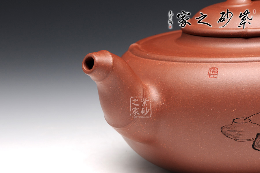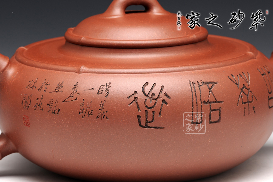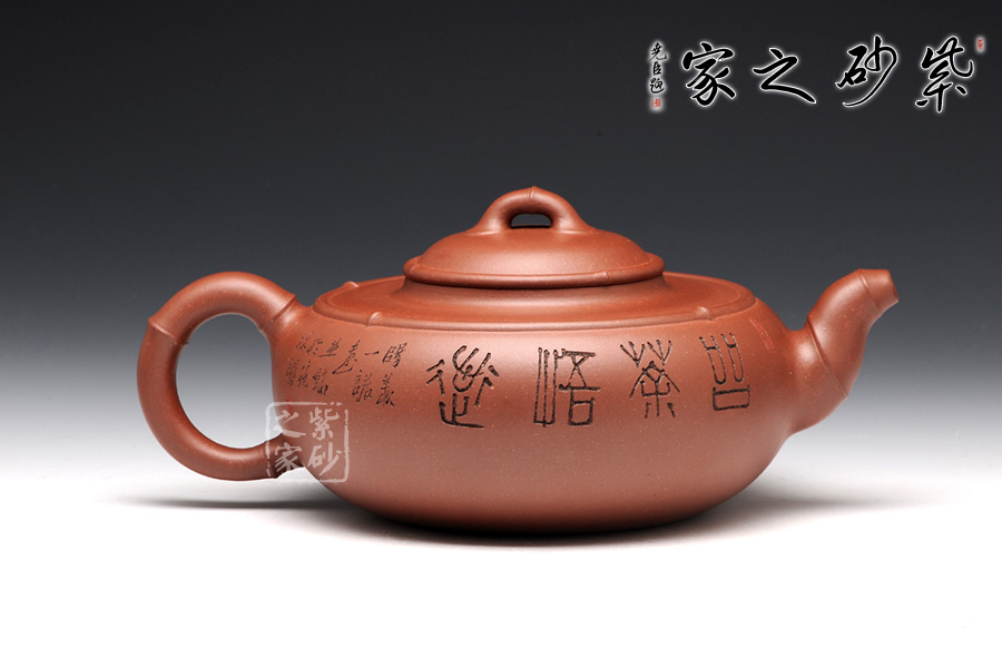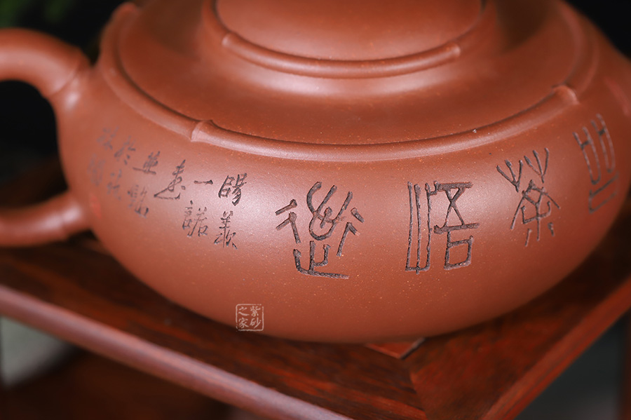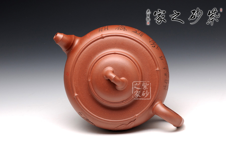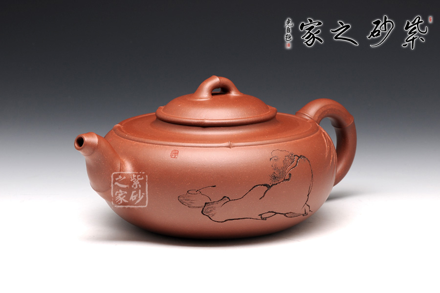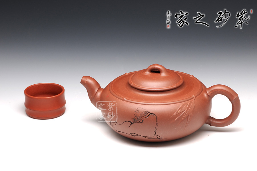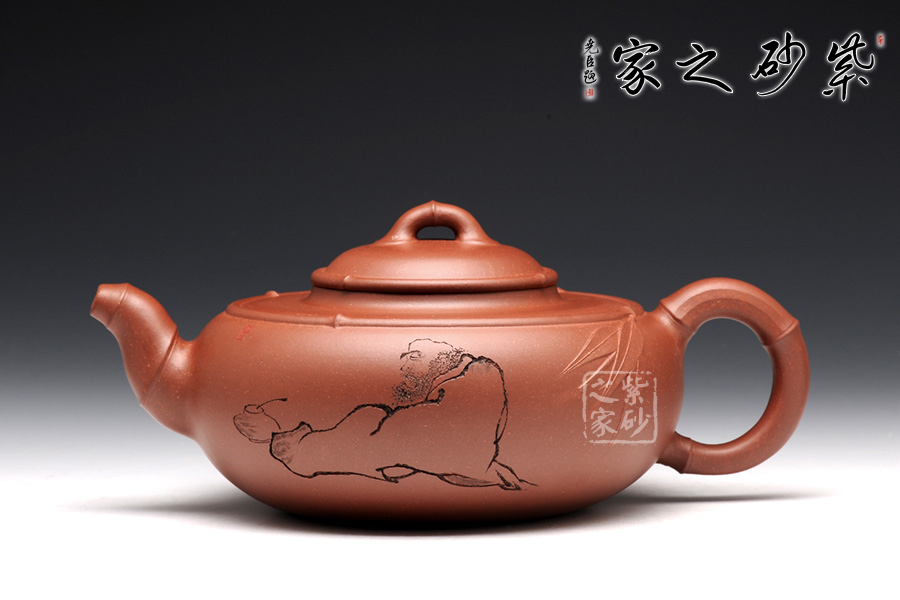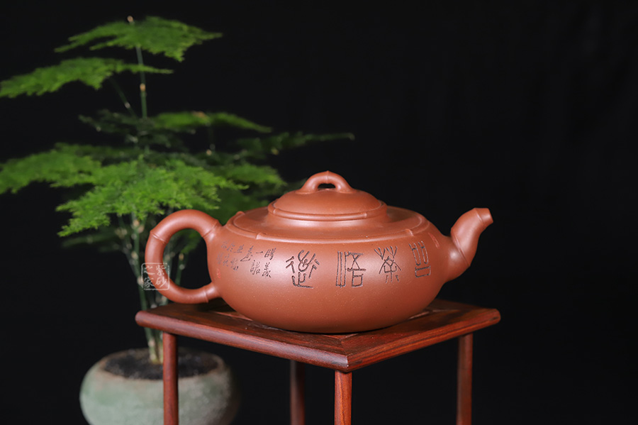 此壺名為禪壺,壺身扁圓,平肩,橋鈕,壺身上所刻的夫子若有所思,此番情景與另一名的詩(shī)詞內(nèi)容互相呼應(yīng)。此壺以竹為素材加以裝飾,壺嘴與壺把處都有竹節(jié)修飾,仿佛把人帶入林間,更顯禪意。此壺為夫妻合制壺,一壺難求,想要收藏的壺友們不能錯(cuò)過(guò)。